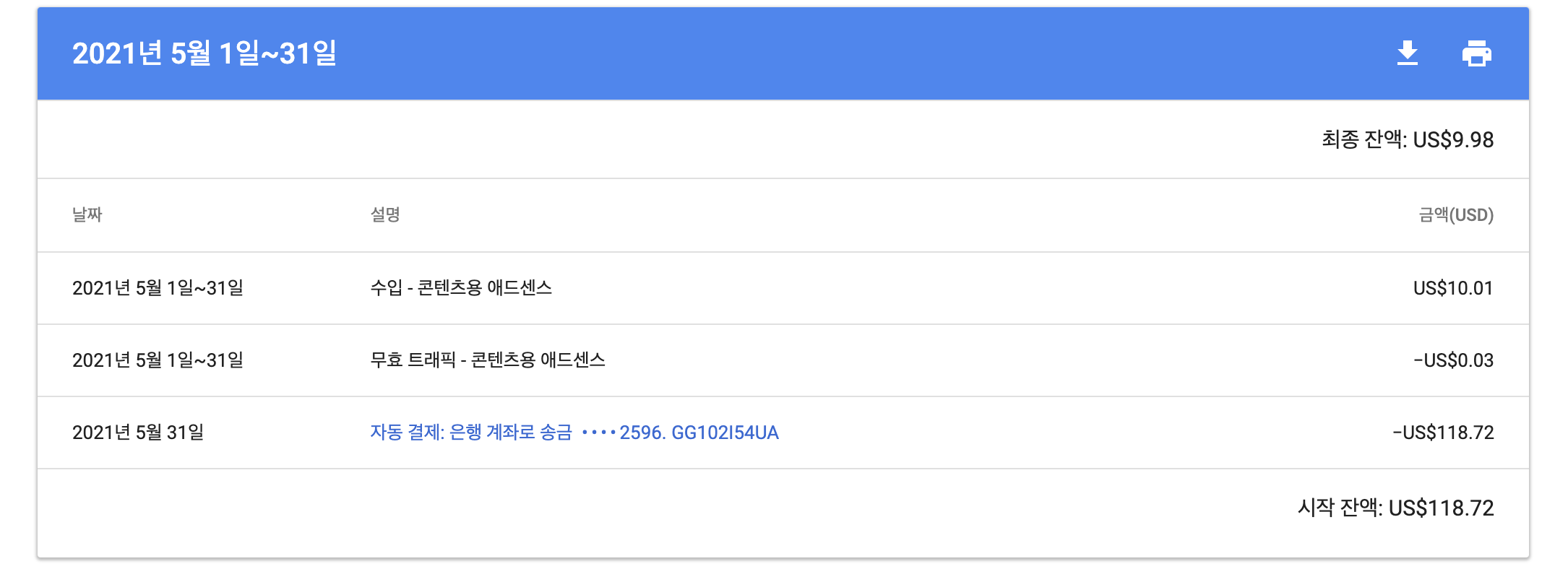 $118.72를 지급 받았네요. 그런데 통장에는 $104.74만 입금이 되었습니다. ㅠㅠ