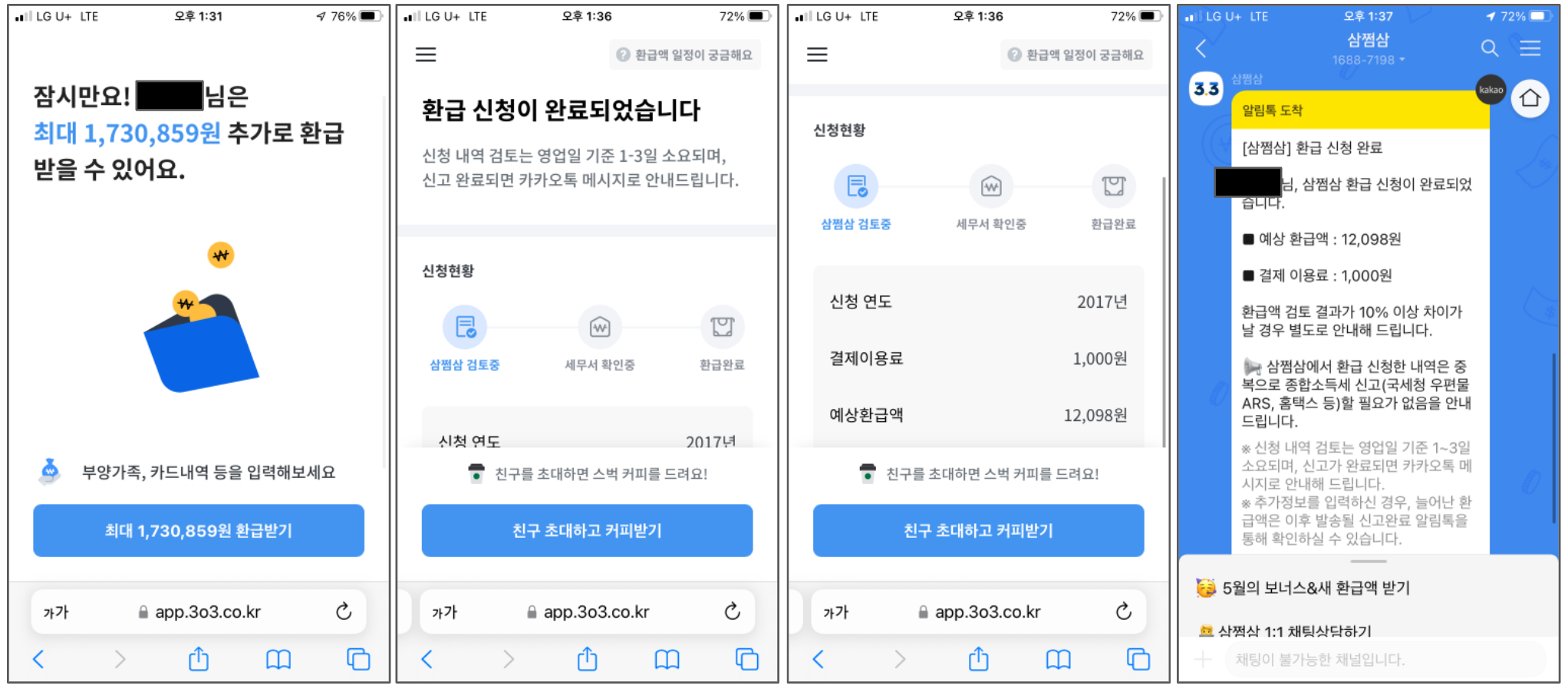체험 후 바로 1,000원 결제해서 환급 신청을 완료했습니다.숨어있던 5년치 세금 돌려 받고 친구와 커피 한 잔!