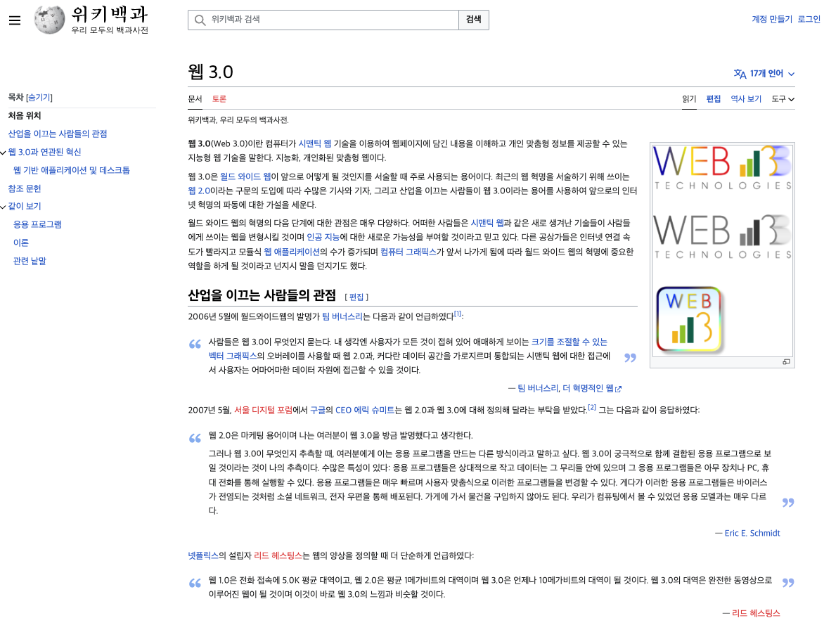 위키에서 웹 3.0은 웹의 아버지, 팀버너스리가 정의한 내용으로 작성되어 있습니다. (그래서... 좀 헷갈리지 않았나 싶긴 합니다. ㅠㅠ)