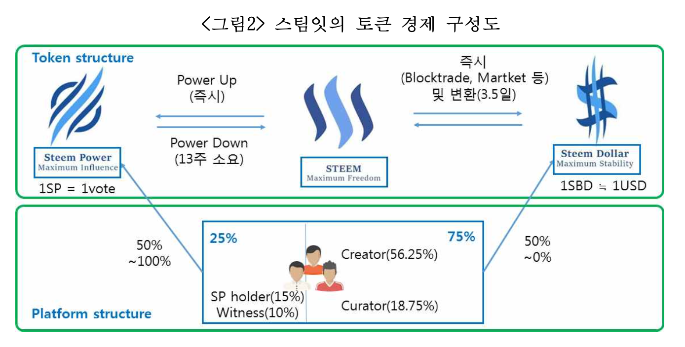 - 토큰(Tokens) - 참여자에 대한 보상 부분을 역할별로 나누고 3가지 토큰을 제공 (스팀(Steem), 스팀파워(Steem Power, SP), 스팀달러(Steem Dollar, SBD))