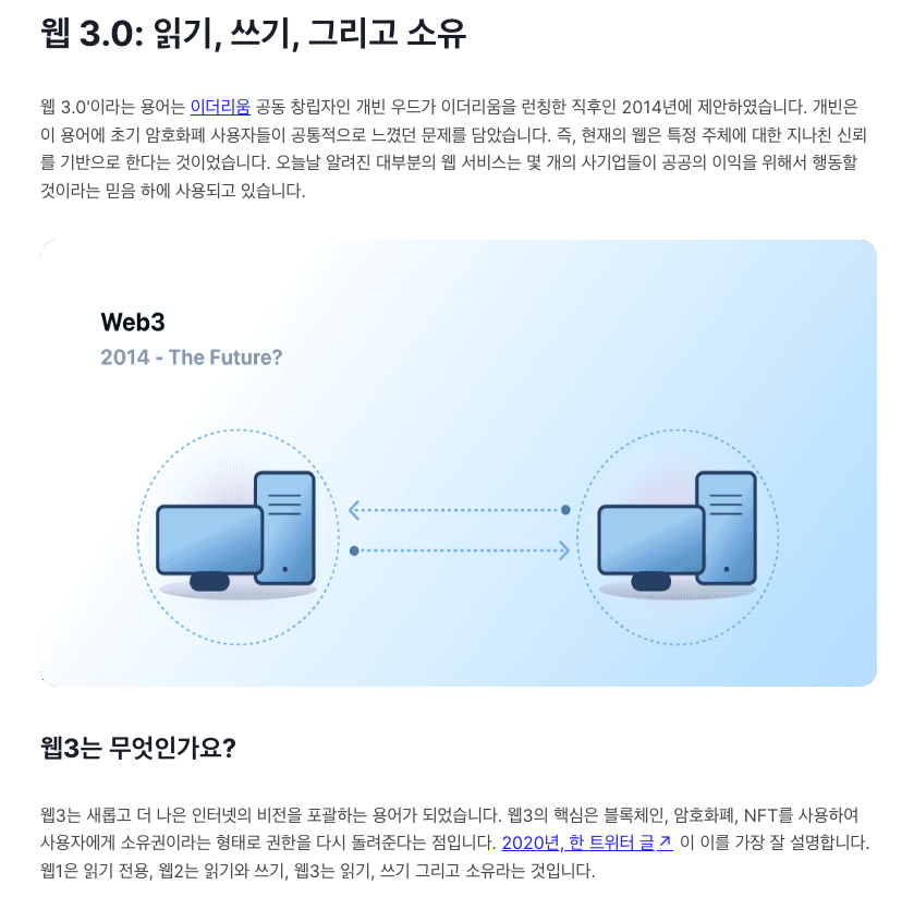 웹 3.0 (Web 3.0) 설명 그래서 저는 이제 웹 3.0에 대한 정의를 읽기, 쓰기, 소유 개념이 포함된 정의로 이해하려고 합니다. 지금(2023년 시대)에는 이더리움 재단의 정의가 조금 더 적절하지 않나 생각이 듭니다. 참고로 이더리움 재단 사이사이트에 올라온 웹 1.0, 웹 2.0에 대해서도 같이 살펴보겠습니다.