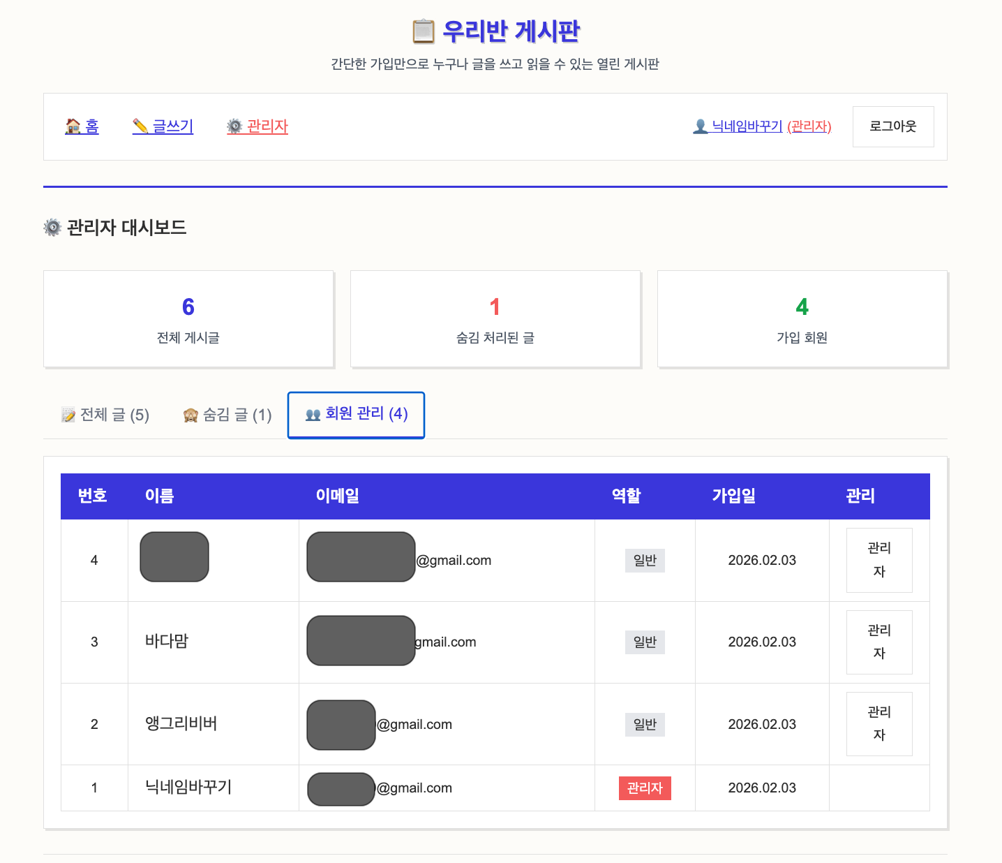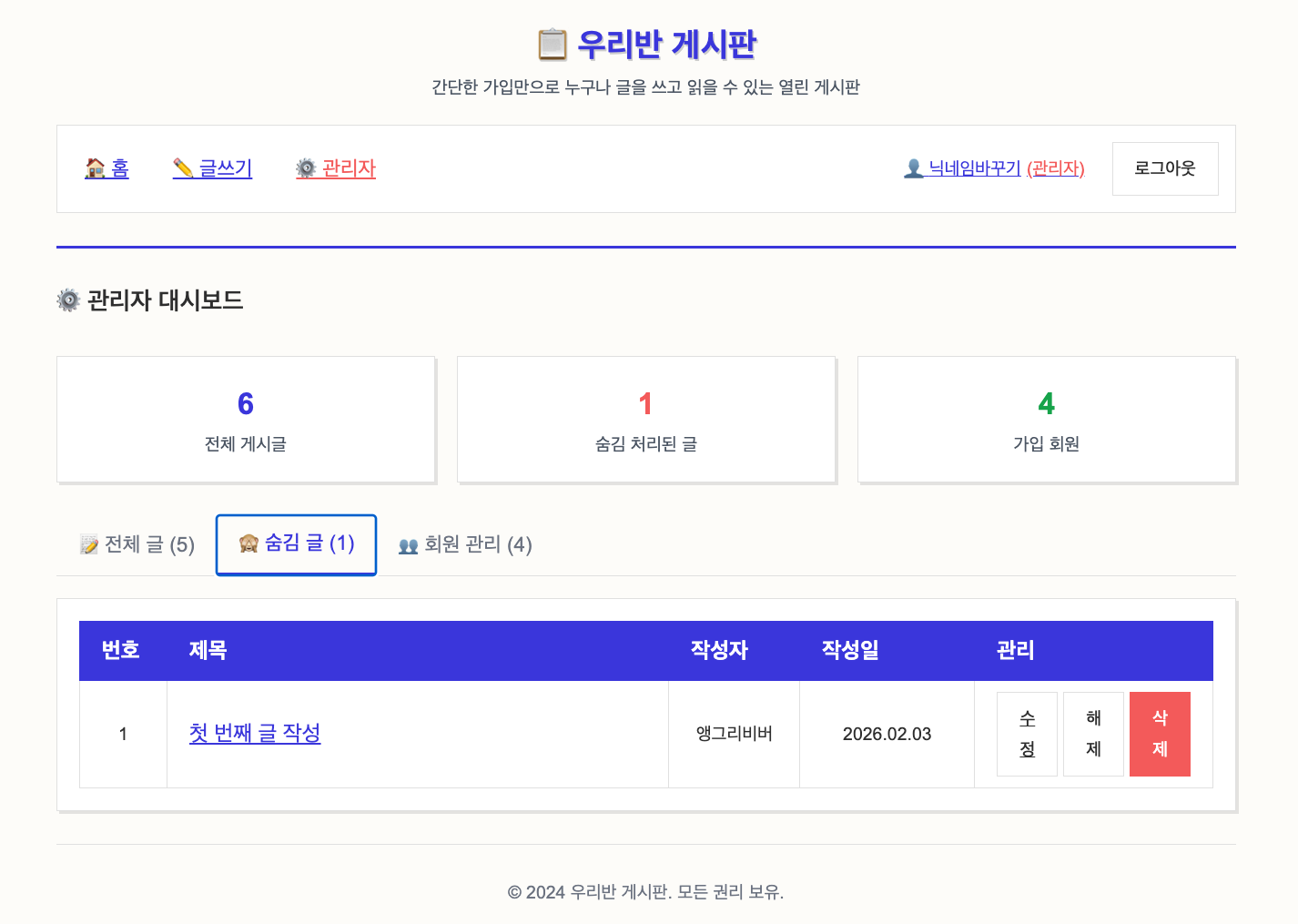 지난 게시판 웹서비스 만들기 - 사용자 프로필 기능 및 Display 명 수정 기능에 이어서 이번에는 관리 기능을 조금 더 확장해 본 경험에 대하여 포스팅합니다. 아예 관리자 페이지를 만들었습니다.