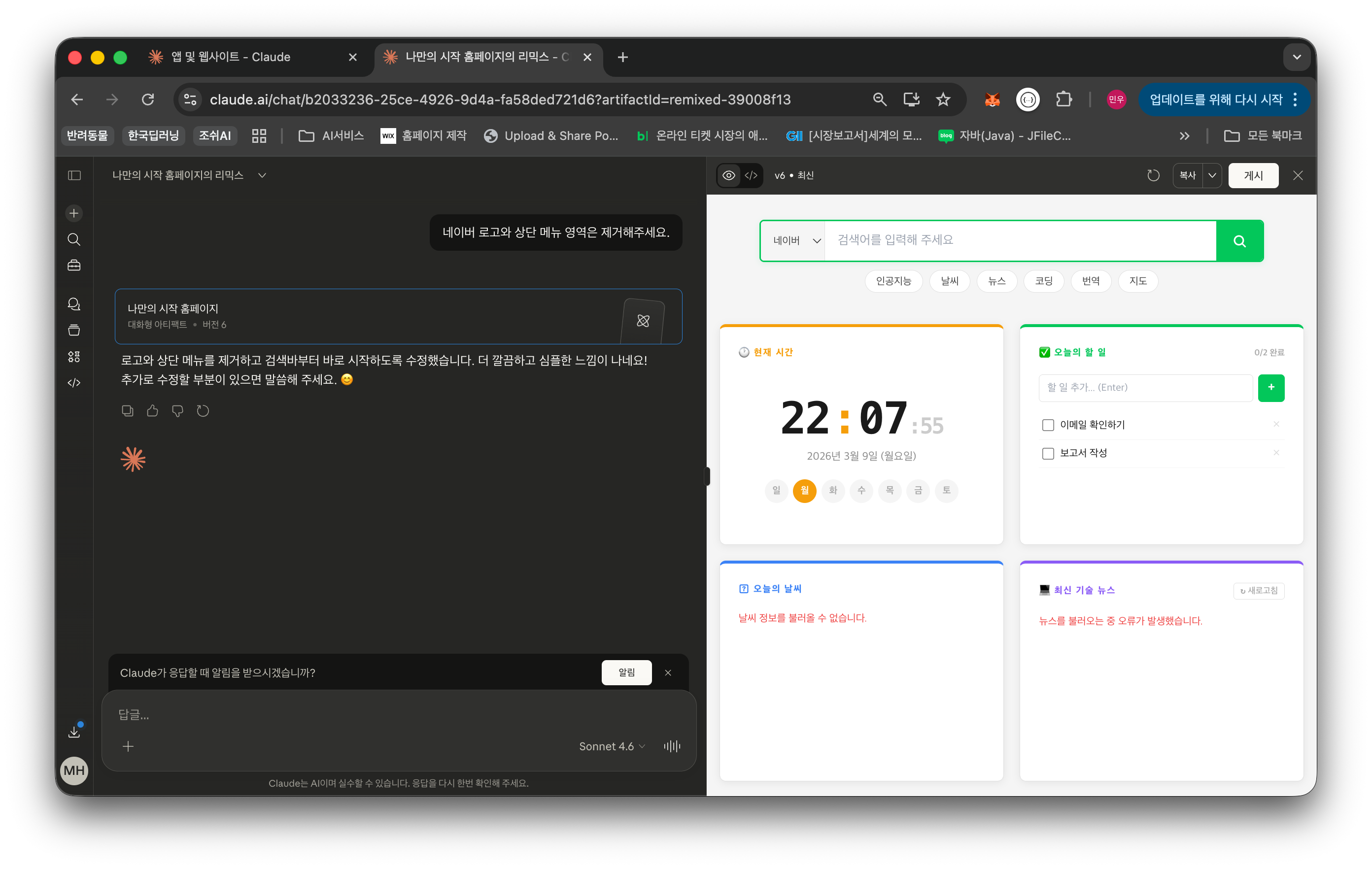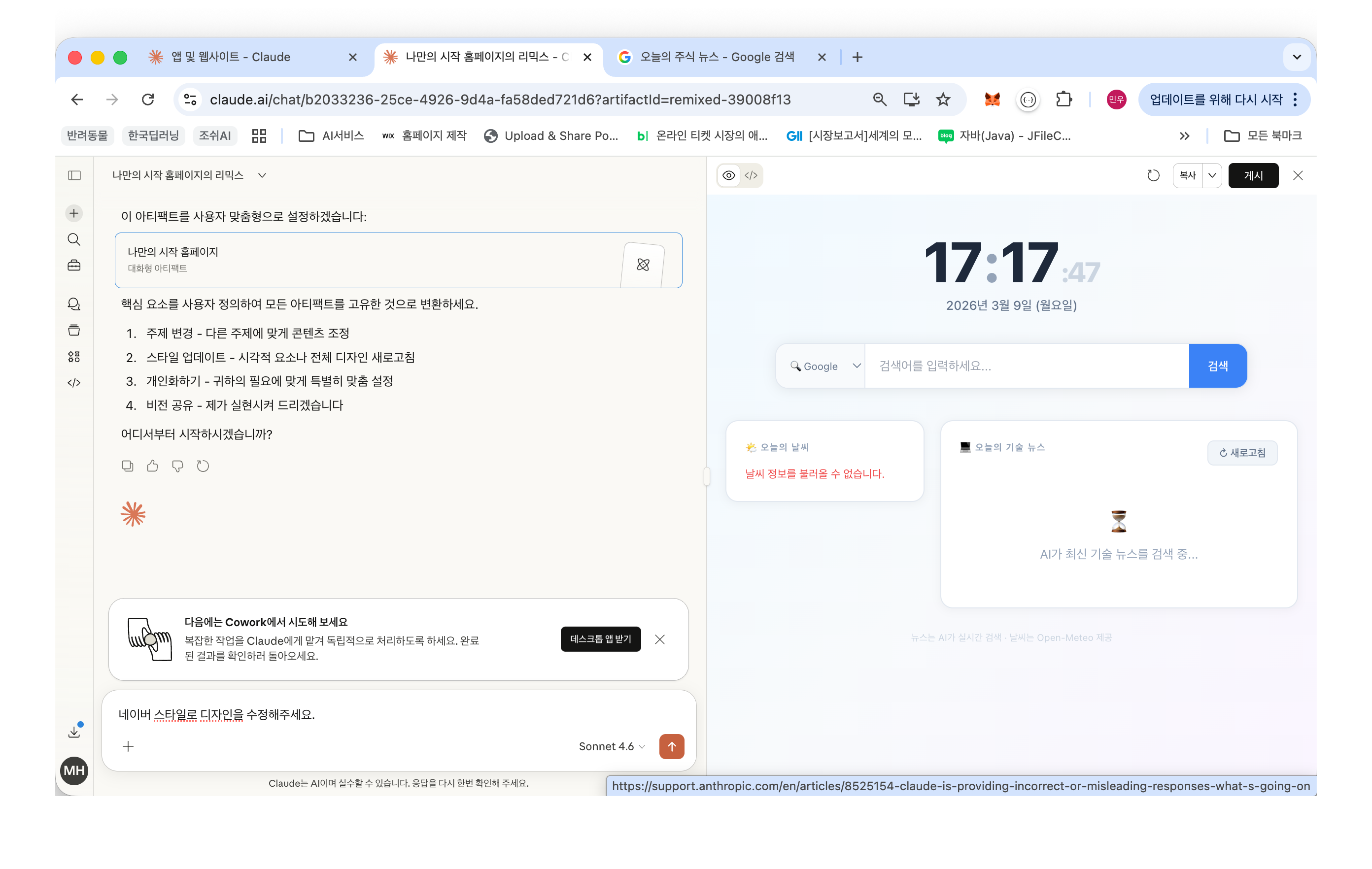 클로드를 이용해 나만의 시작 페이지를 만드는 여정입니다. 책에서는 구글 스타일로 적용하라고 권했지만, 저는 좀 더 친숙한 '네이버 스타일'로 바꿔보고 싶었어요. 그래서 클로드에게 대뜸 네이버 스타일로 디자인을 수정해주세요라고 요청했습니다. "설마 이것까지 될까?" 했는데, 정말 놀랍게도 클로드가 제 의도를 정확히 파악하더라고요!