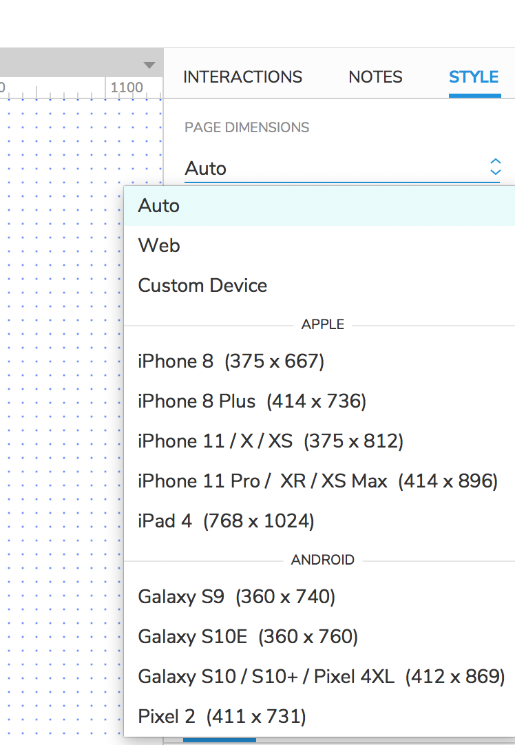 우측 상단의 STYLE의 PAGE DIMENSIONS을 설정하여 기본 페이지를 변경할 수 있습니다. 기본적으로 Web / 모바일 (아이폰 / 갤럭시) / 태블릿에서 많이 사용하는 페이지의 사이즈를 설정할 수 있습니다.