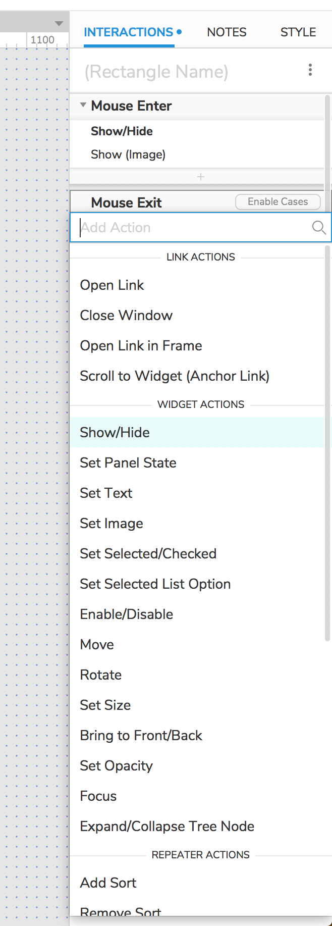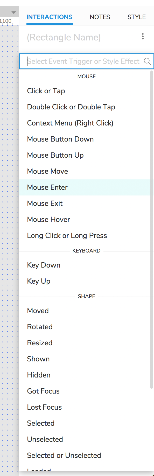 <Rectangle에 마우스 Enter / 마우스 Exit 기능> INTERACTIONS - Event Trigger로 Mouse Enter를 선택합니다.