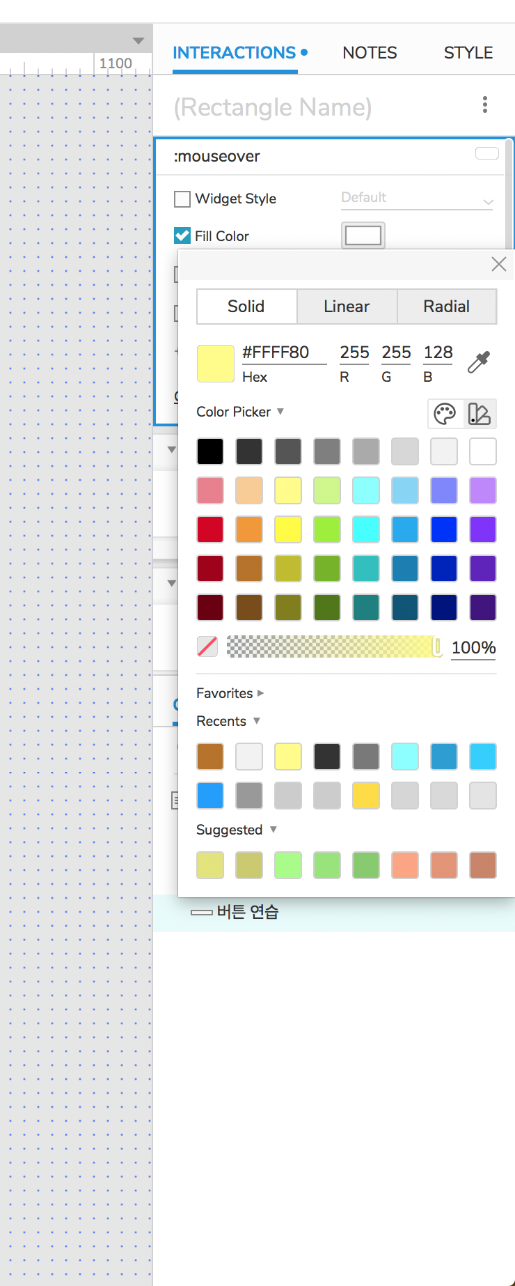 '버튼 연습' Rectangle 안에 마우스를 오버(Over)해 봅니다.