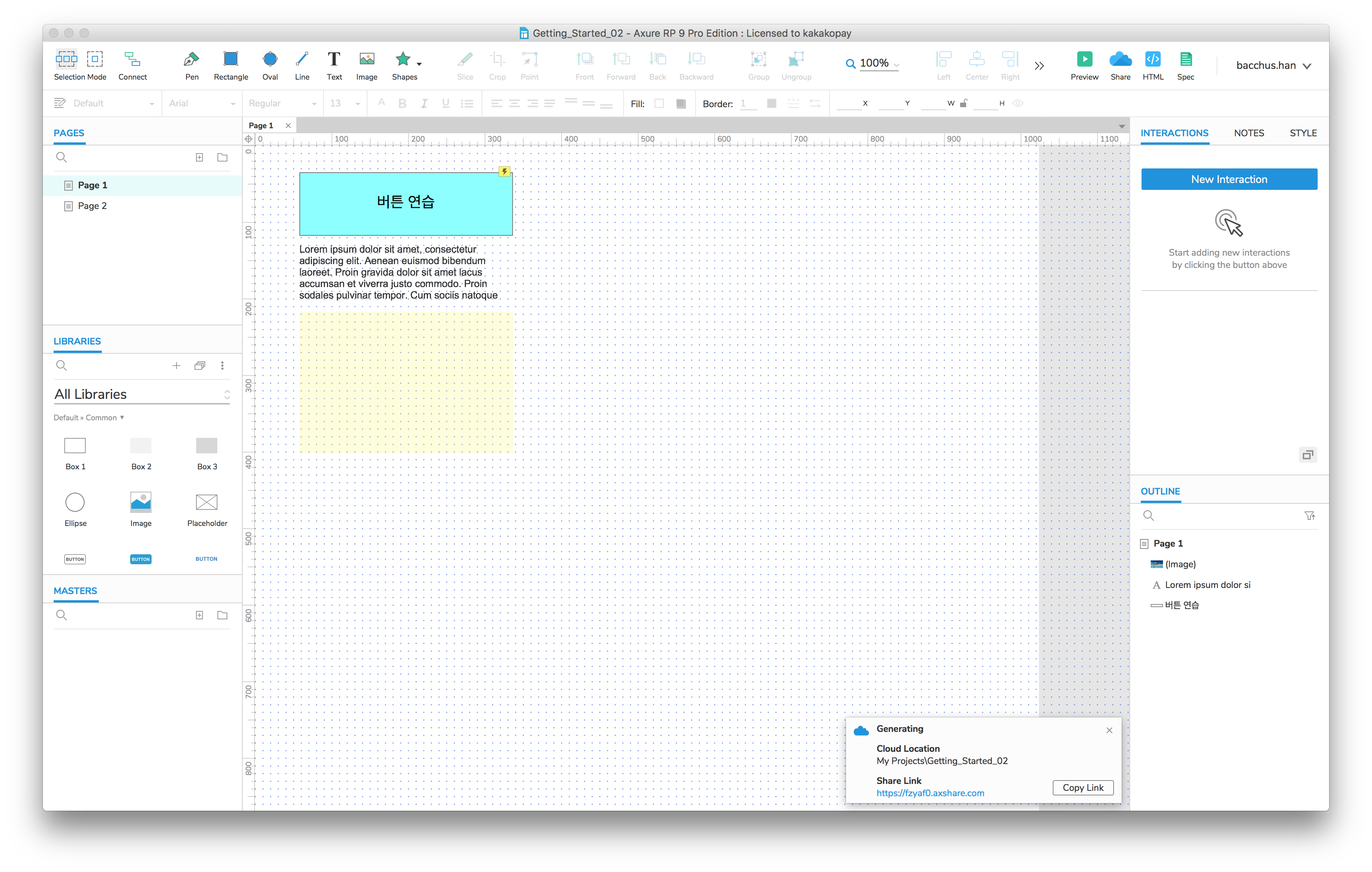 <Share - Publish - Share Link> 지금까지 Axure의 기본적인 사용 방법을 알아보았습니다. 다음에는 조금 더 유용한 Interaction을 추가해보겠습니다.