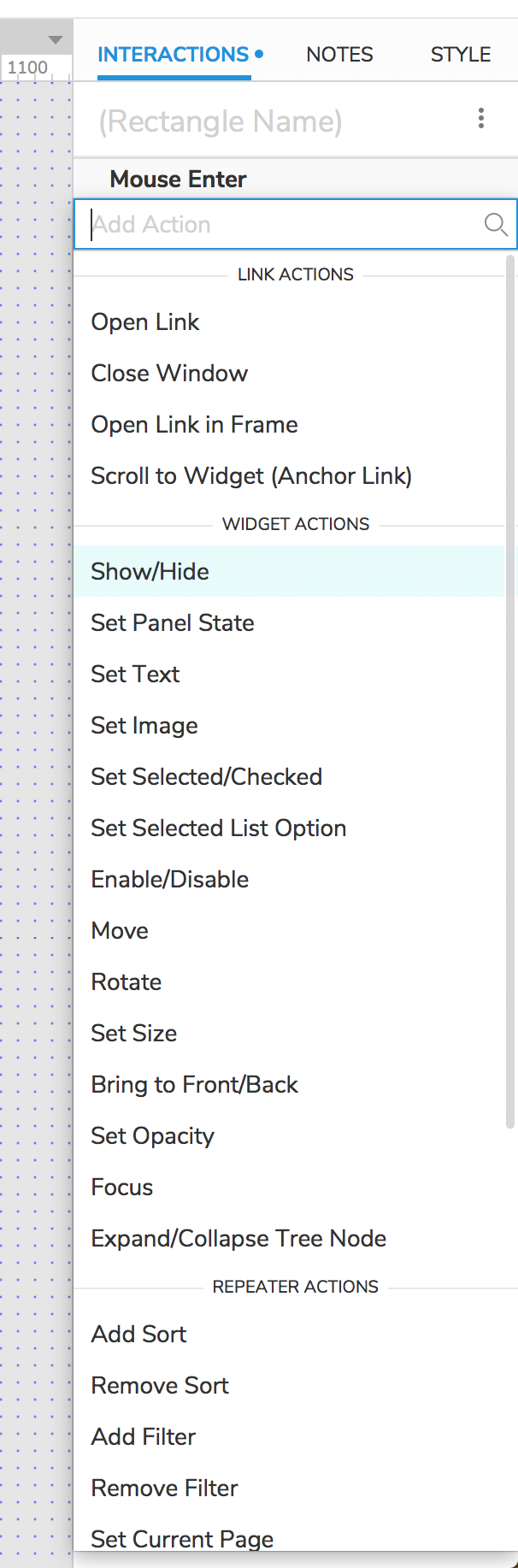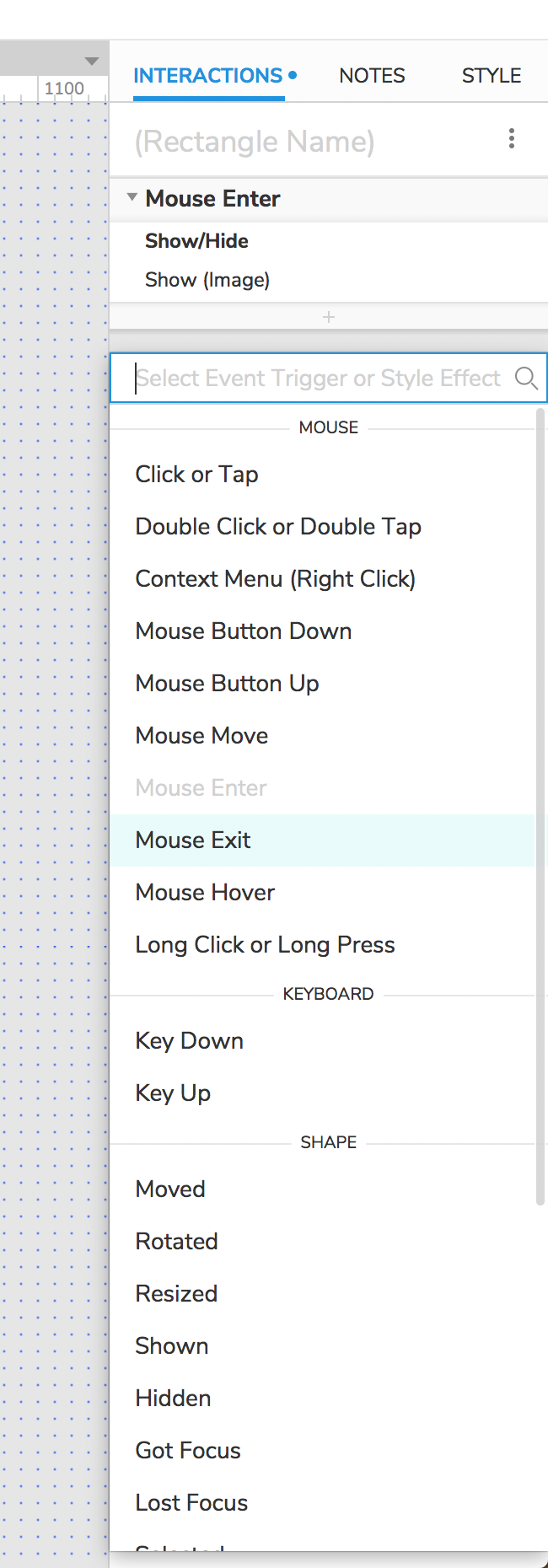 Rectangle을 선택한 후에 INTERACTIONS를 클릭합니다.