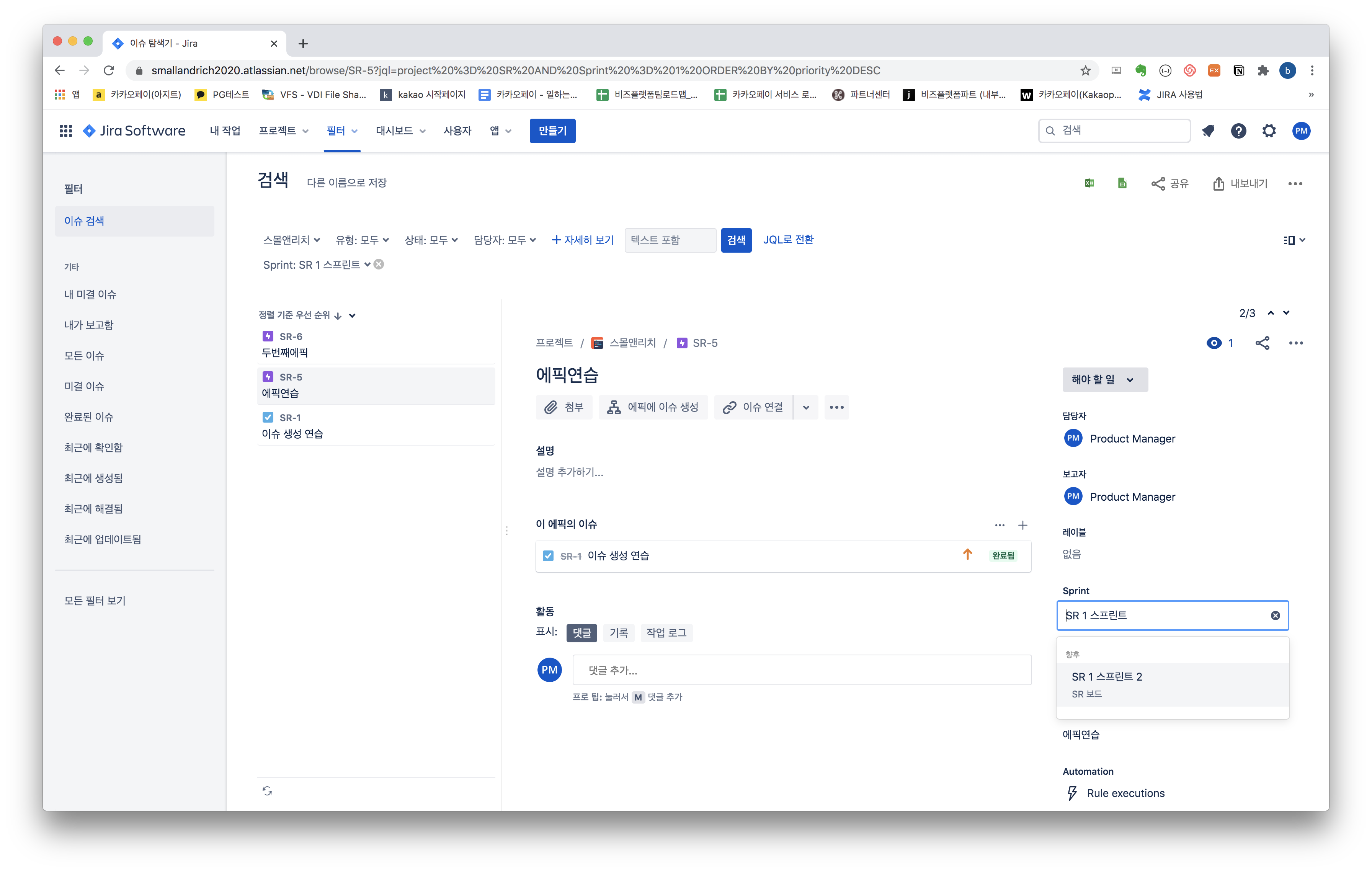 스프린트 1의 이슈를 드래그하여 스프린트 2로 이동합니다. 실제로 해당 이슈의 상세보기를 보면 스프린트가 변경되어 있는 것을 볼 수 있습니다.