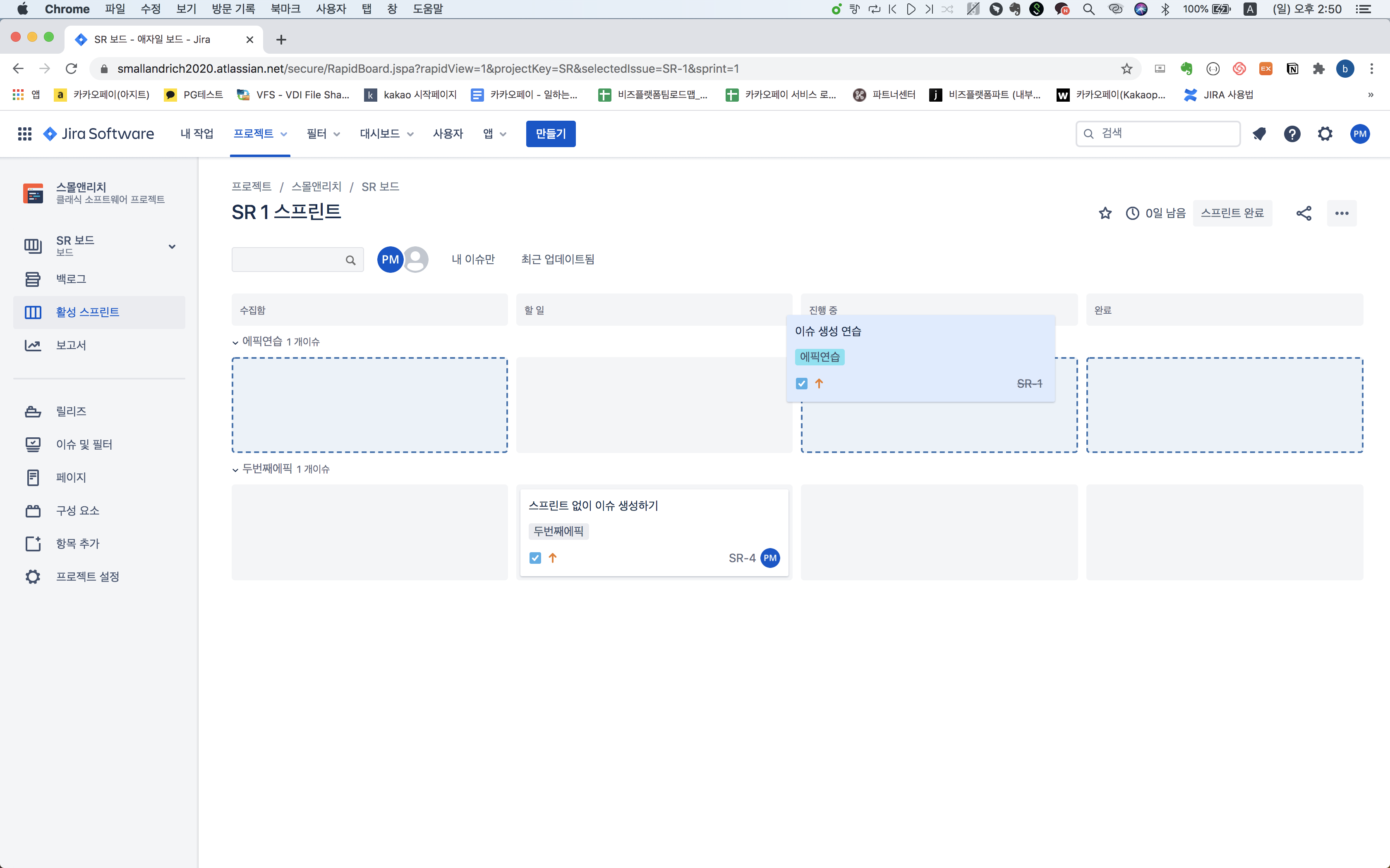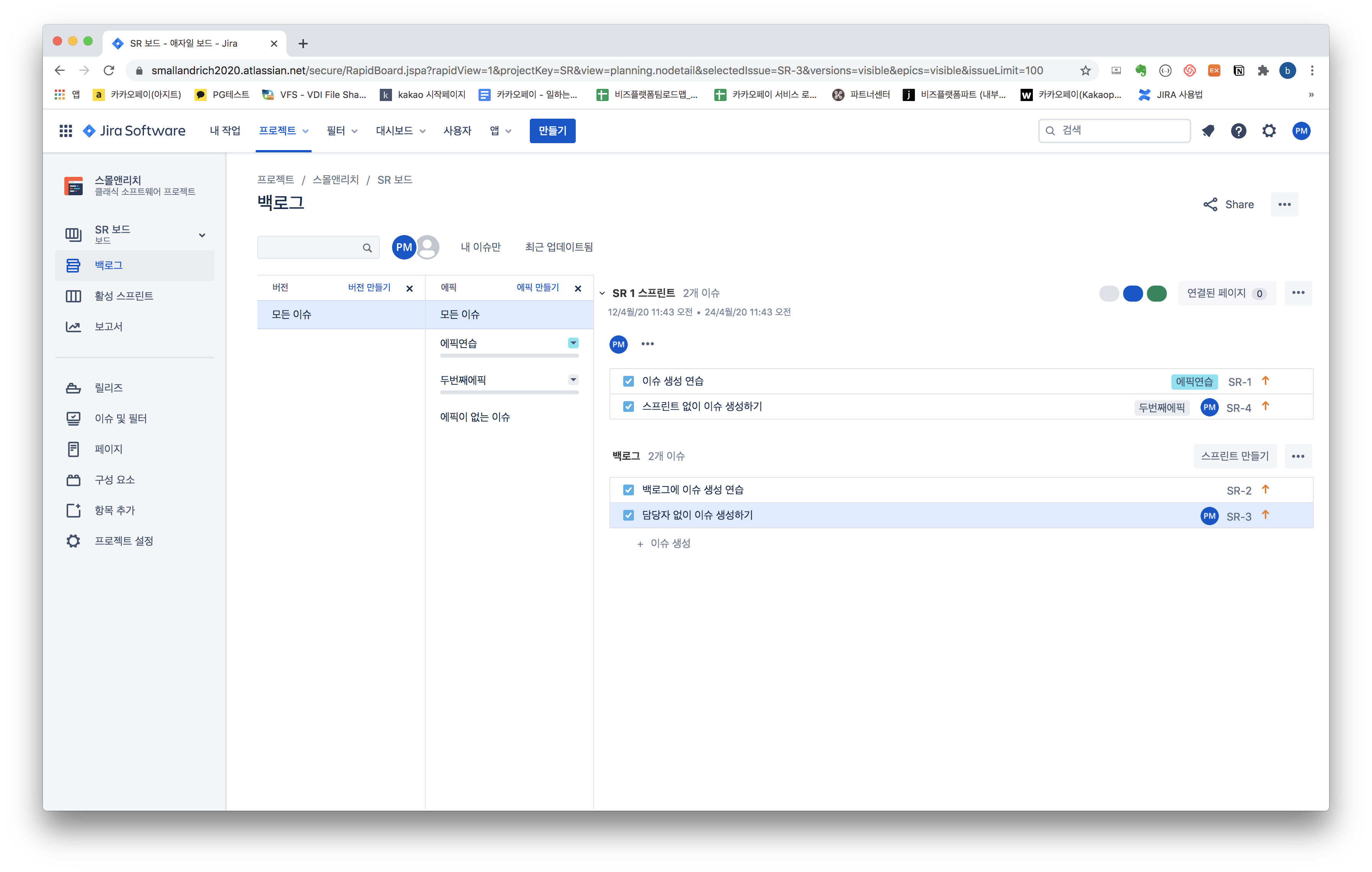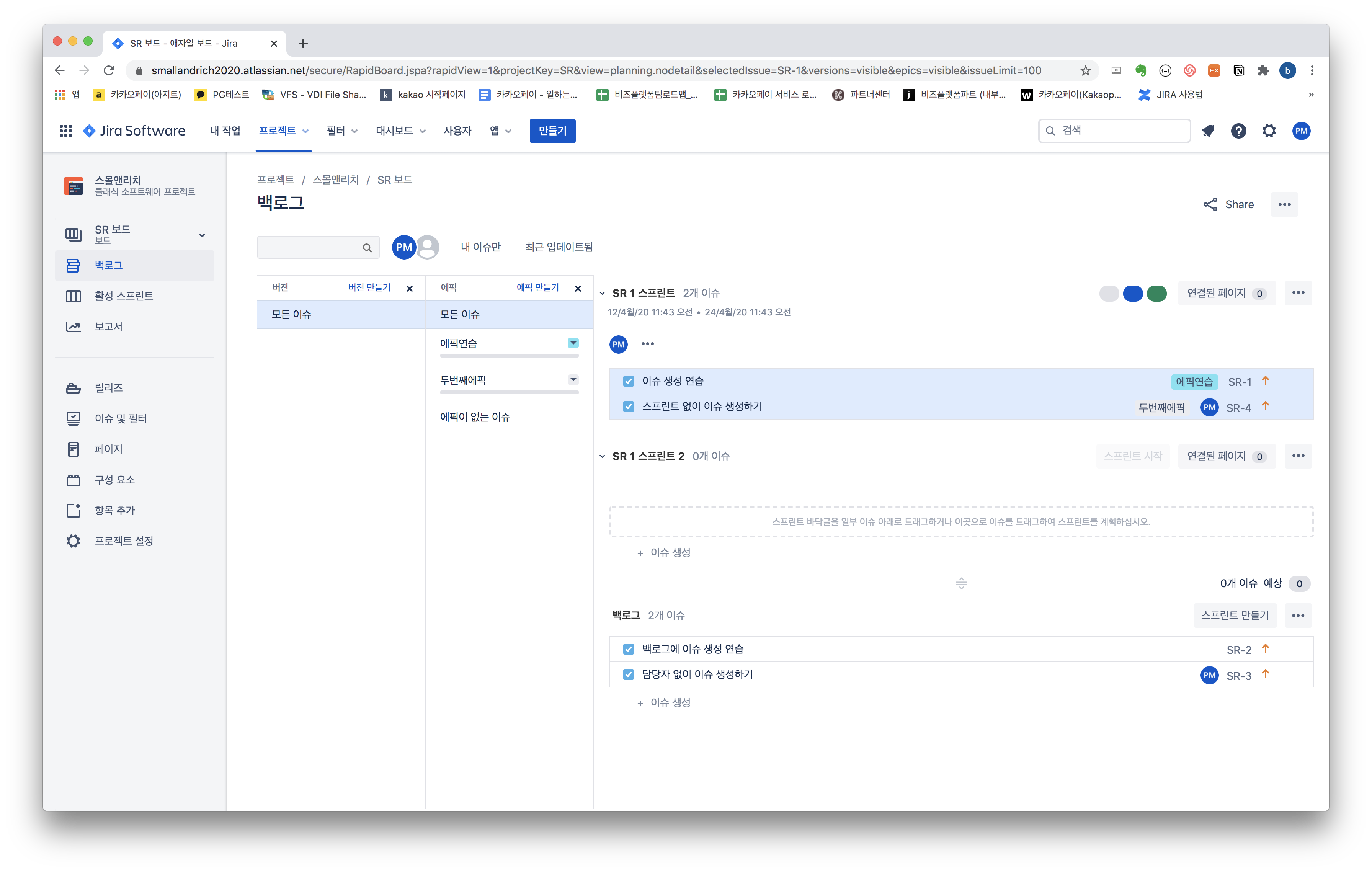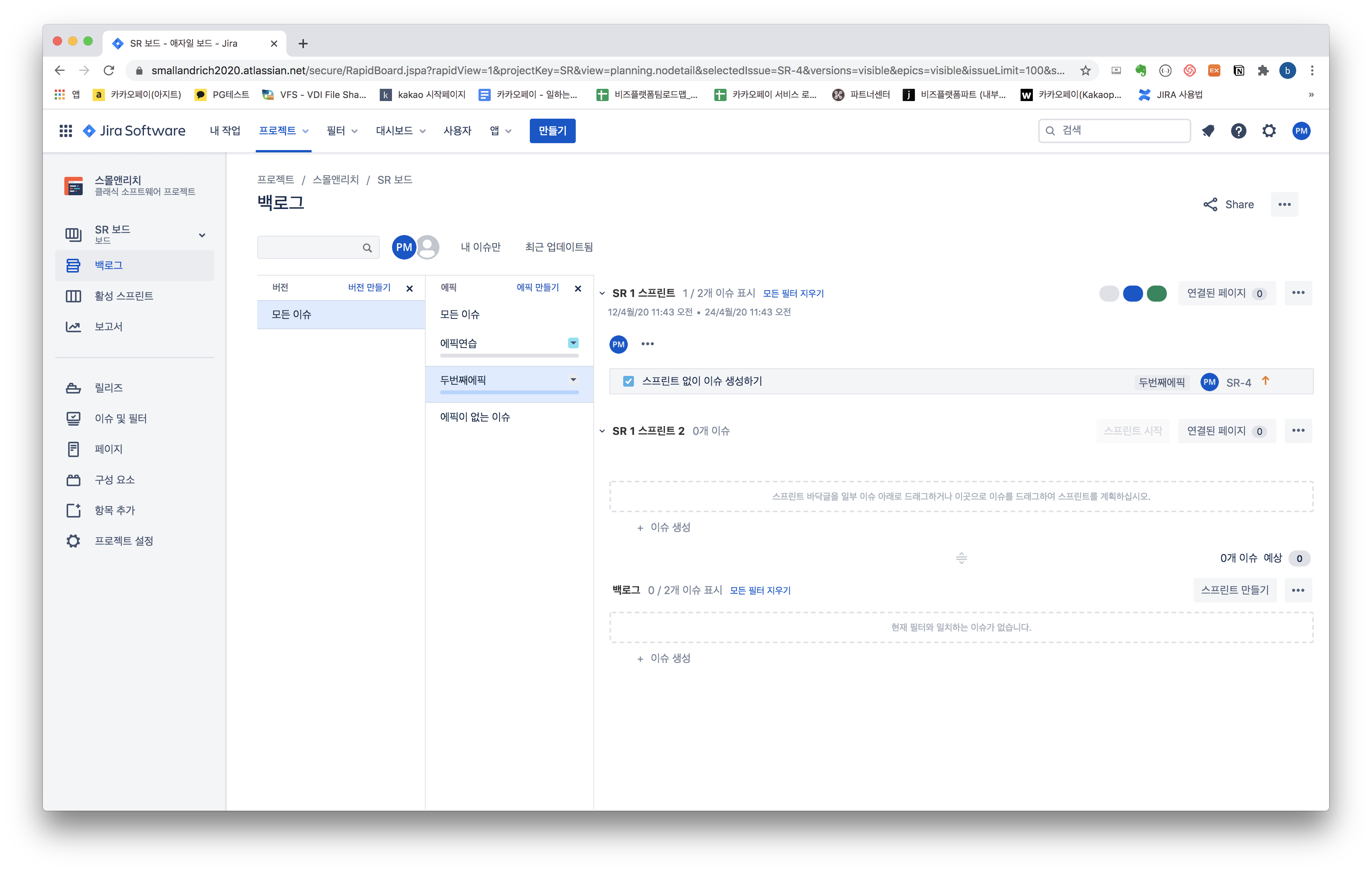 "스프린트 만들기" 버튼을 클릭합니다. 프로젝트 + 스프린트2가 바로 생성되네요. 너무 쉽죠? ㅎㅎ