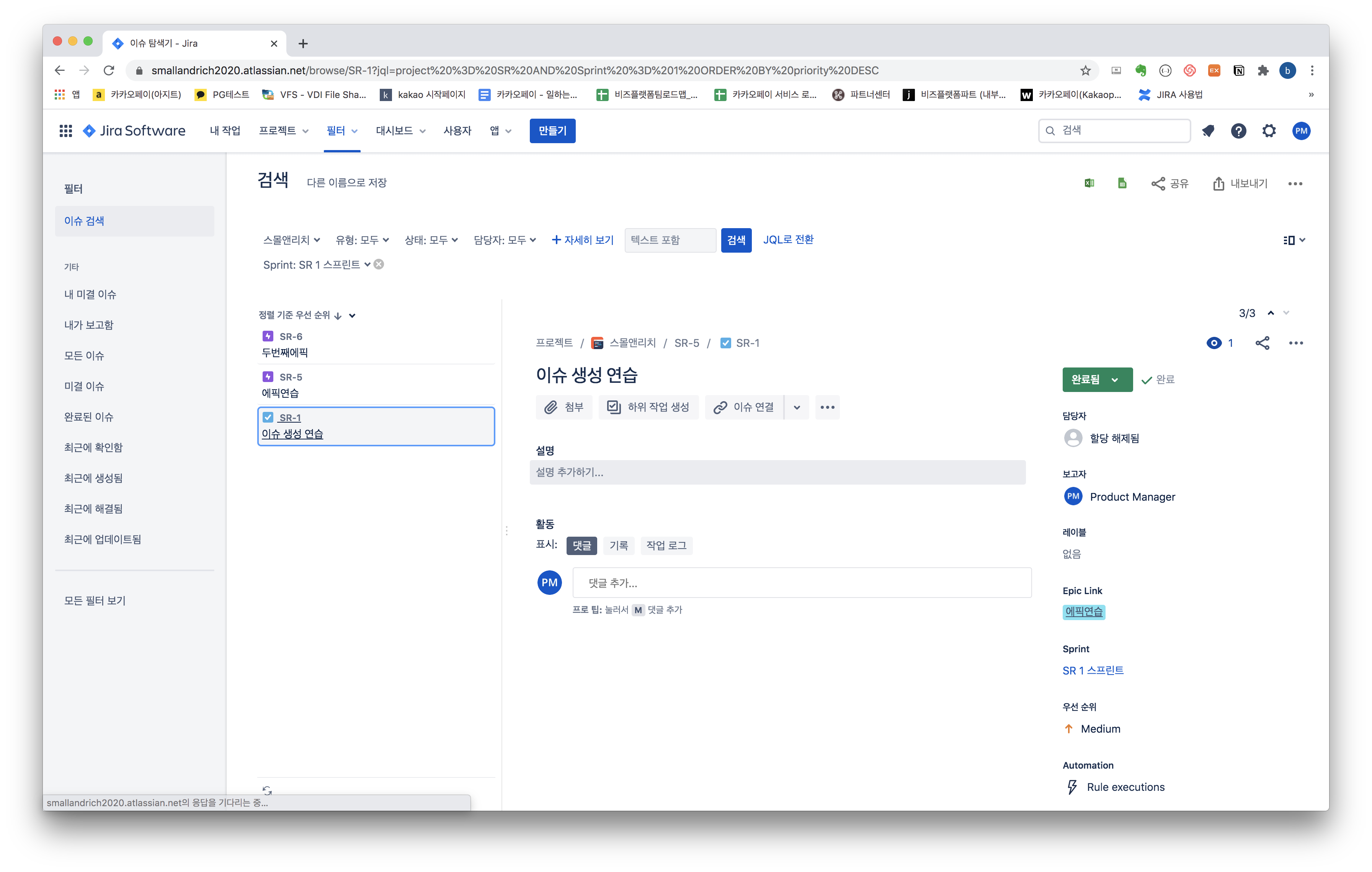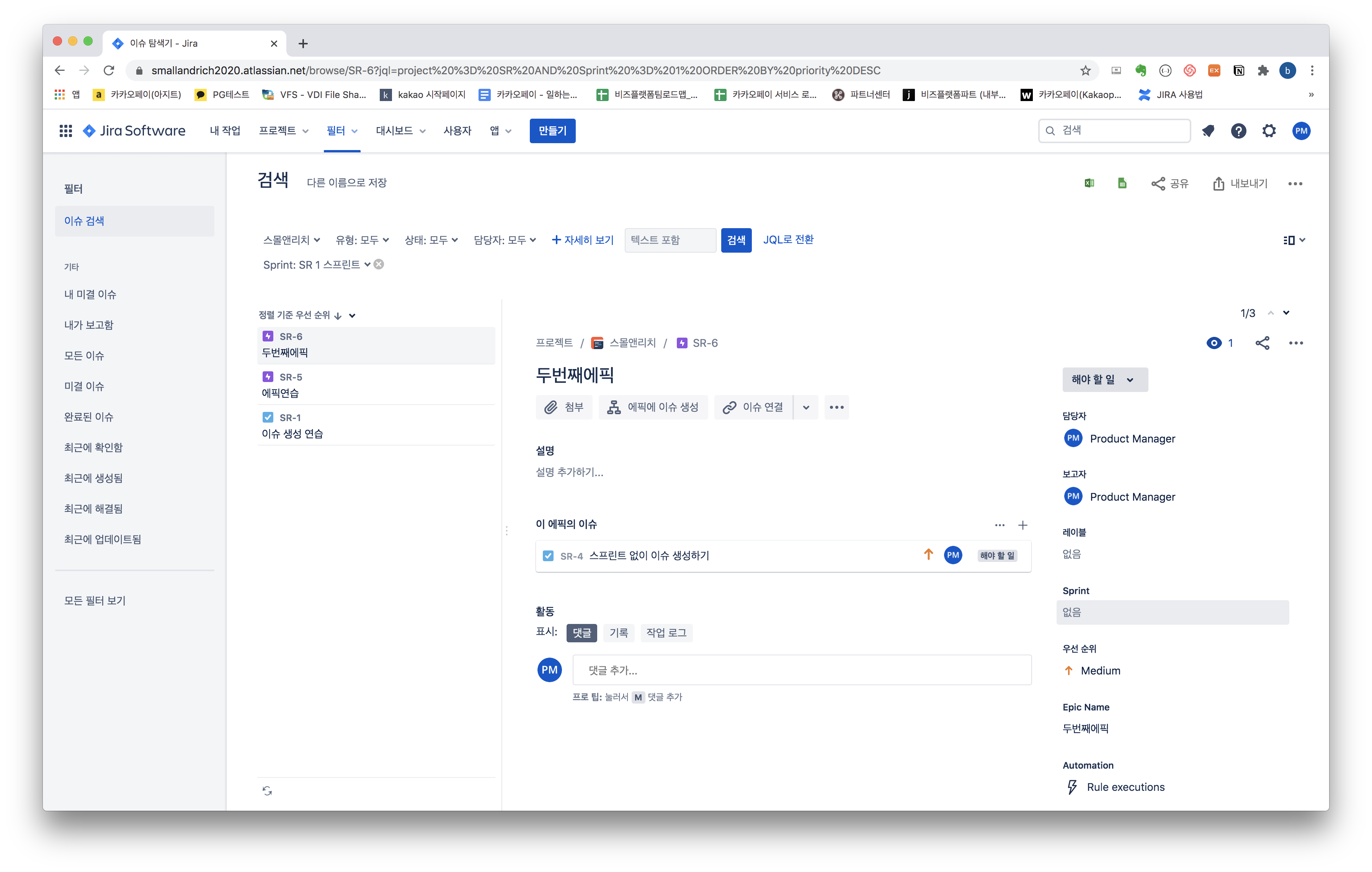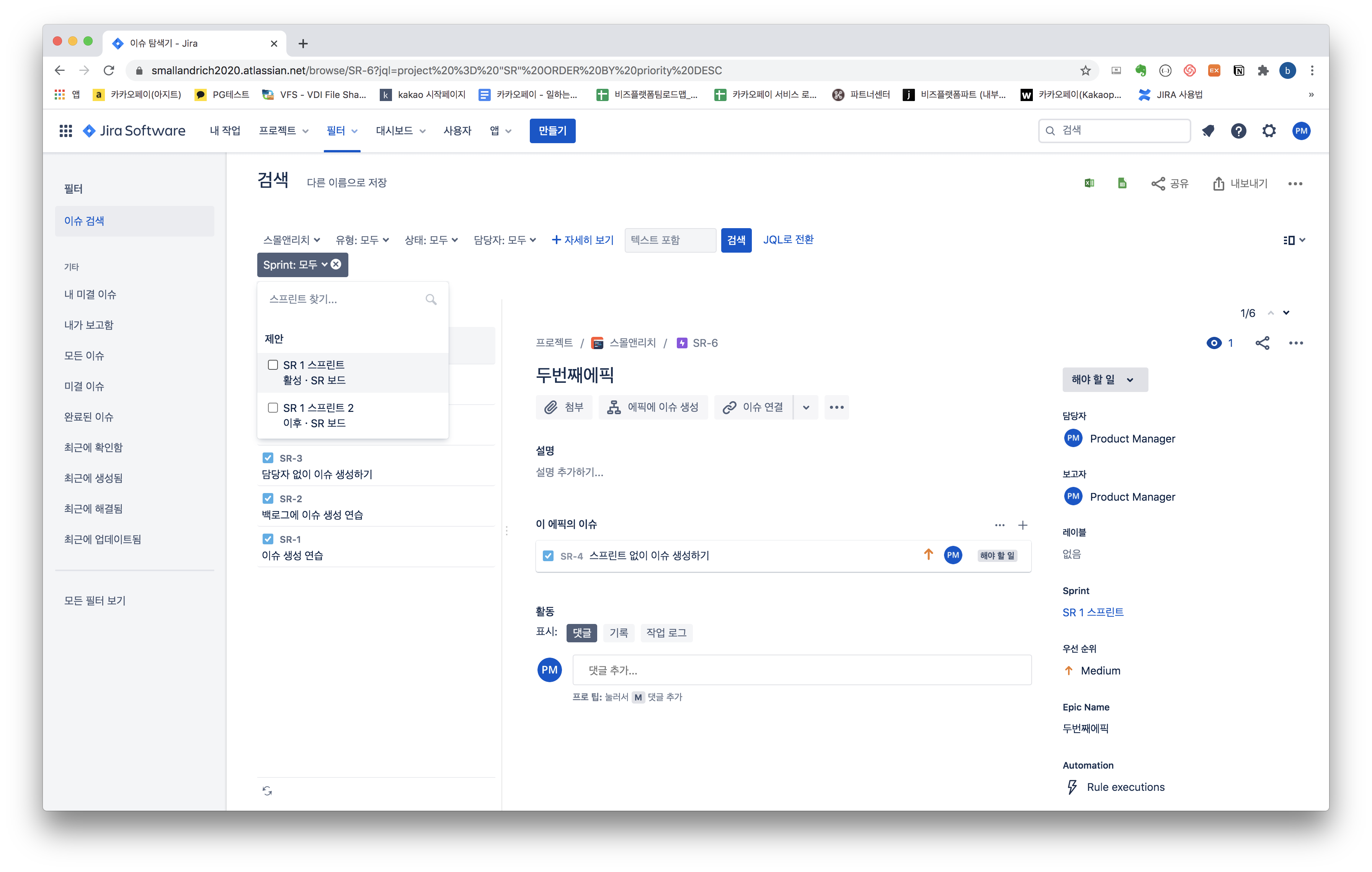 처음에는 이때부터 약간 헷갈릴 수가 있는데요. 사용자가 많아지면 이러한 일들이 항상 발생합니다. 그래서 지라를 관리하는 PM이나 스크럼마스터가 보이지 않는 이슈 들을 잘 찾아서 누락된 값이 있다면 해당 값을 채우고 불필요한 값이 있다면 적절하게 제거해서 지라 보드를 항상 최신화하는 것이 중요할 것 같습니다.