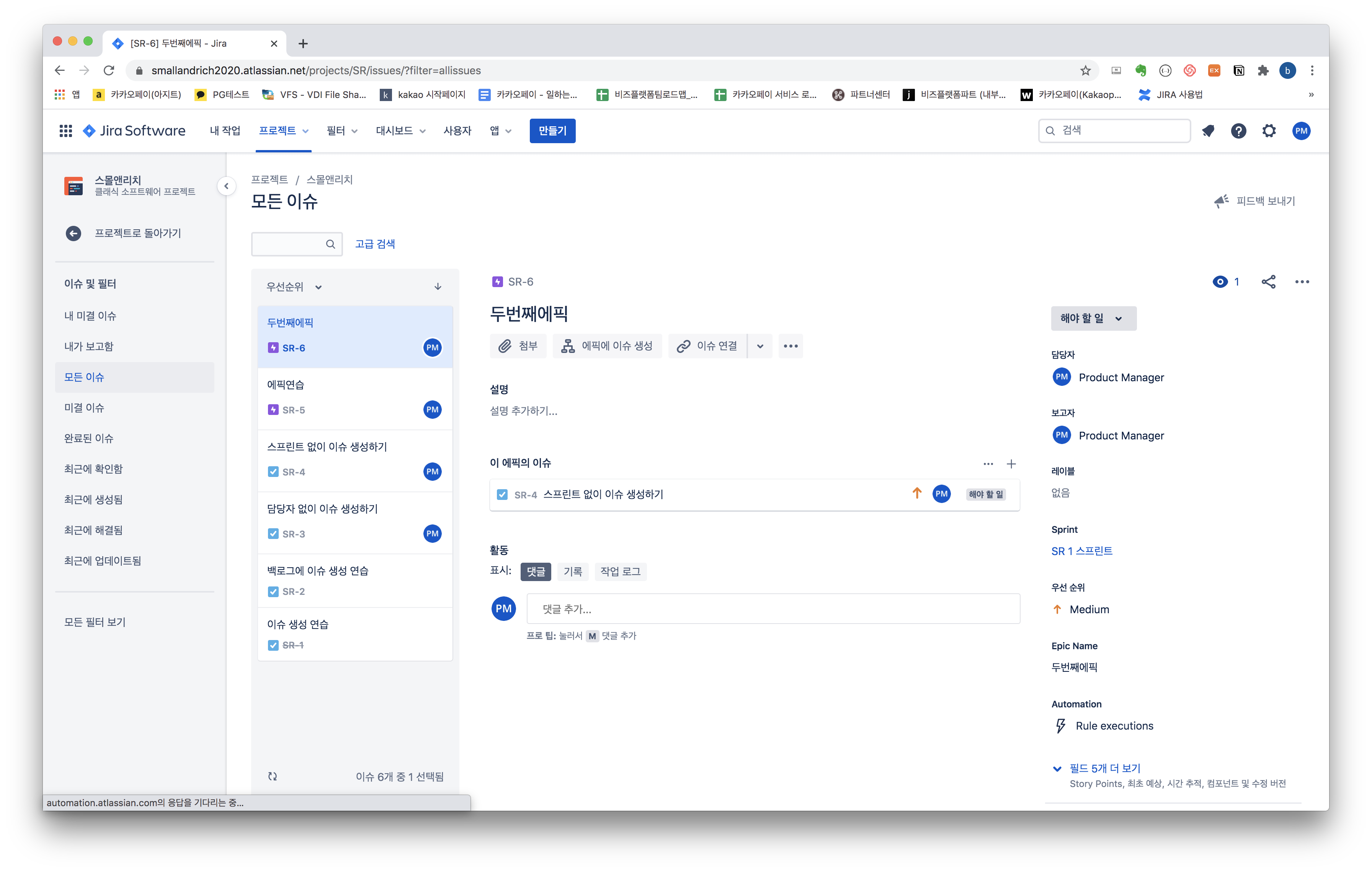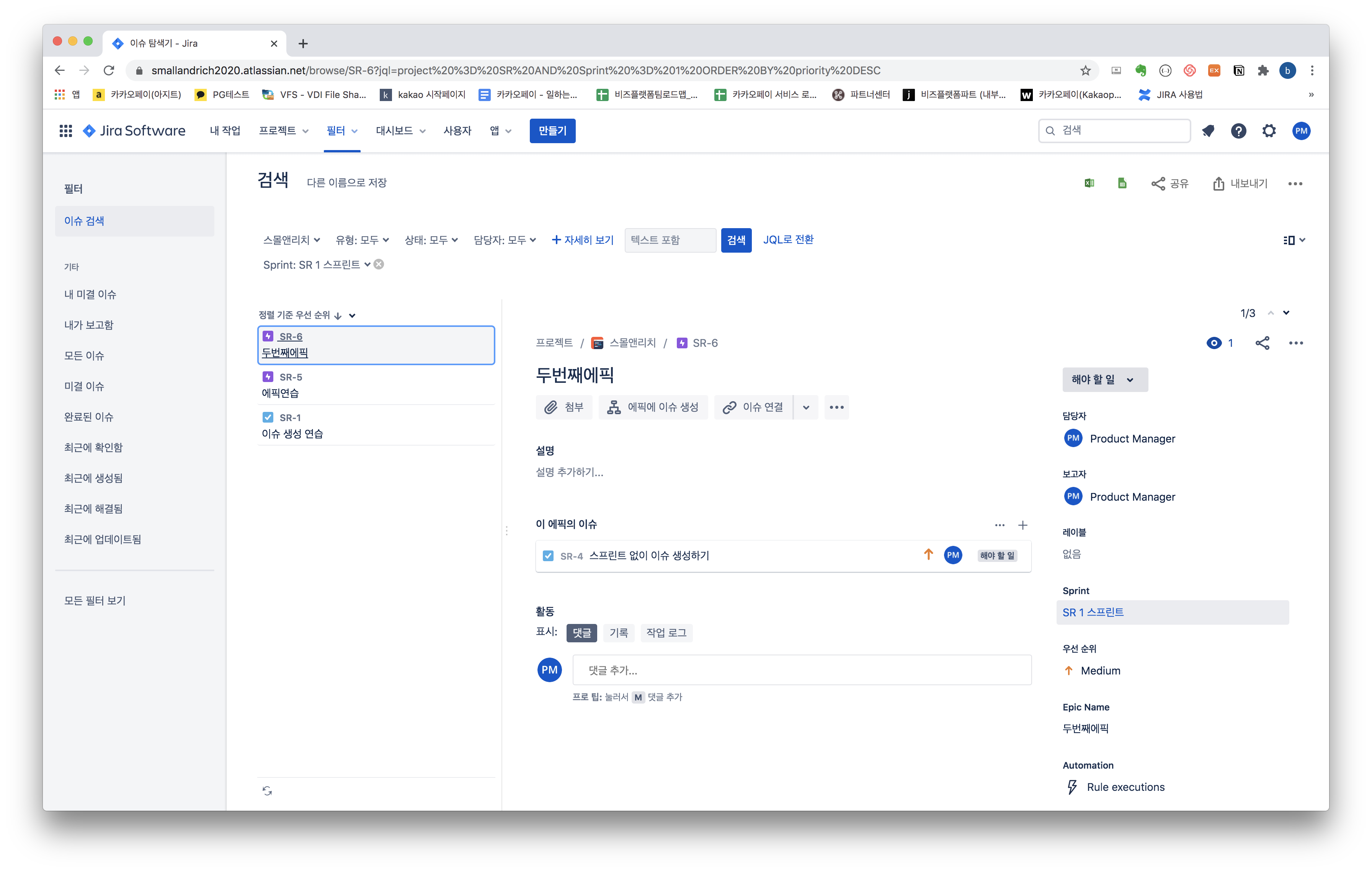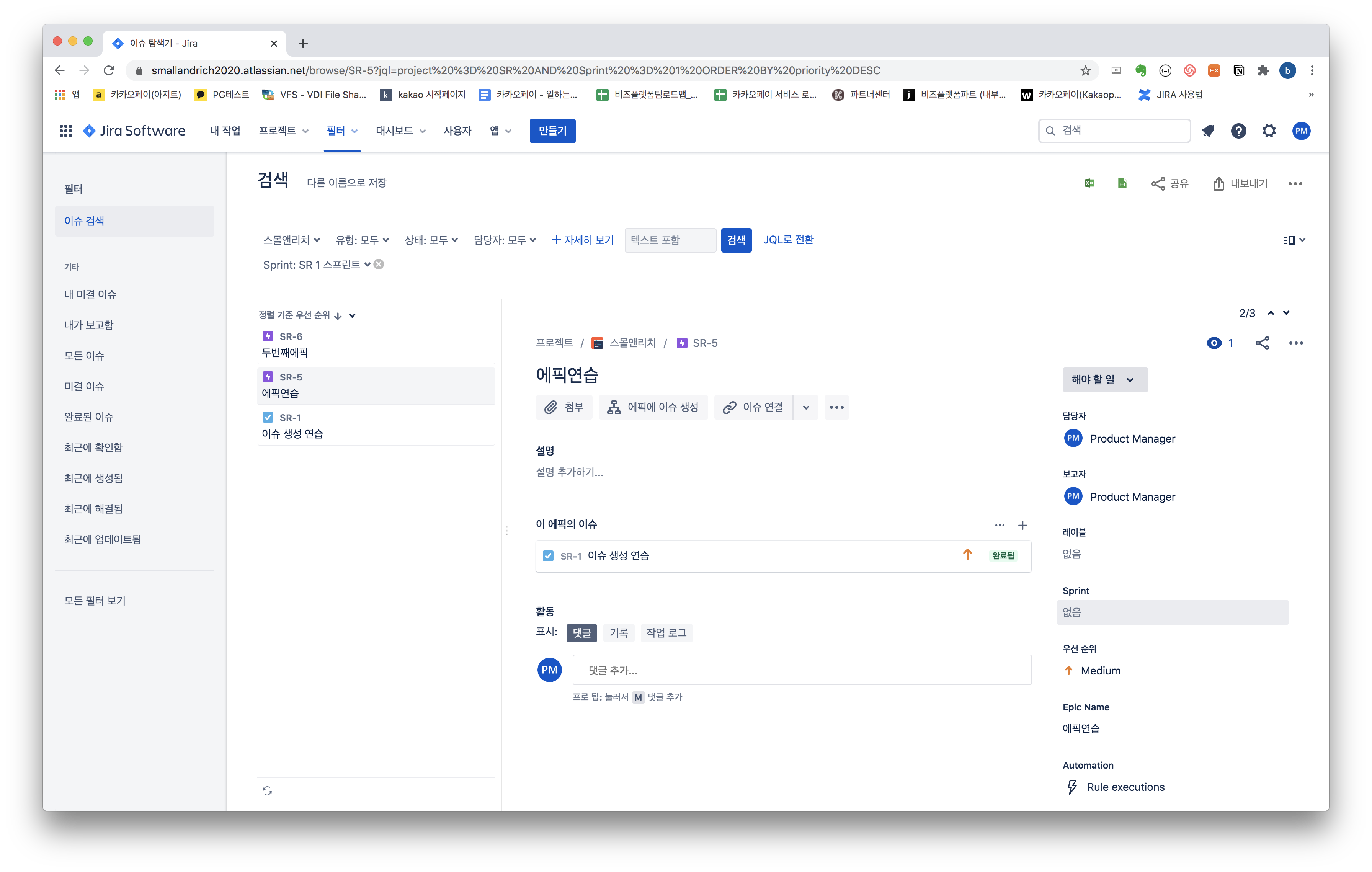 처음에는 이때부터 약간 헷갈릴 수가 있는데요. 사용자가 많아지면 이러한 일들이 항상 발생합니다. 그래서 지라를 관리하는 PM이나 스크럼마스터가 보이지 않는 이슈 들을 잘 찾아서 누락된 값이 있다면 해당 값을 채우고 불필요한 값이 있다면 적절하게 제거해서 지라 보드를 항상 최신화하는 것이 중요할 것 같습니다.