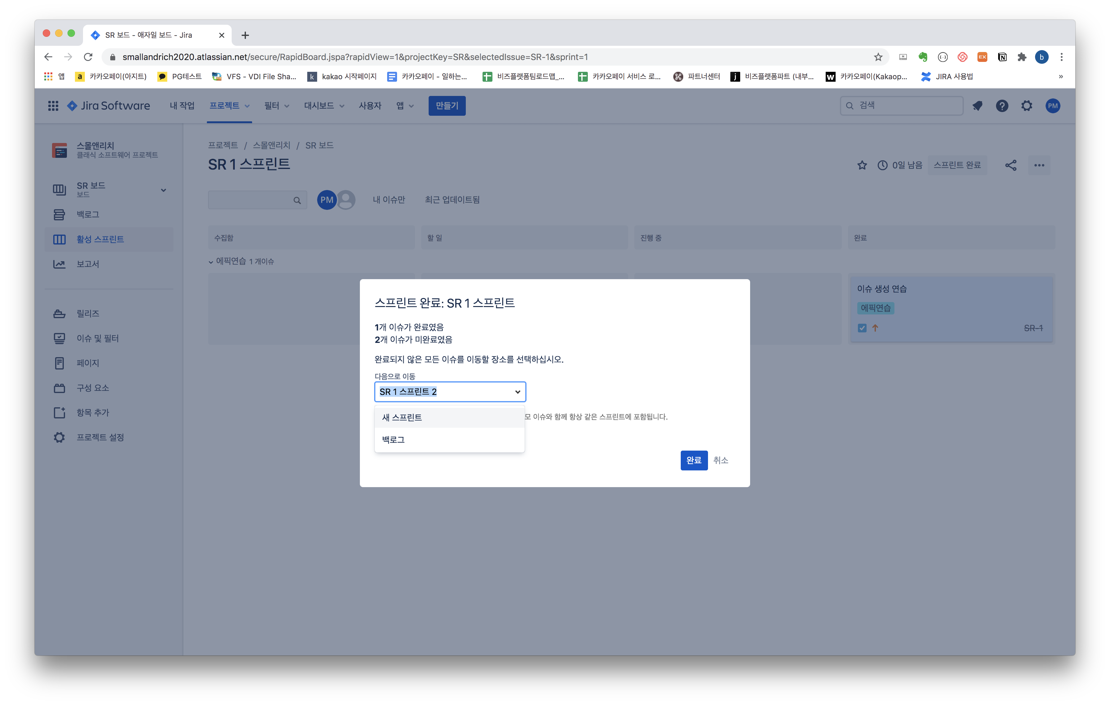 다시 "활성 스프린트"로 이동하면 기존에 할 일에 이슈 1개가 사라진 것을 확인할 수 있습니다. 해당 이슈는 스프린트 2로 이동되었겠죠? 그리고 "스프린트 완료"를 클릭합니다. 그런데 여전히 2개의 이슈가 미완료였음으로 된 것을 확인할 수가 있습니다. 해당 이슈가 어떤 것인지 찾아서 완료처리를 하거나 다음 스프린트로 옮기거나 백로그로 옮기거나 등등의 조치를 취해야 겠죠?