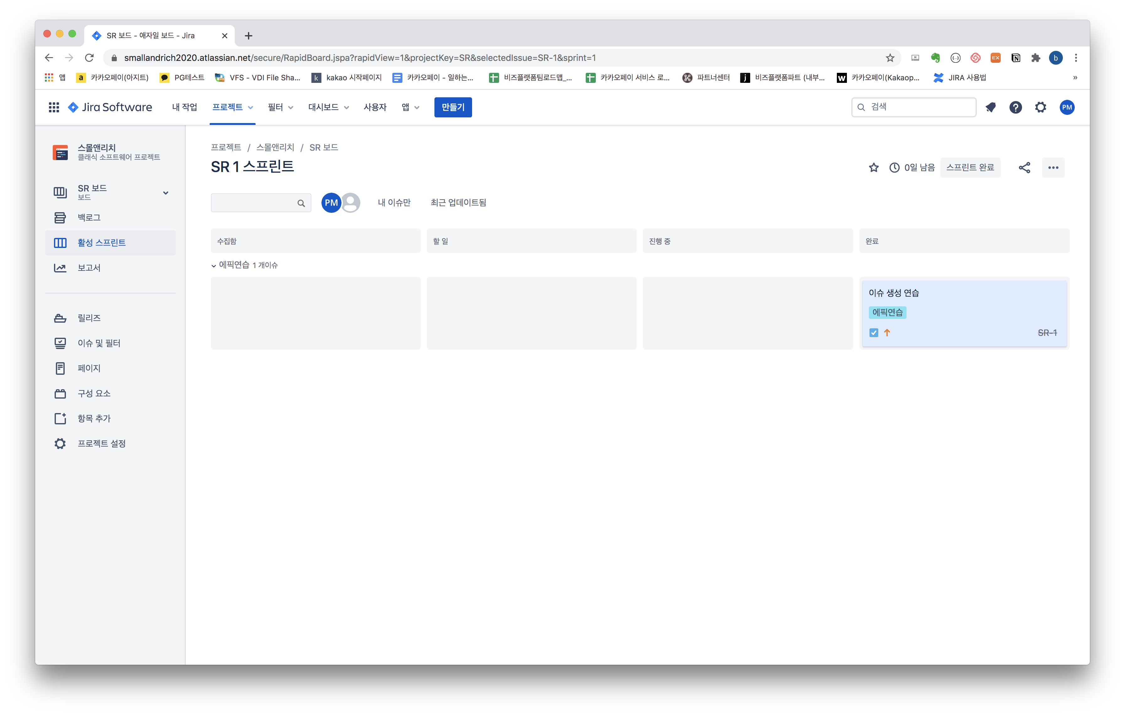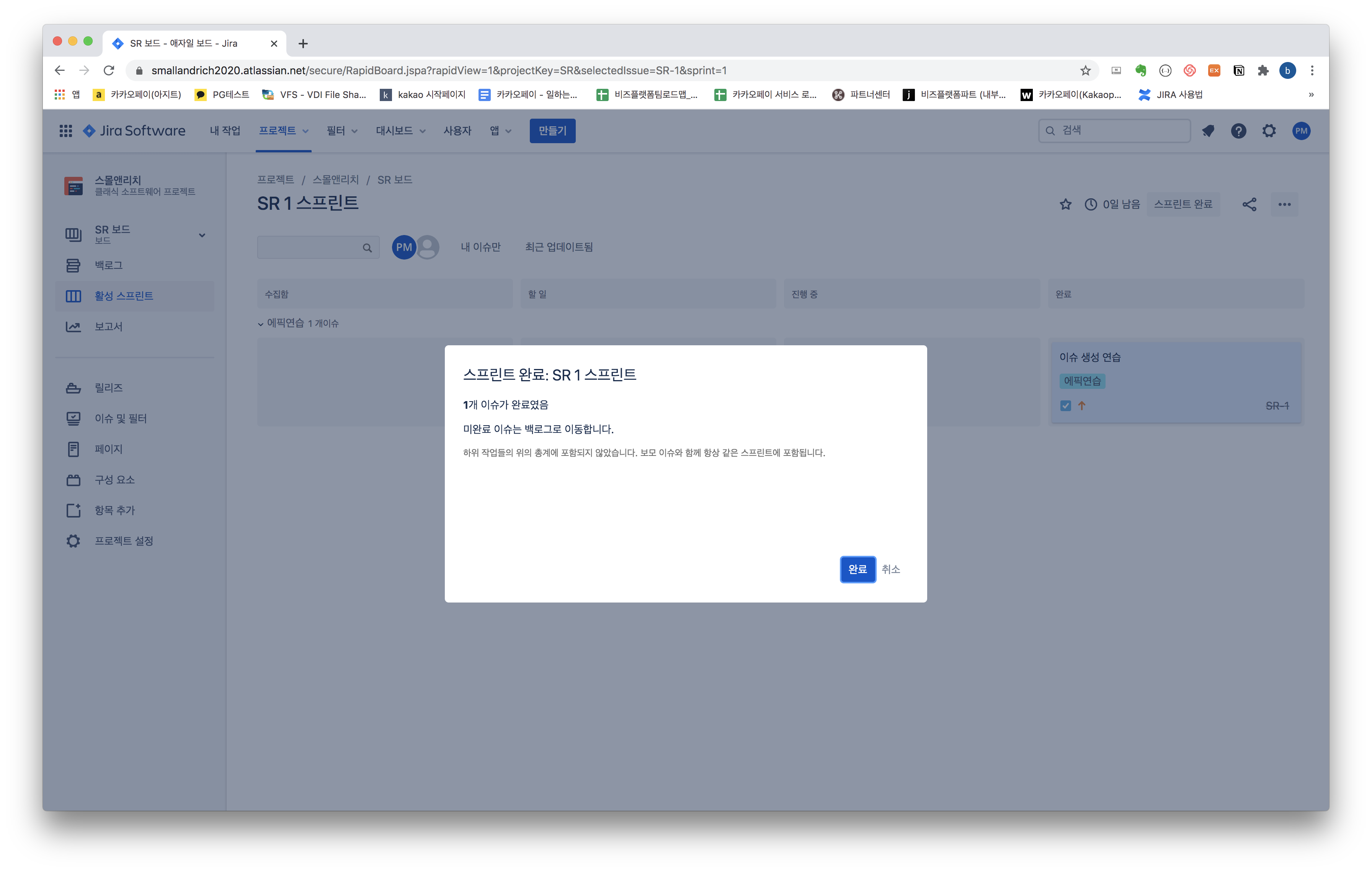자 이제 화면의 보이는 모습과 실제 결과물이 일치하는 것을 확인할 수 있습니다. "1개의 이슈가 완료였음"이고 "완료"를 누르면 스프린트가 종료됩니다.