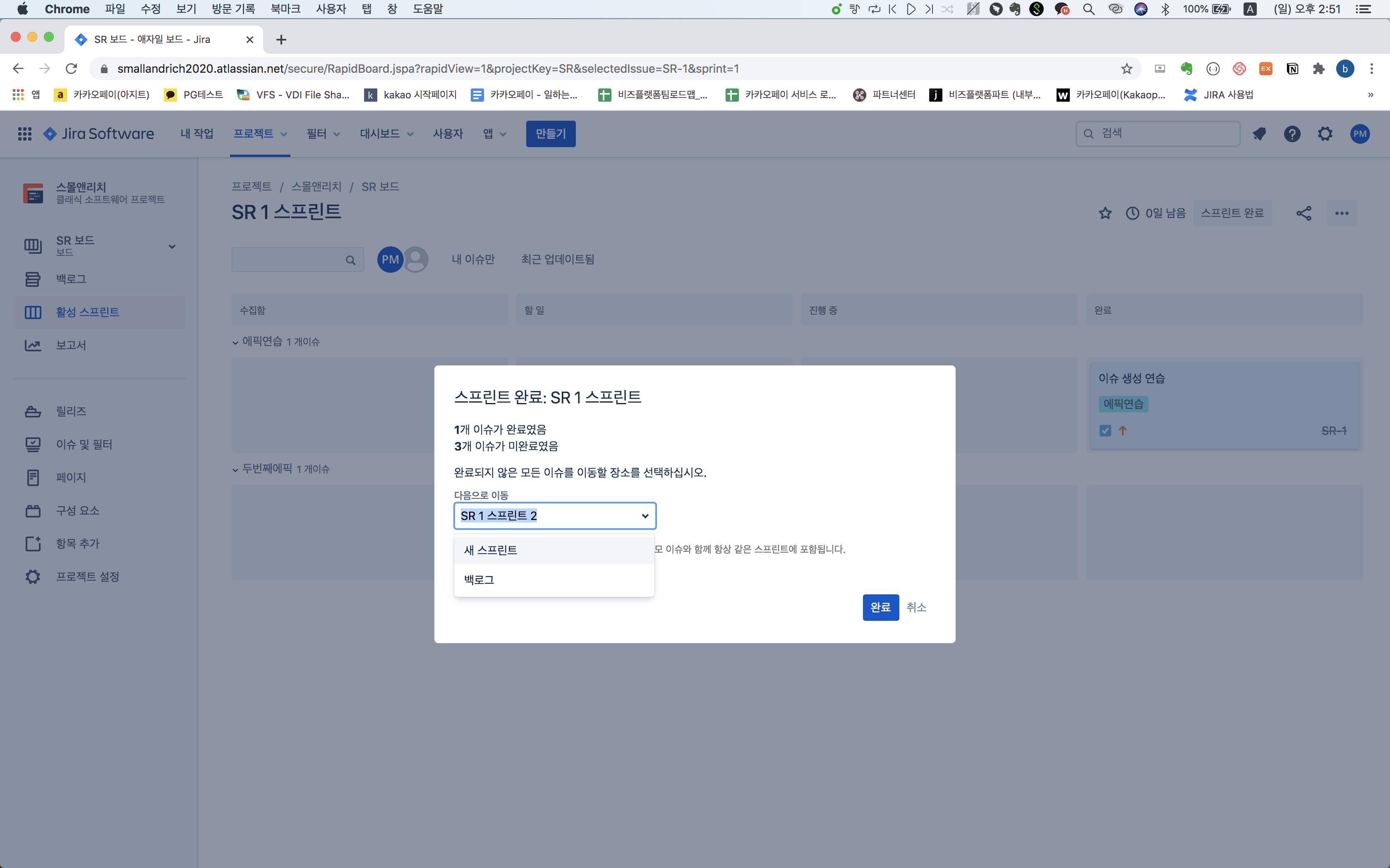 우측 상단의 "스프린트 완료"를 클릭합니다. 이때부터는 JIRA의 작동 방식을 잘 이해해야 합니다. 위에서 "완료" 처리한 이슈는 "1개 이슈가 완료였음"이라고 표시가 된 것을 확인할 수 있습니다. 3개의 이슈가 미완료였음이라고 표시가 되는데요. 이 "미완료" 이슈를 어떻게 처리할 것인지는 각각의 스프린트팀에서 결정하는 것이 좋을 것 같네요. 제가 소개하는 방법은 여러 가지 처리 방법 중의 1개라고 생각해주세요.