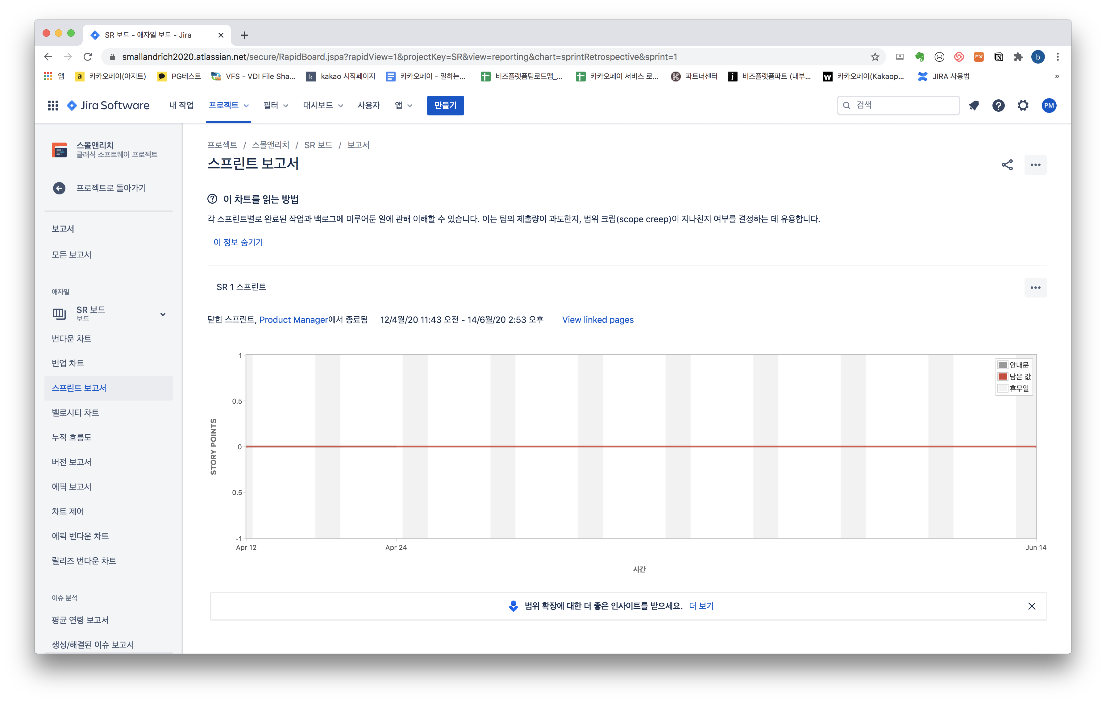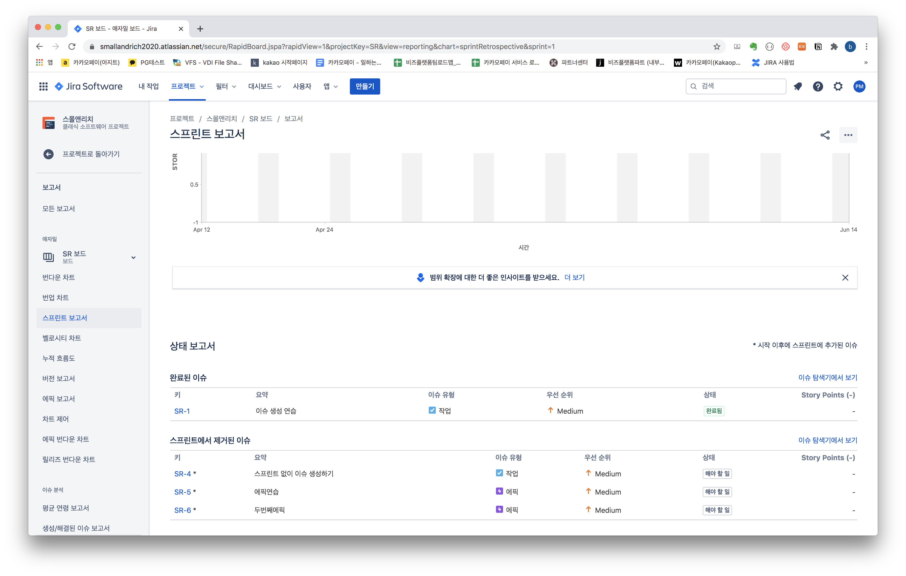 스프린트가 종료되면 "스프린트 보고서"를 볼 수 있는데요. 이번 이슈들은 Story point를 부여하지 않아서 Story points에 대한 보고서는 유의미한 산출물이 나오지 않았네요.