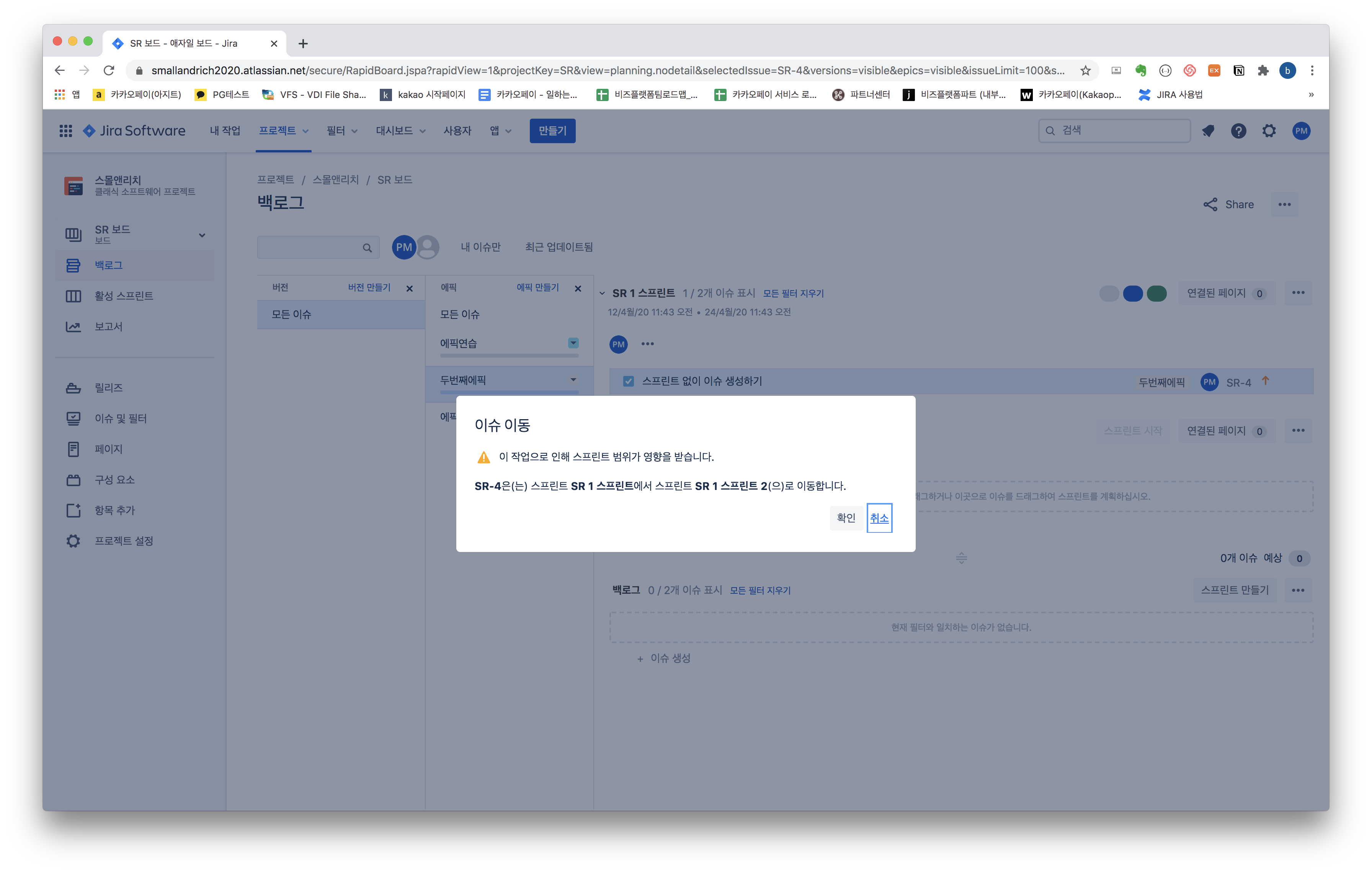아래와 같은 경우에 모두 SR1 스프린트 2로 넘기는 방법, 새 스프린트를 생성하면서 넘기는 방법, 백로그로 넘기는 방법 등이 있습니다. 그런데 저는 개별적으로 처리되는 방법을 소개하려고 합니다. 아래 화면에서 "취소"를 클릭하겠습니다.