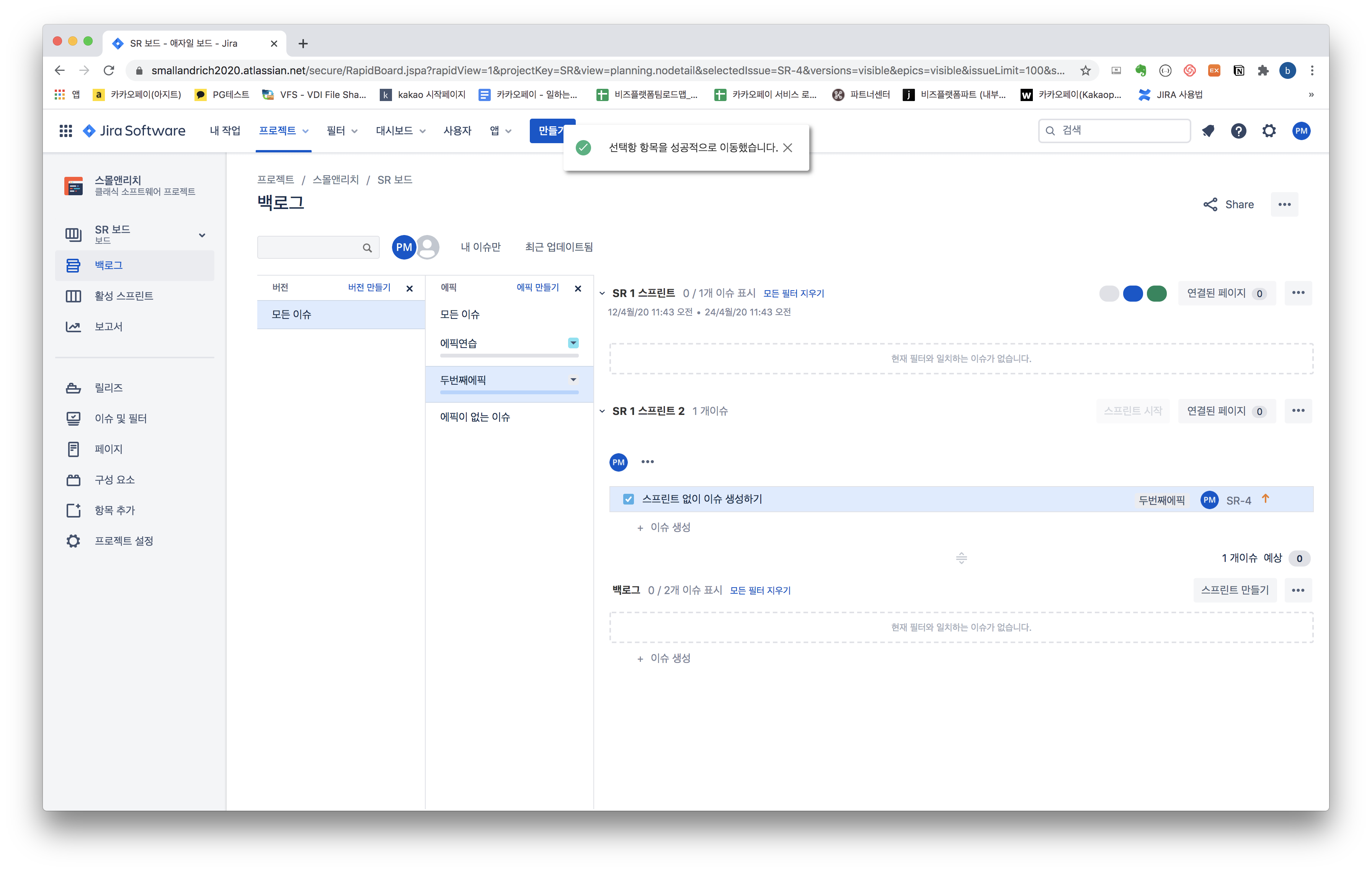이슈가 스프린트 2로 이동한 것을 확인할 수 있습니다.