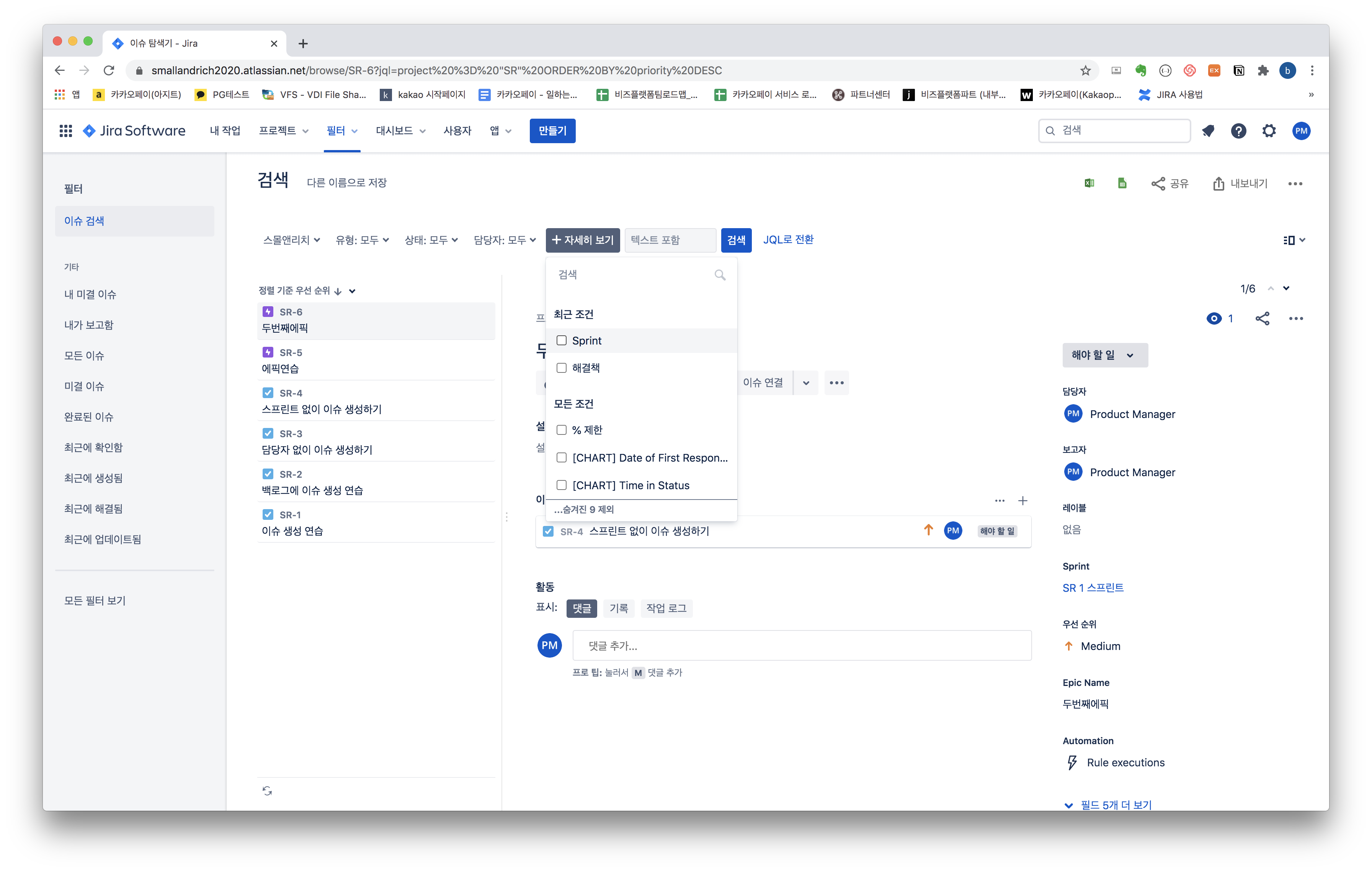 "고급 검색"을 클릭한 후에 "+ 자세히 보기"라는 메뉴를 확인할 수 있는데요. 이 기능은 커스텀 필터를 제공하는 기능입니다. 여기에서 "Sprint"를 선택합니다.