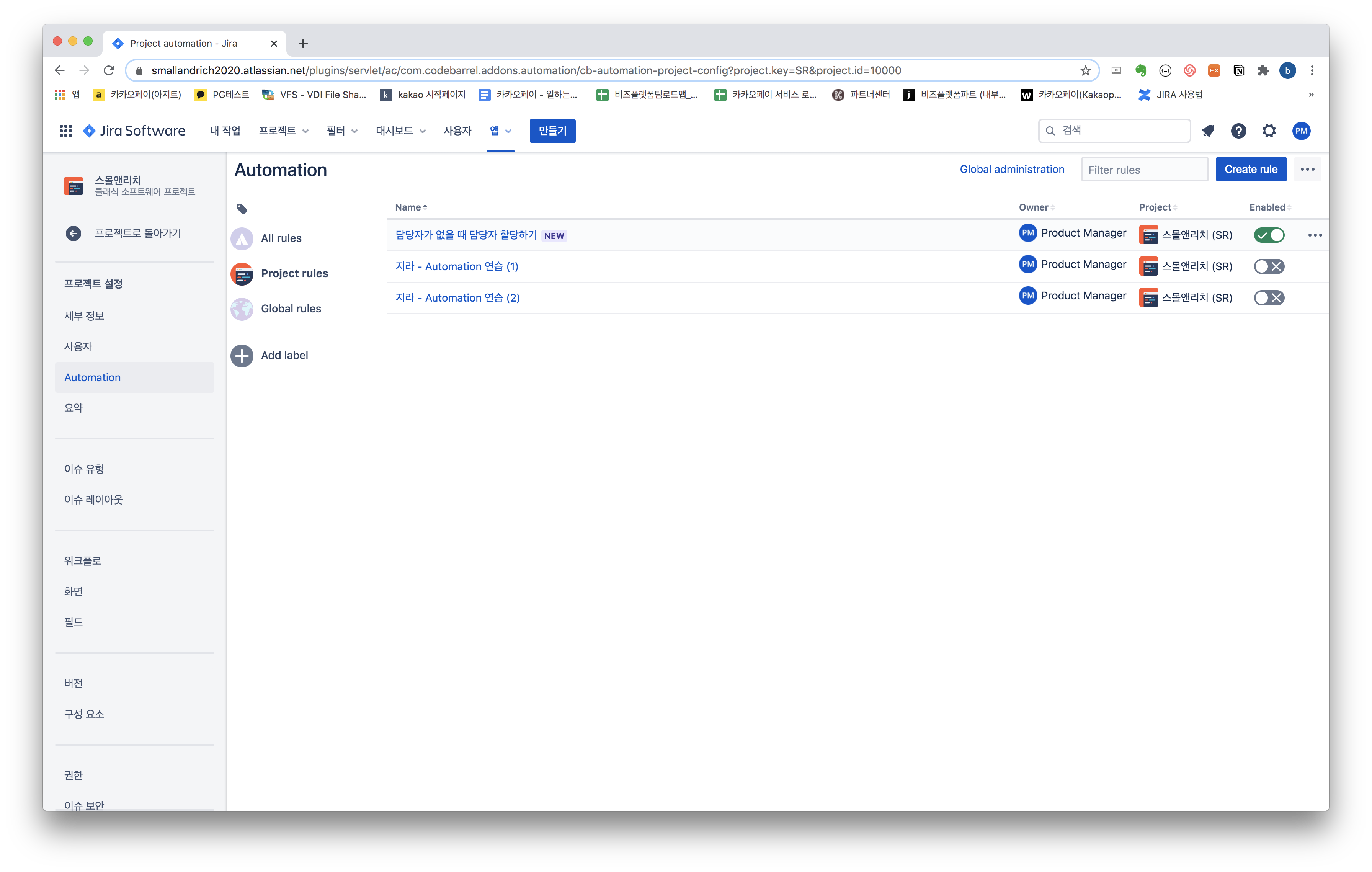 이제 본격적으로 지라 자동화(JIRA Automation)를 시작할 수 있게 되었네요. (스크린샷에 있는 지라 - Automation 연습(N)은 무시해 주세요. 제가 혼자 연습해본 내용입니다... ㅠㅠ)