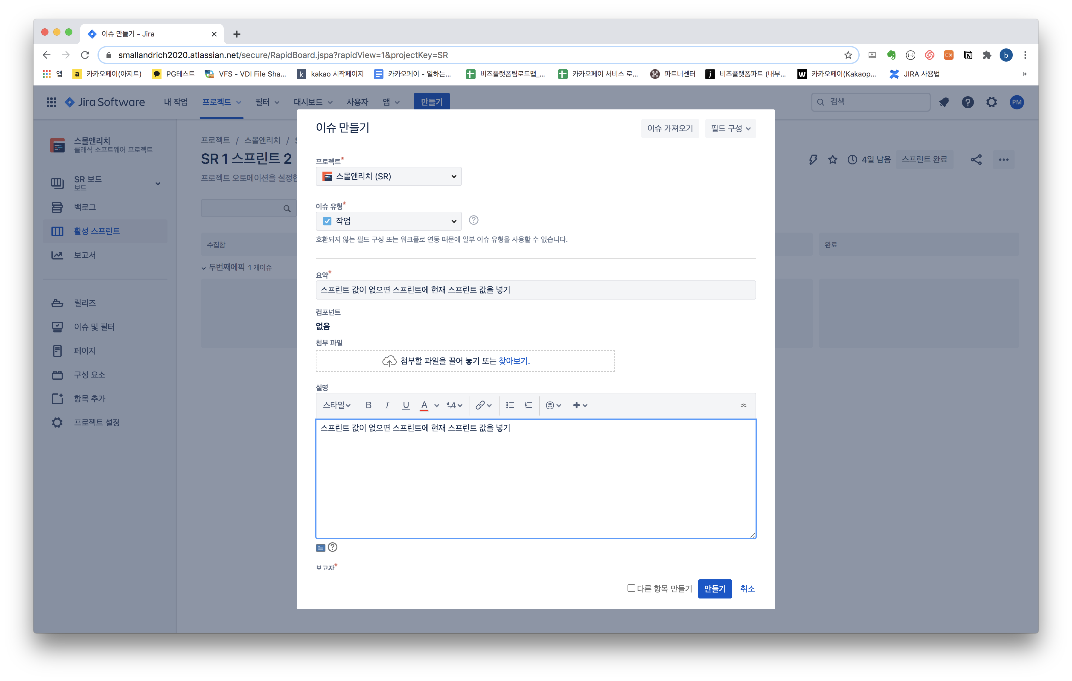 기본 항목들은 입력해주시고 스프린트를 비운 상태(담당자도 비운 상태)로 이슈를 등록합니다.