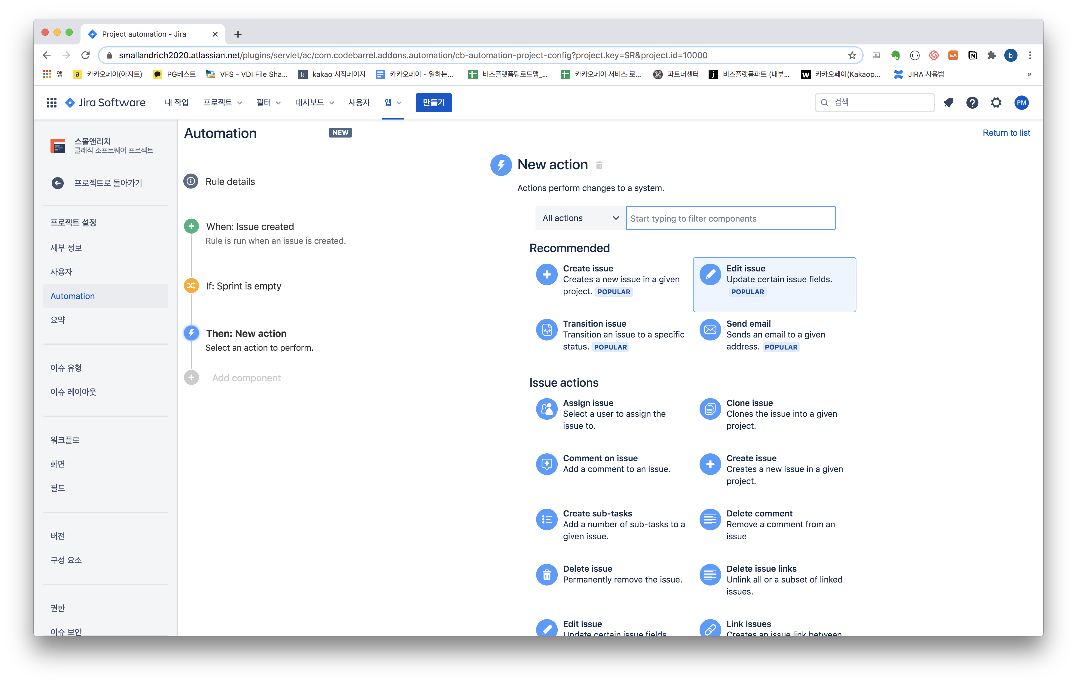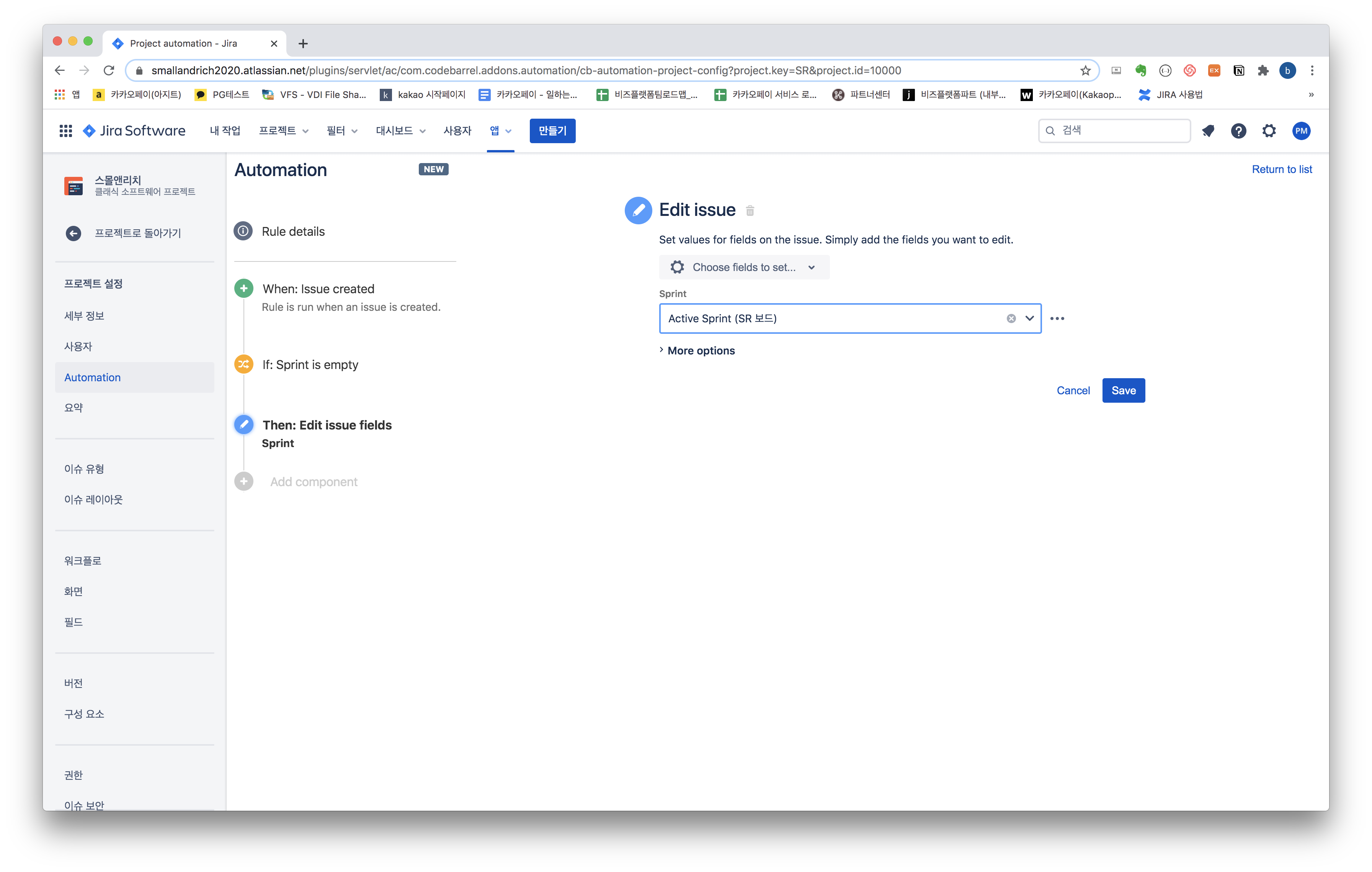 이번 시나리오는 "이슈를 생성할 때" / "스프린트가 없으면" / "스프린트를 현재 활성 스프린트로 설정하기"입니다. 위에 "담당자 할당하기"와 거의 비슷한 시나리오입니다. 사실 거의 모든 규칙이 비슷합니다. 그래서 몇 번만 익히면 그 다음에 확장시키기가 수월합니다.