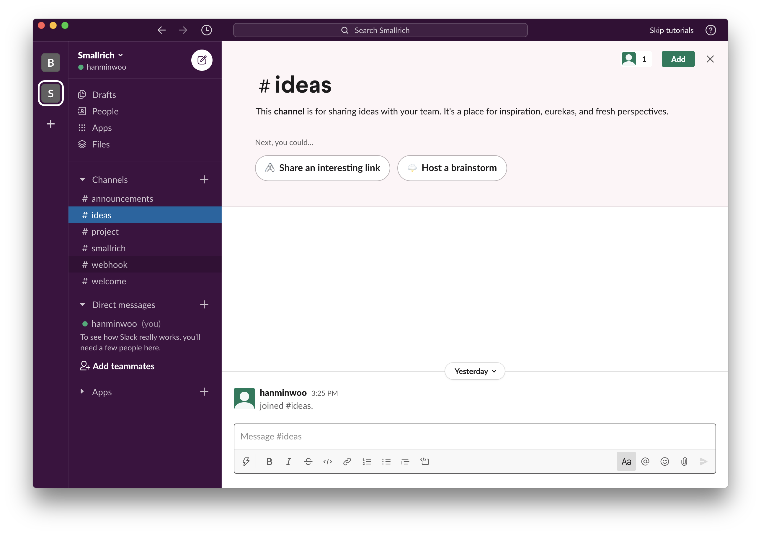 슬랙 메신저에서 채널 정보를 확인합니다. 저는 오늘 포스팅에서 #webhook 채널을 사용할 예정입니다. (#ideas 아닙니다.)