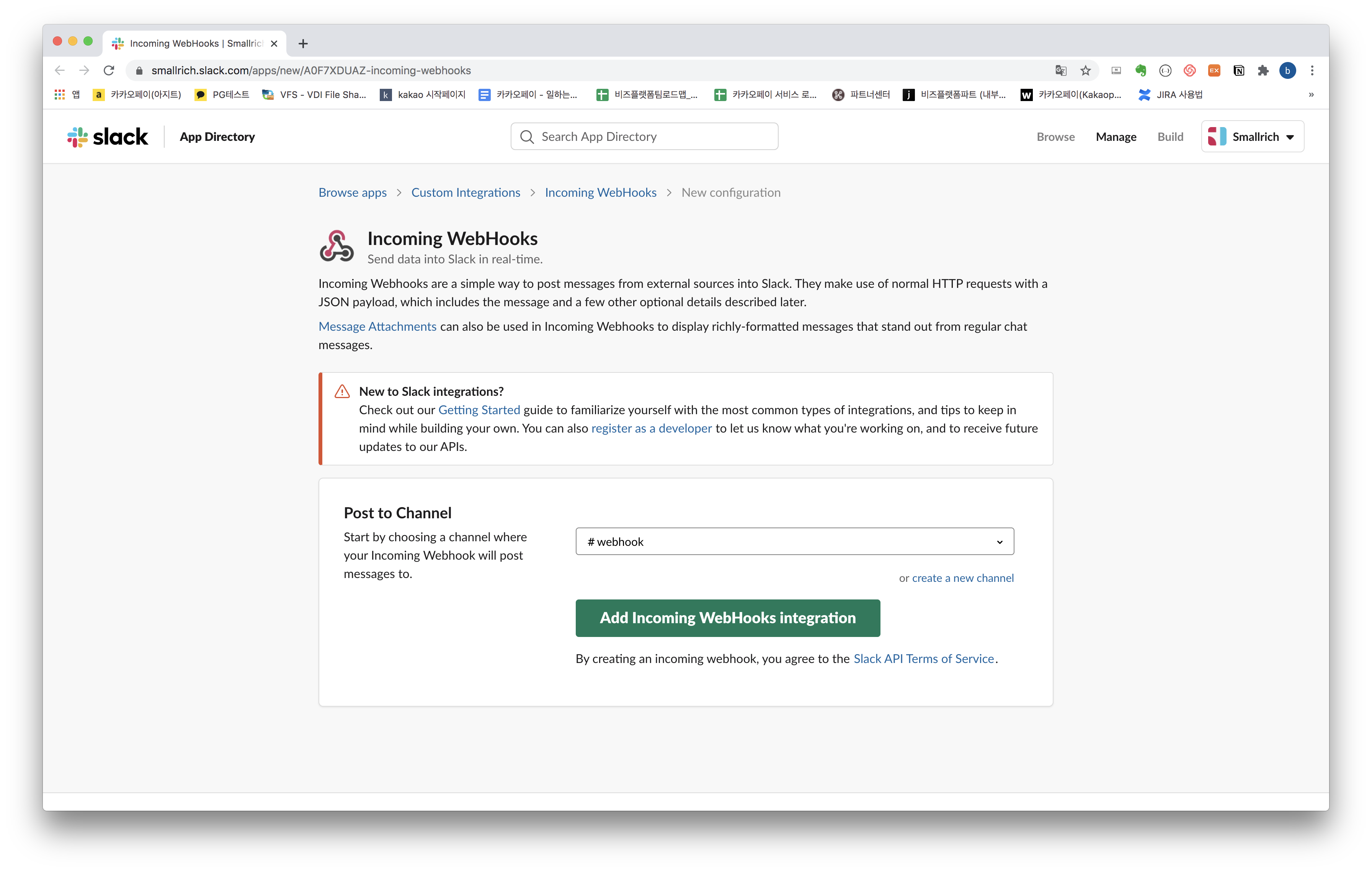 <Send Slack message - configure an incoming webhook 확인하기> Incoming WebHooks에서 글을 작성할 채널(Post to Channel)을 선택한 후에 "Add Incoming WebHooks integration"을 클릭합니다.