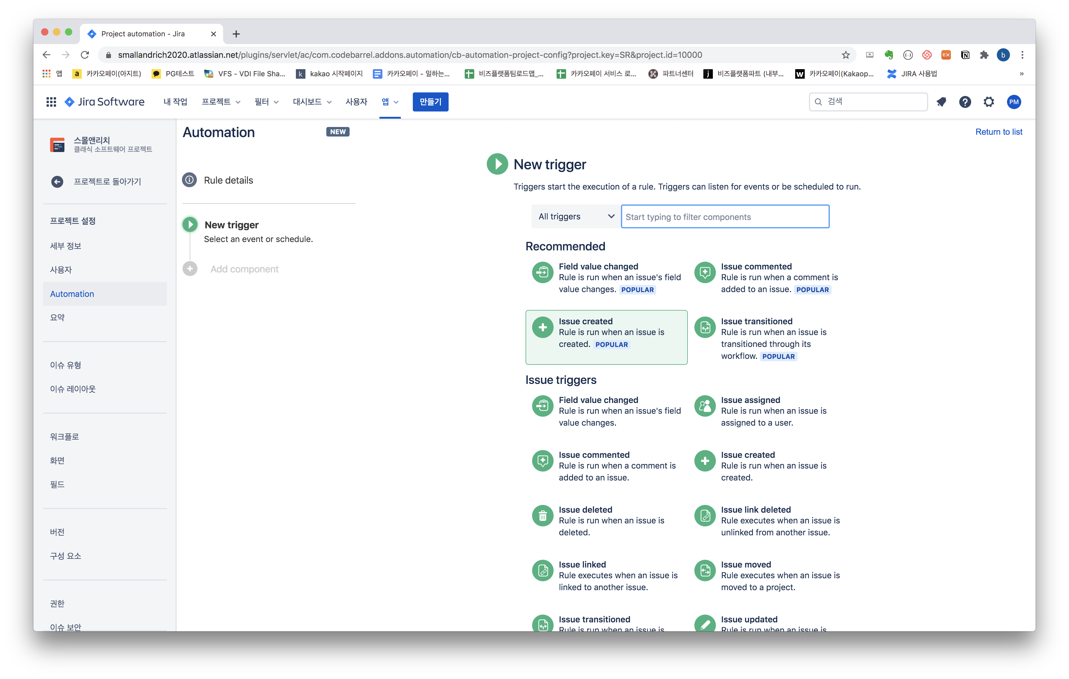 프로젝트 설정에서 Automation 페이지에서 "Create Rule" 을 클릭합니다. New trigger로 "이슈 생성할 때(Issue created)"을 선택합니다.