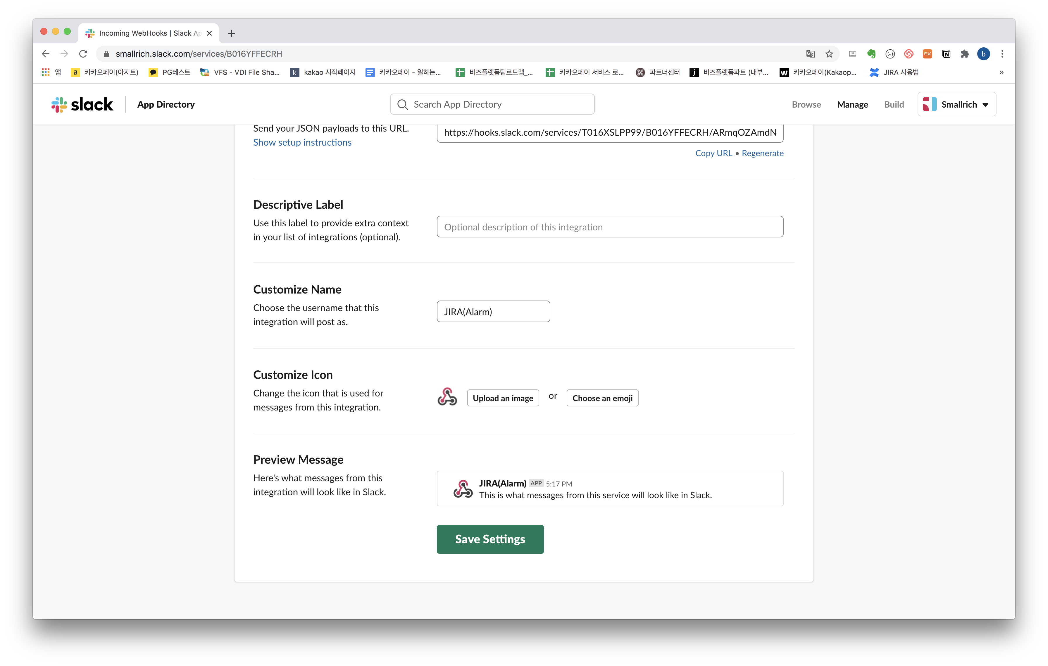 필요에 따라서 "Customize Name", "Customize Icon" 등을 수정하고 Preview Message를 확인합니다. Preview Message는 슬랙(Slack)에서 보내는 사람으로 표시되는 모습입니다.