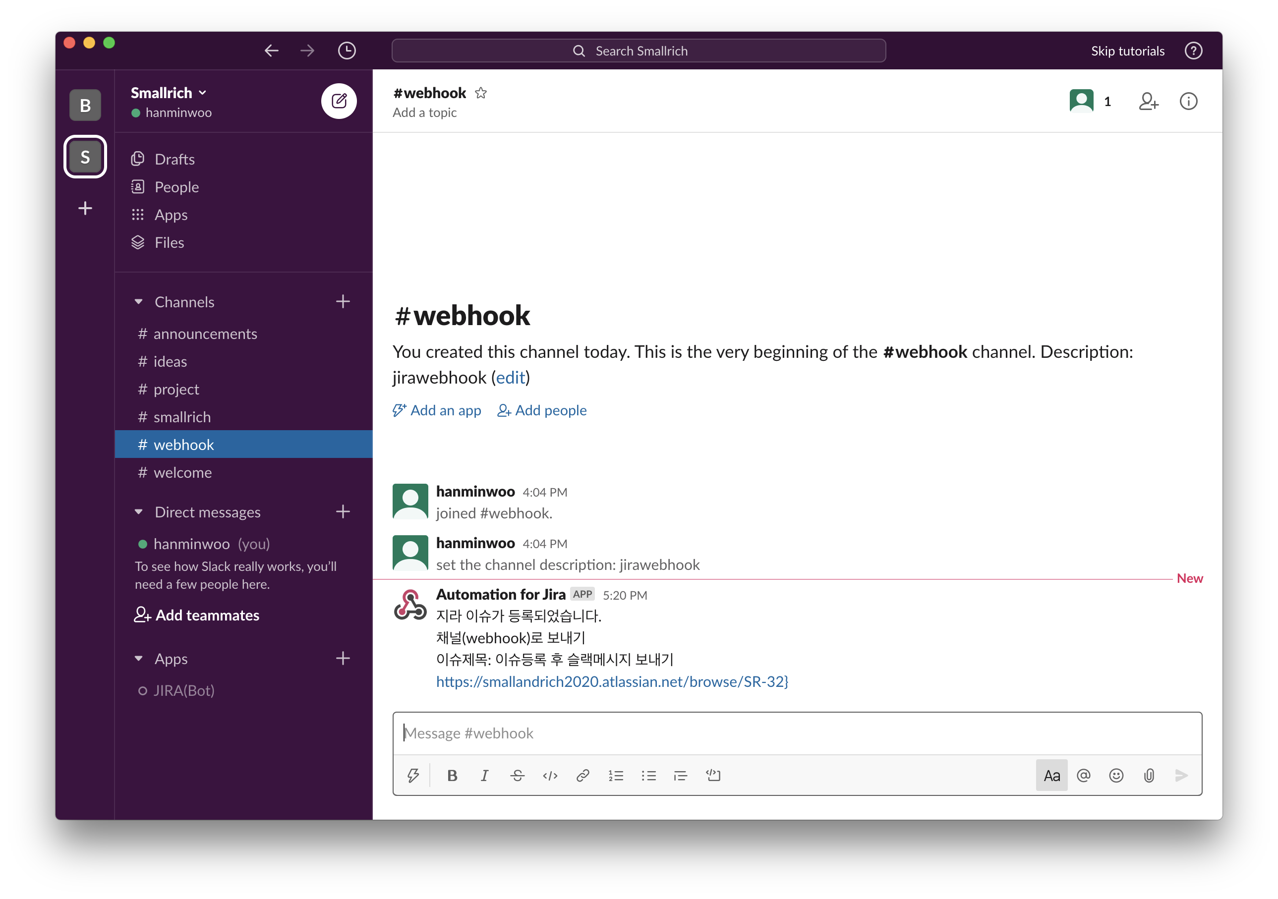 <지라 이슈 등록 확인> 슬랙 메신저의 #webhook 채널을 확인해보니 메시지가 잘 도착했습니다. 짝짝짝