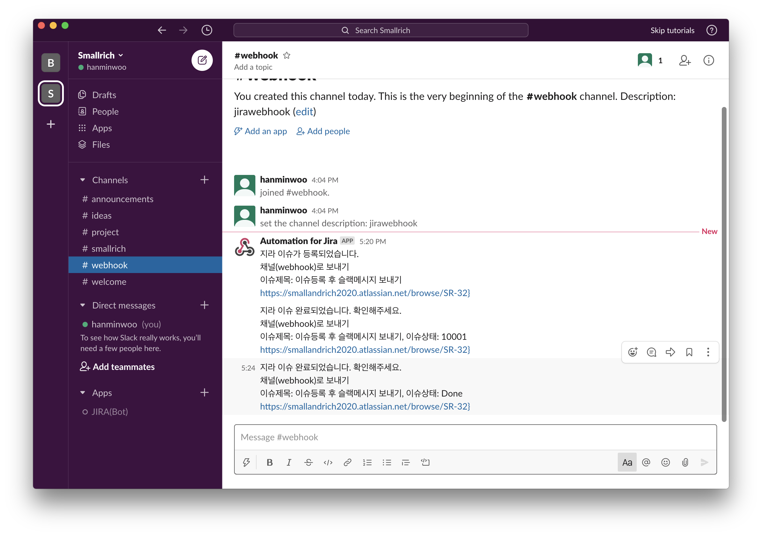 <Slack 메시지 확인> 두 번 정도 해보니 이제 어떤 시나리오가 나와도 처리가 가능하겠죠? 다음 포스팅에서는 JIRA Cloud 앱을 설치해서 사용하는 방법을 작성해보겠습니다. 사실 생각보다 너무 쉽고 너무 좋더라구요. ㅎㅎ 먼저 성공하신 분들이 계시다면 댓글로 알려주십셔~! ㅋㅋ