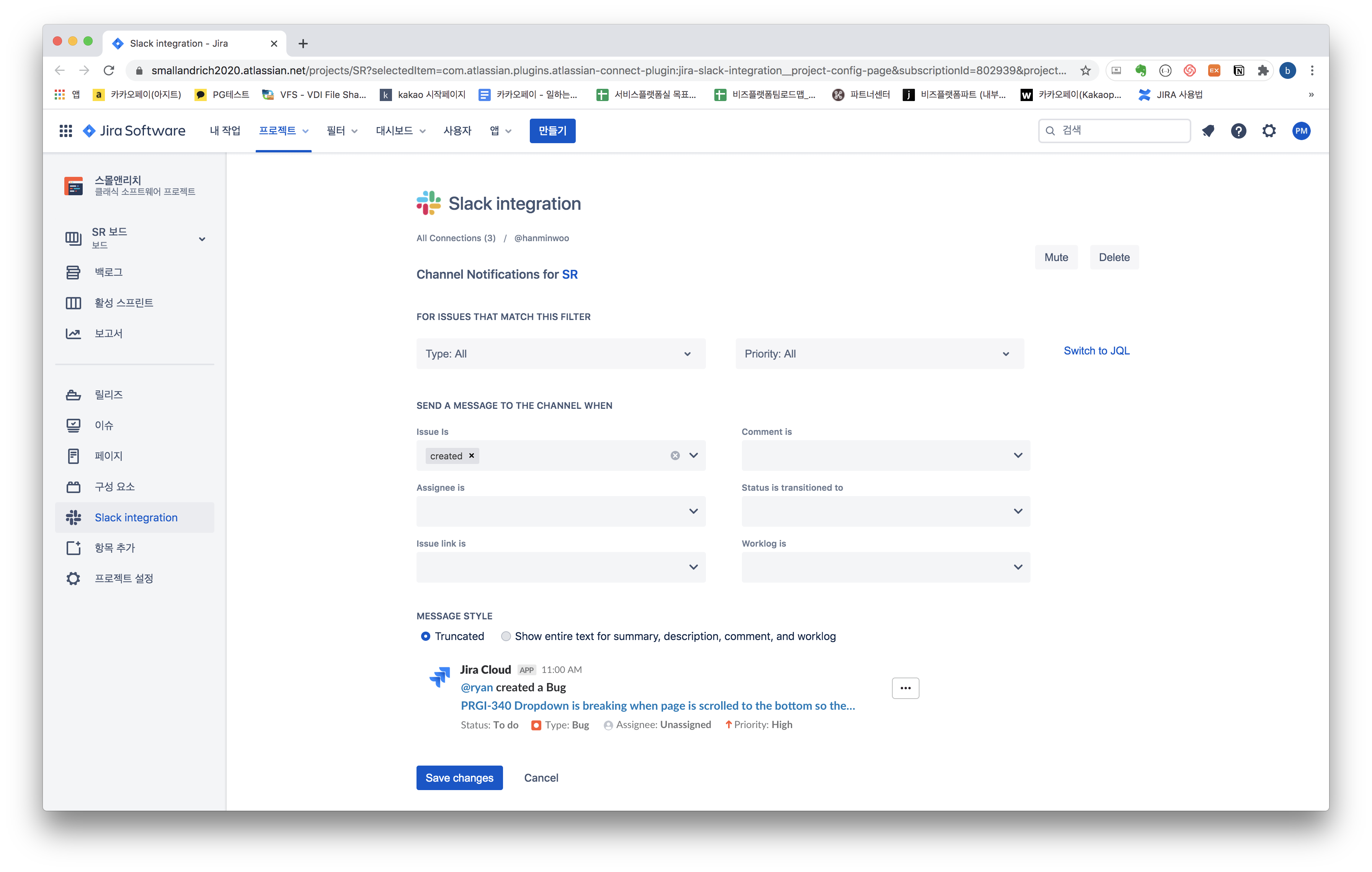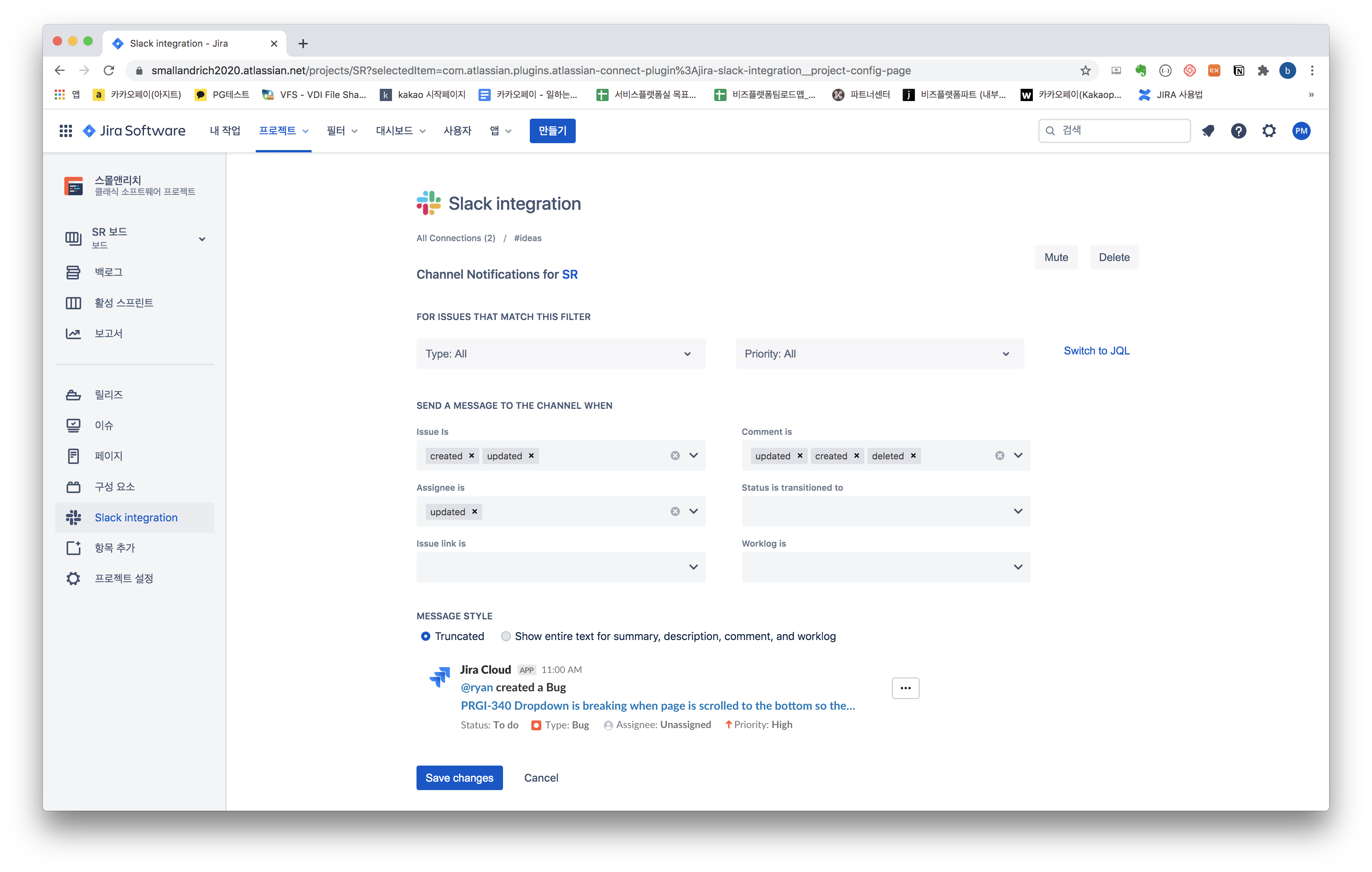 <슬랙에서 사용할 수 있는 JIRA 관련 명령어 확인하기> 8. 지라(JIRA)에서 슬랙(Slack) 채널별 알림 설정하기