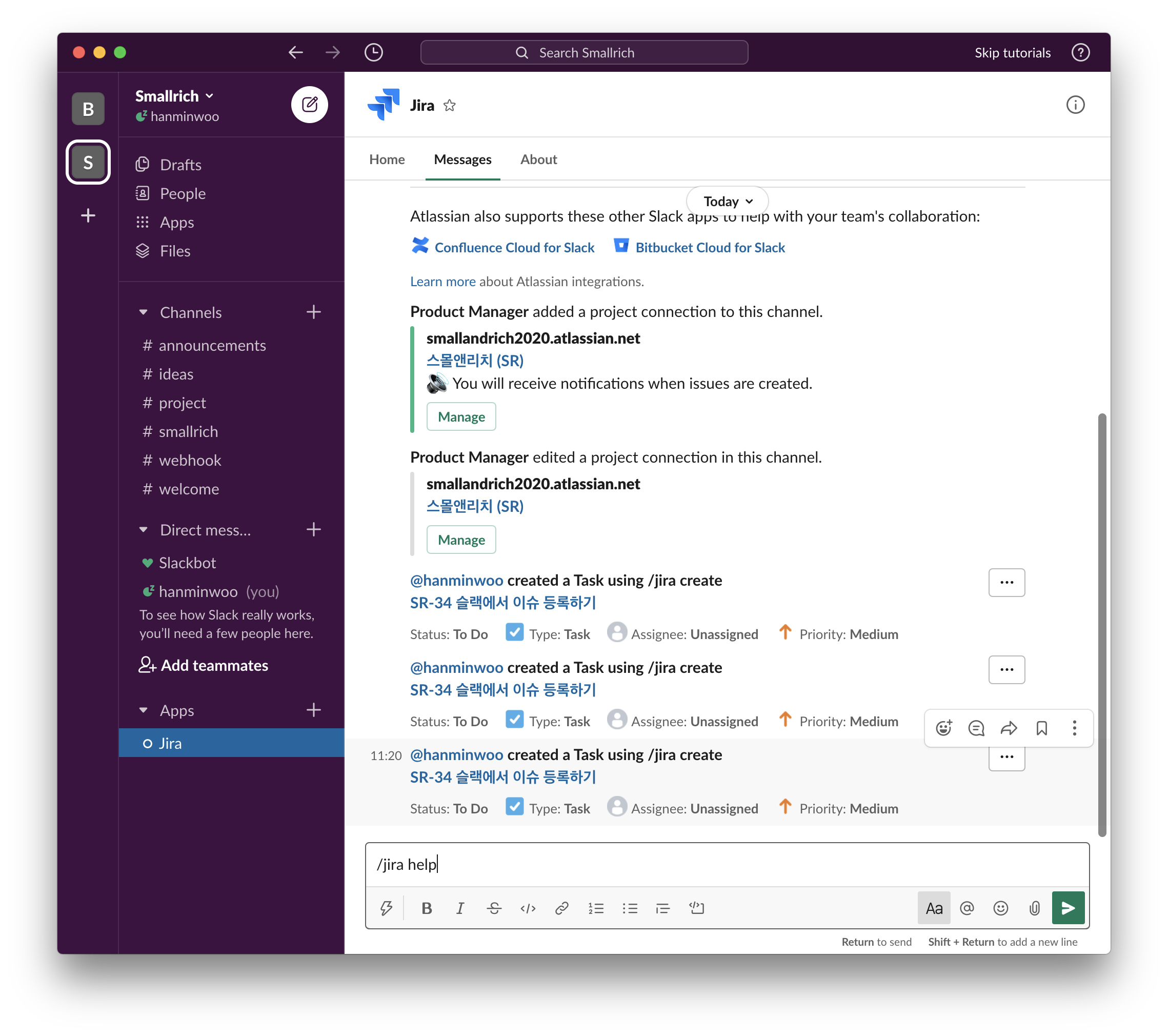 <(참고) webhook 작동 확인> 4. 슬랙(Slack)에서 지라(JIRA) 이슈 할당하기