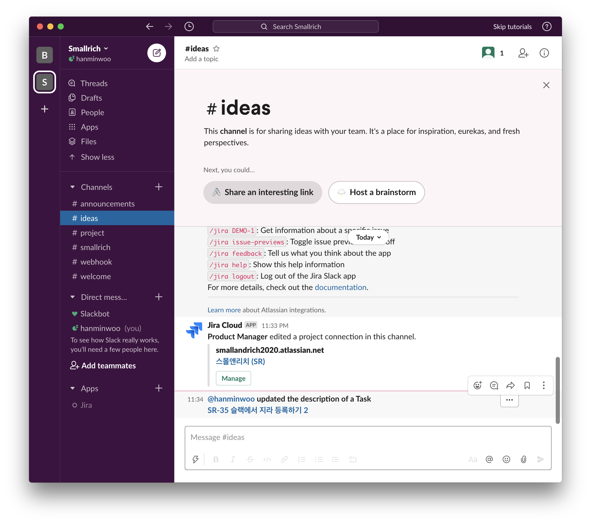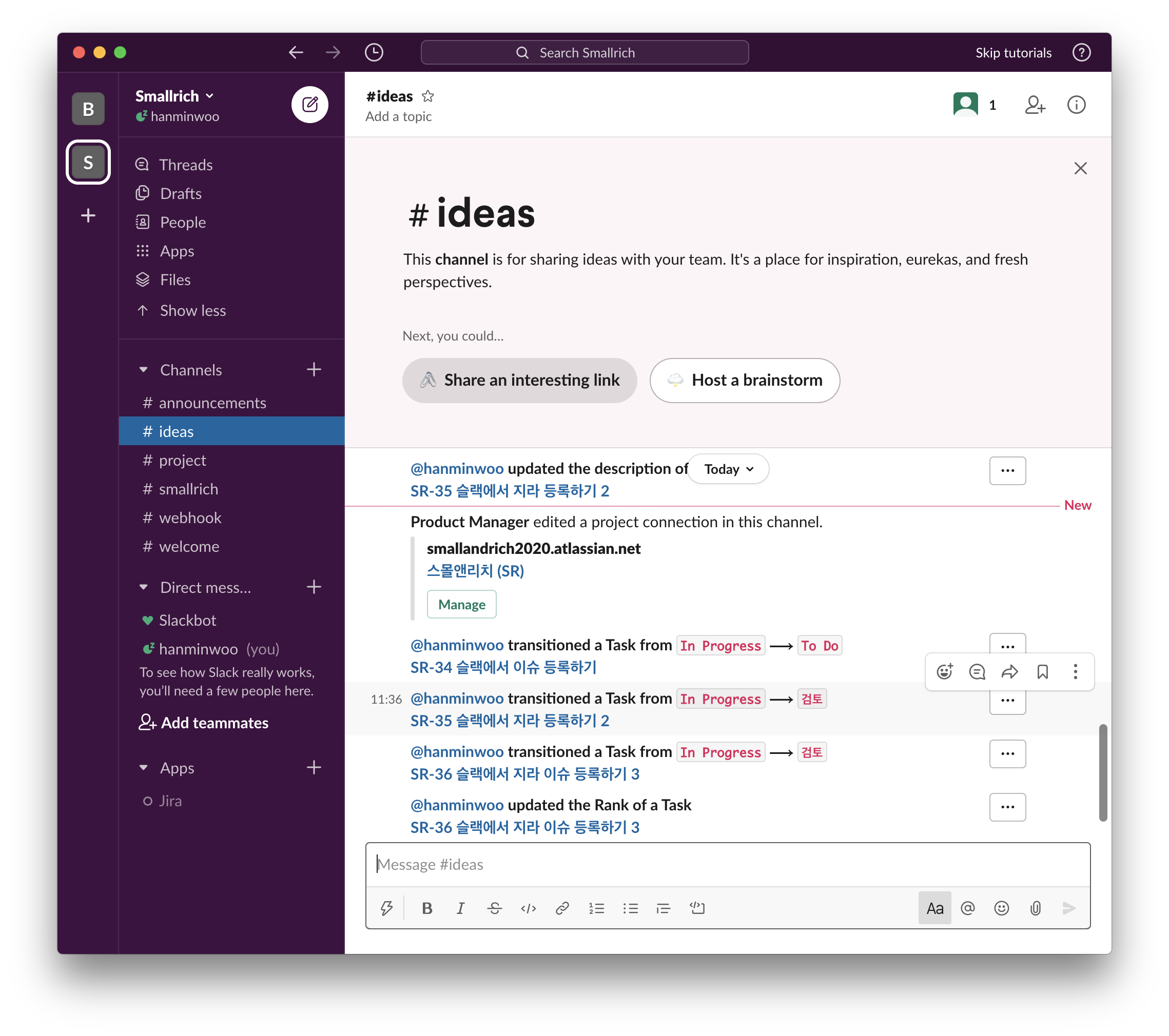 <이슈 updated 하여 슬랙(Slack) 메시지 확인하기> 슬랙 메신저의 #ideas 채널에 지라(JIRA) 알림을 확인할 수 있습니다. (업데이트 내용은 없고 업데이트 되었다는 것만 볼 수 있네요.)