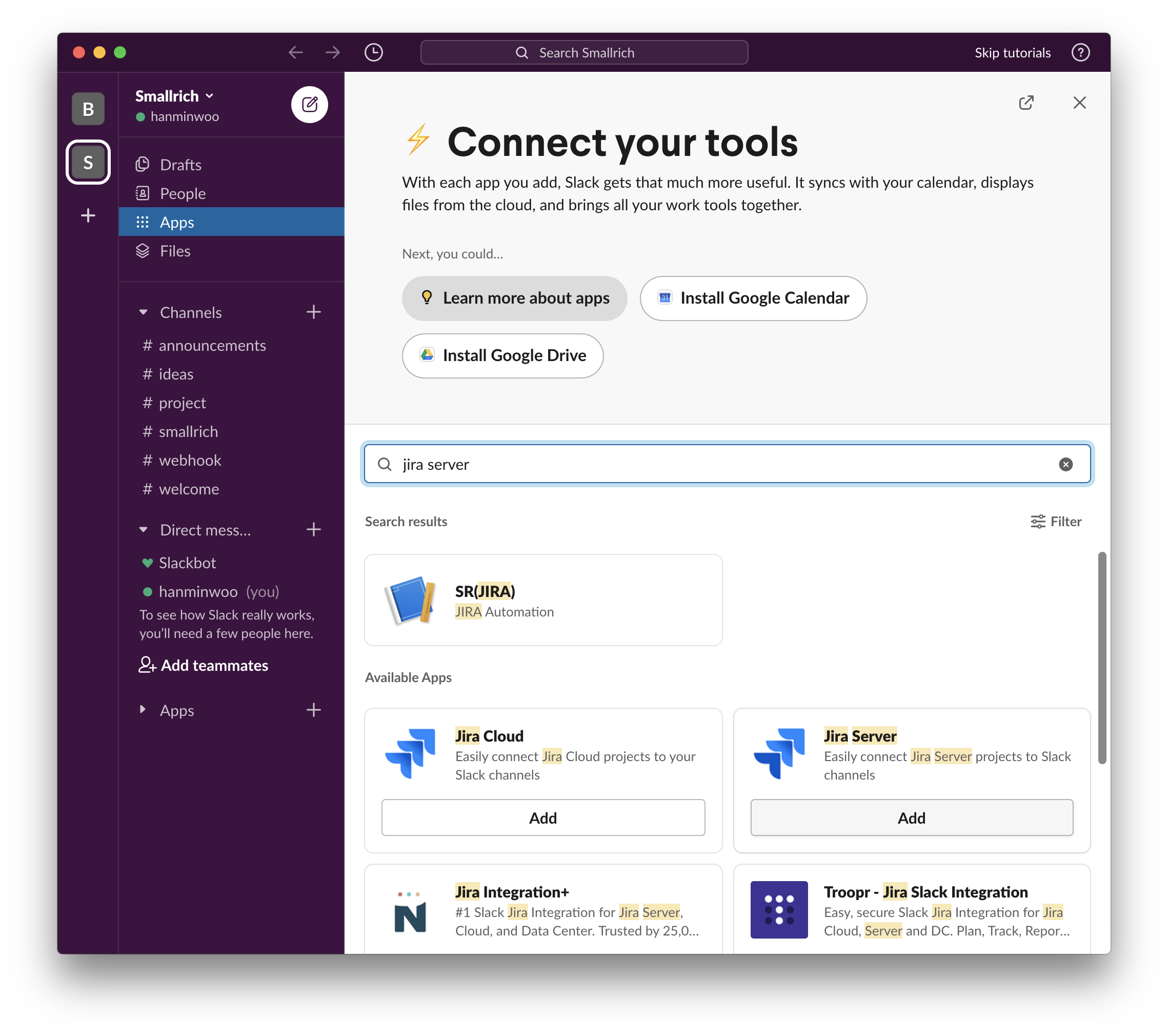 <JIRA Cloud 검색> 혹시 지라(JIRA) 설치형(Server)을 사용 중이시라면 슬랙 메신저의 Apps에서 "JIRA Server"를 검색해도 좋습니다.
