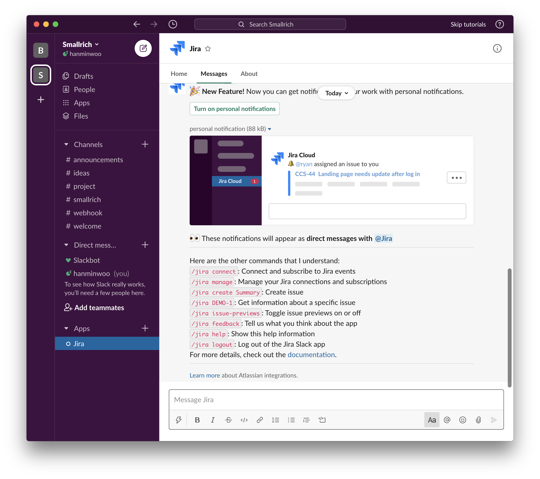 </jira help 명령어 입력하기> 슬랙(Slack)에서 사용할 수 있는 다양한 명령어를 확인할 수 있습니다.