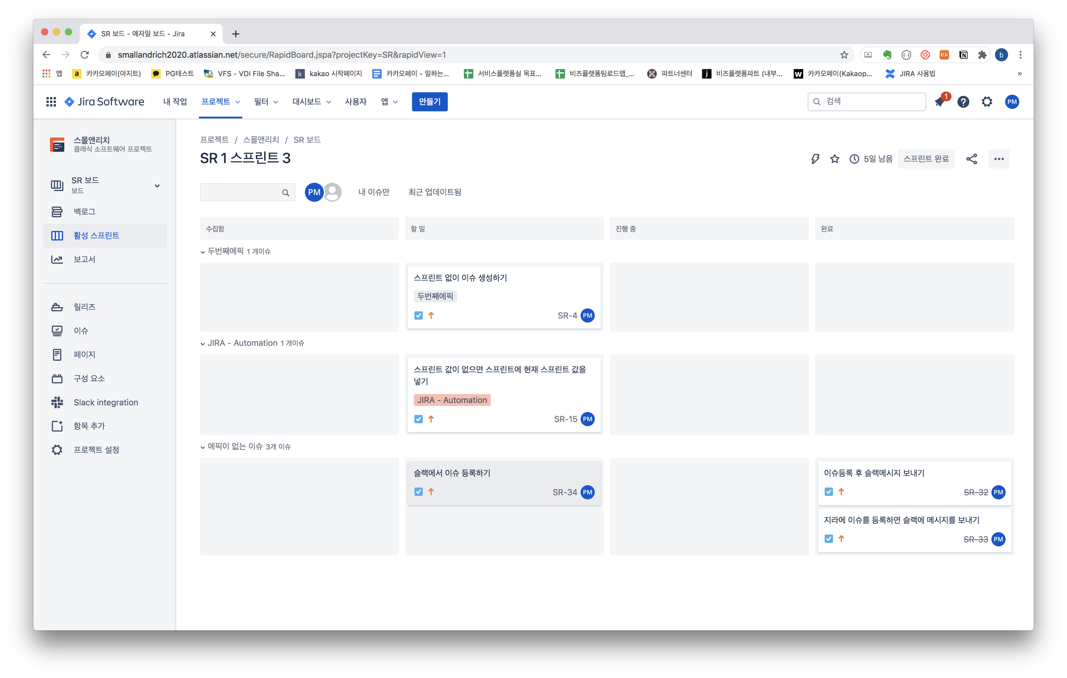 <지라(JIRA) 이슈 등록 알림> 연결된 링크를 클릭하여 지라(JIRA)의 활성 스프린트 보드를 확인합니다. 이 과정에서 앞에 다른 포스팅에서 소개한 지라 자동화(JIRA automation) 규칙이 작동했습니다. 이 덕분에 슬랙(Slack)에서 스프린트를 입력하지 않았지만 활성 스프린트 보드에서 볼 수 있습니다.
