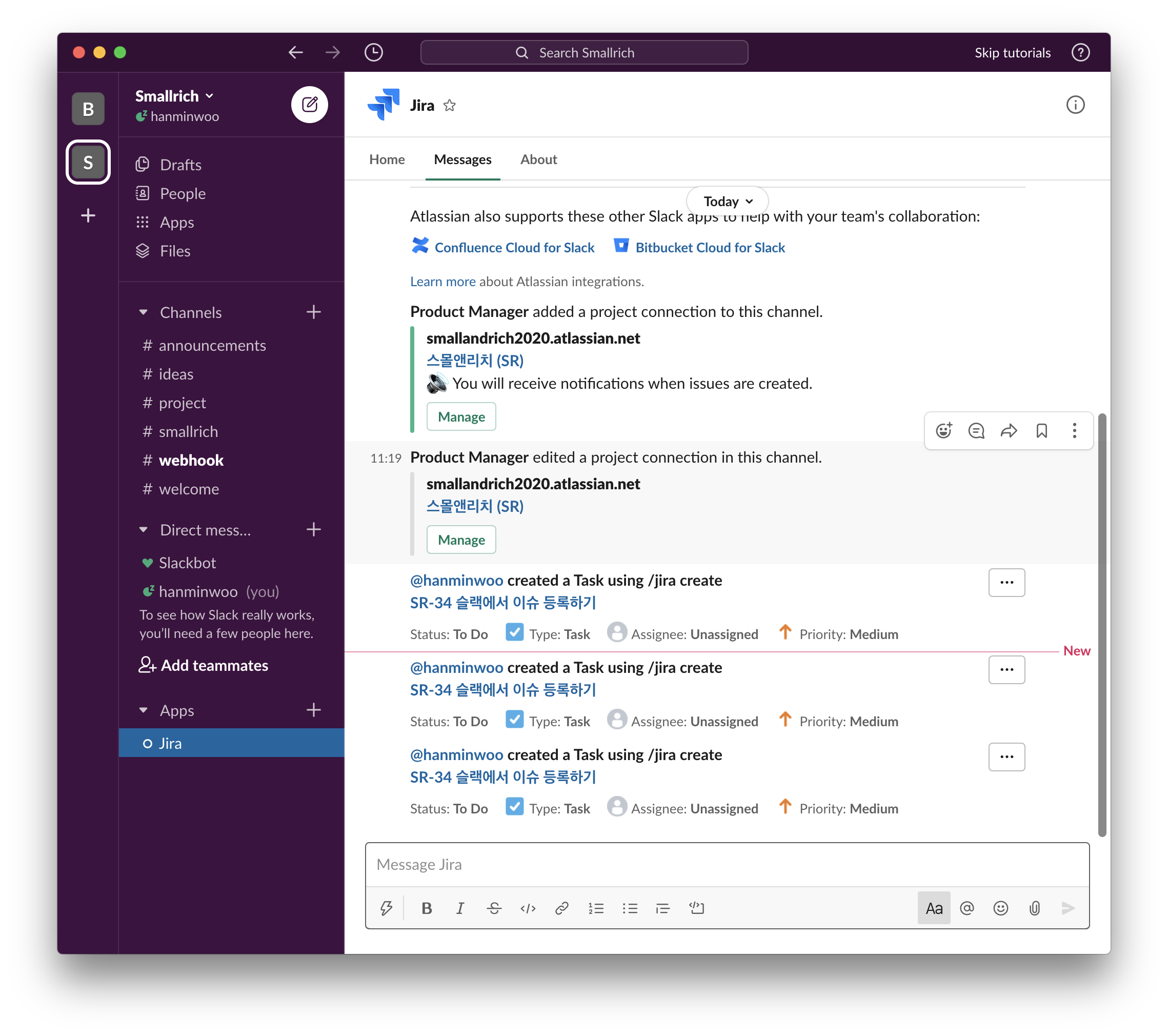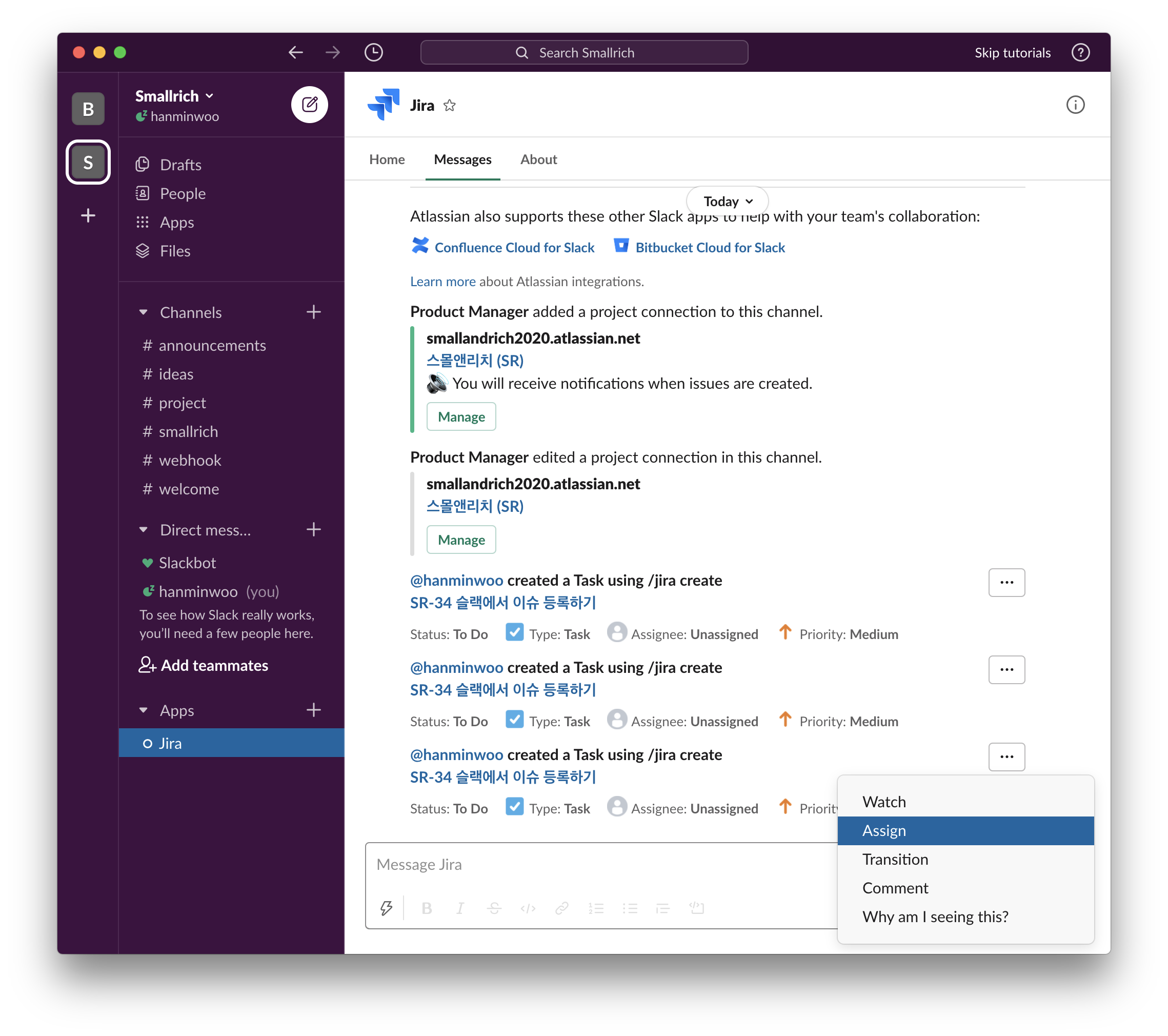 <(참고) webhook 작동 확인> 4. 슬랙(Slack)에서 지라(JIRA) 이슈 할당하기