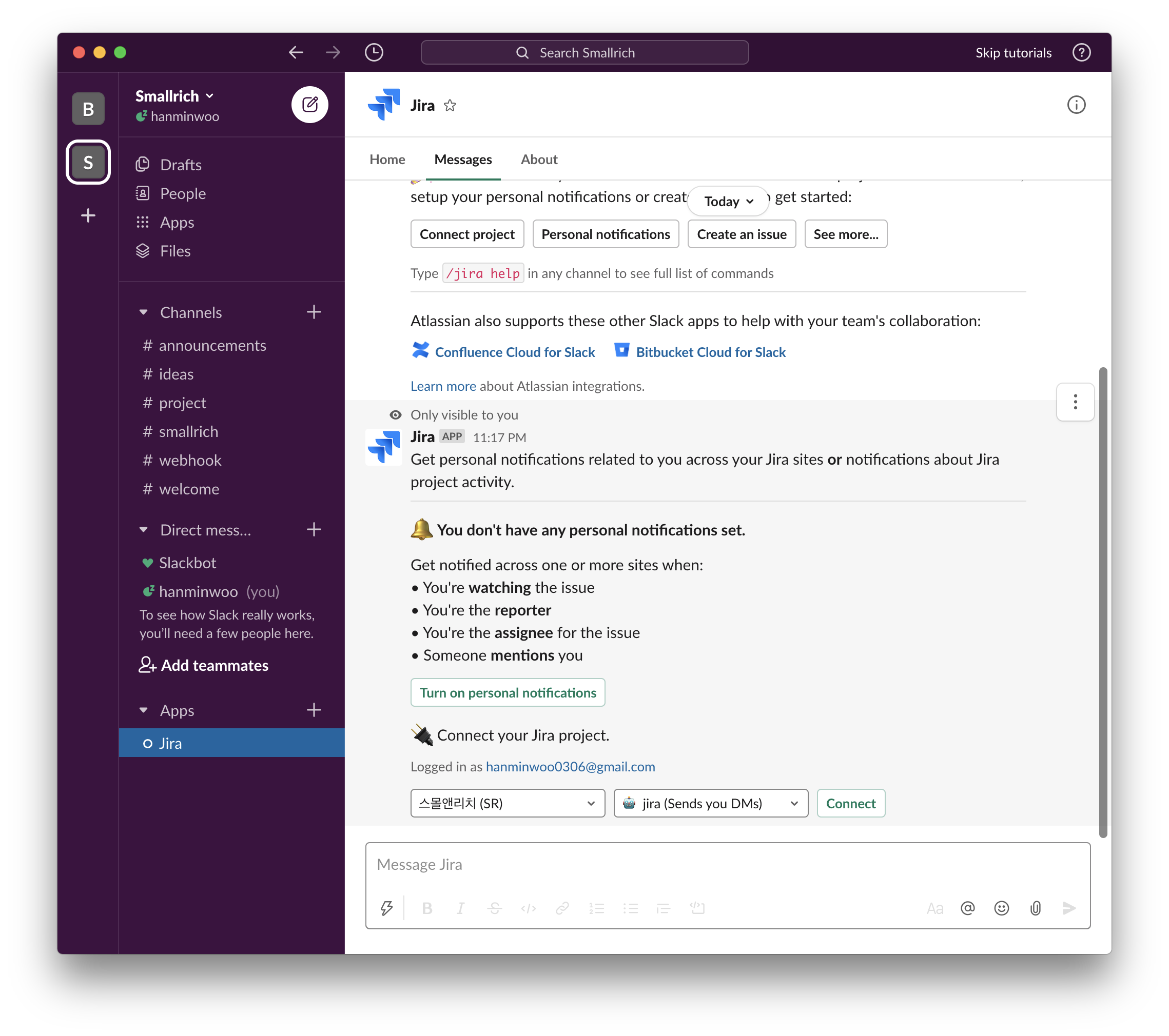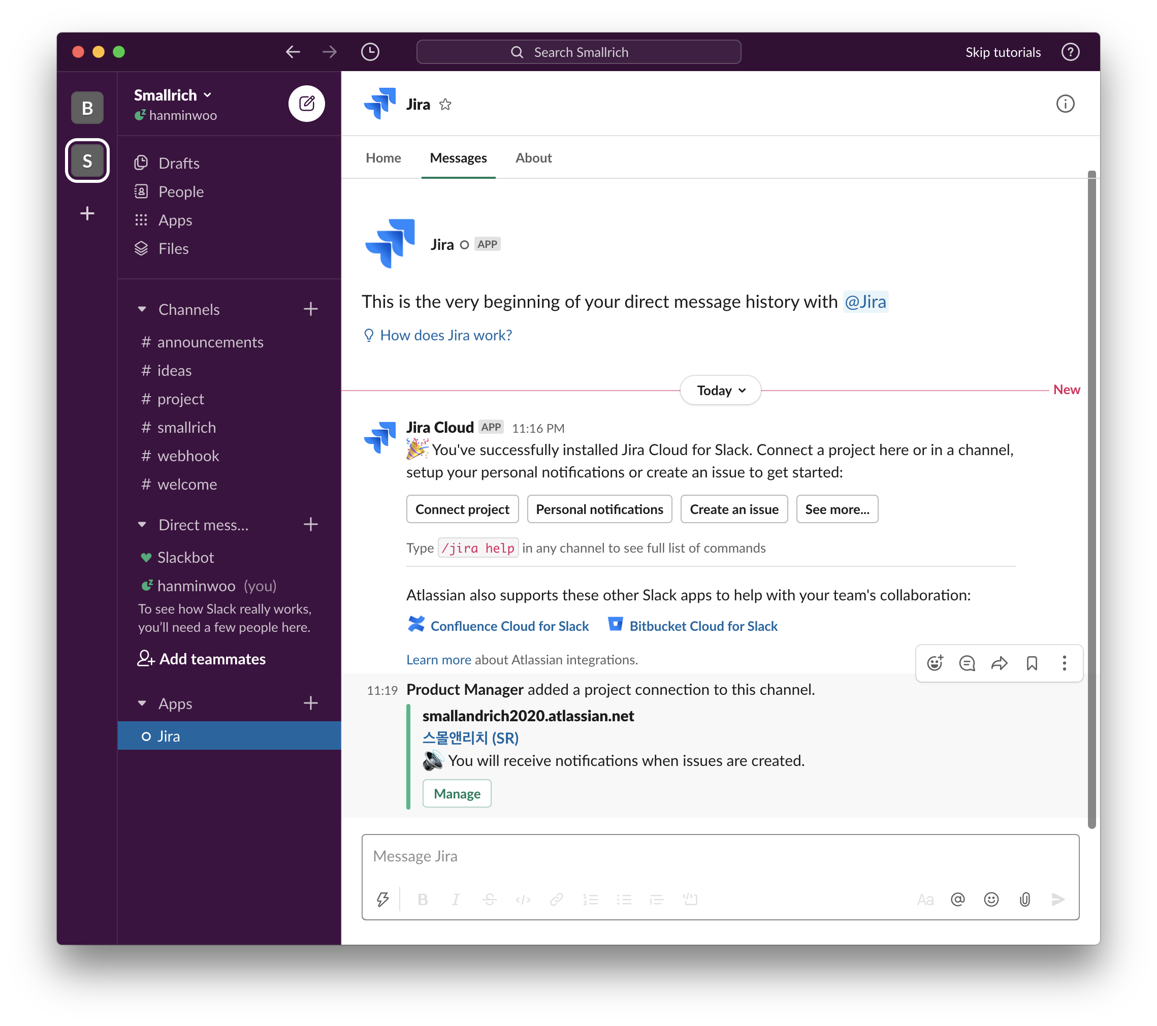 슬랙 메신저를 확인합니다. 그리고 "Connect project"를 클릭하여 JIRA Project를 연결합니다.