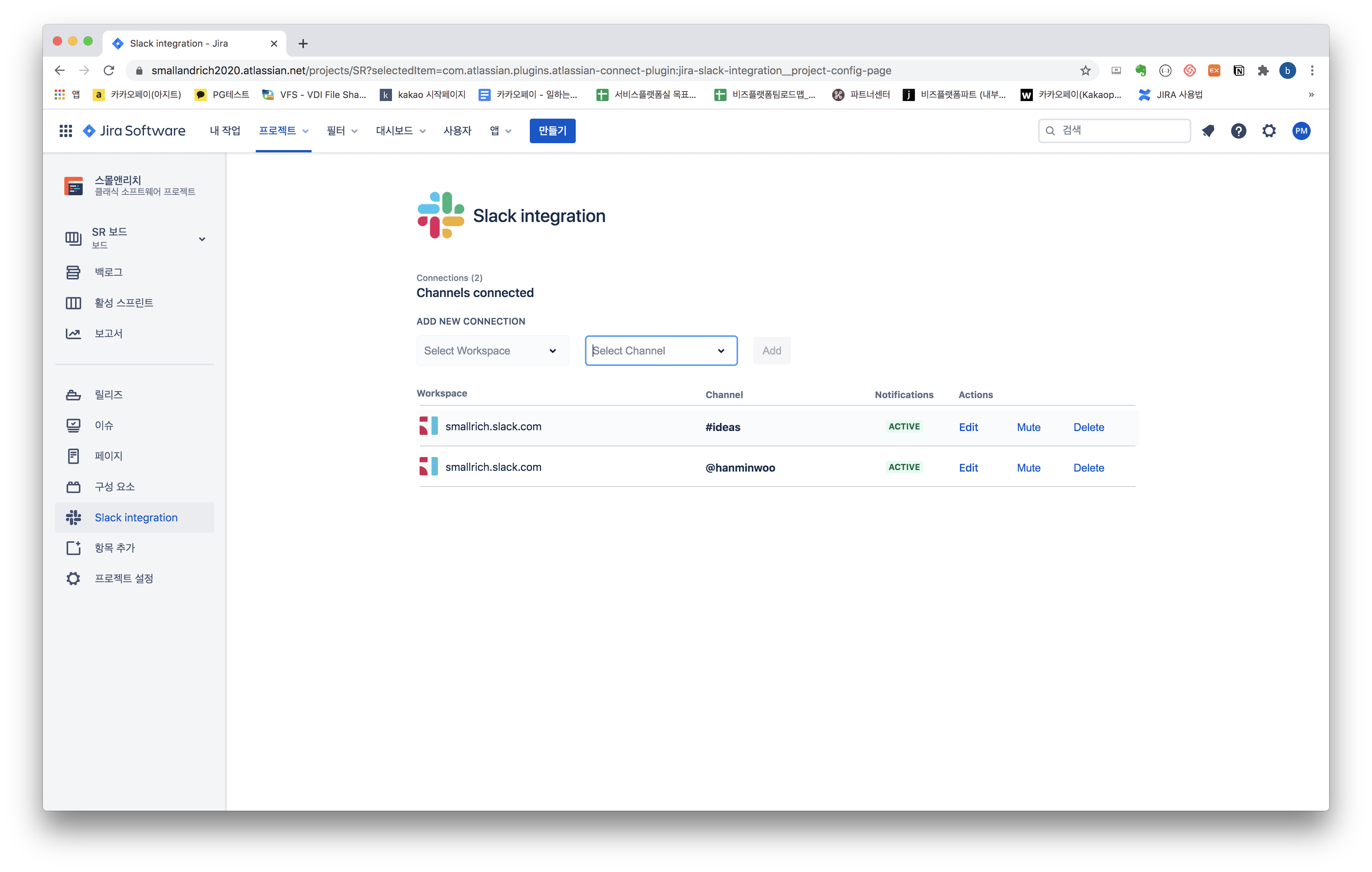 슬랙에서 "manage"를 클릭하면 지라(JIRA) 메뉴 중 Slack integration 메뉴를 클릭합니다. 이 곳에서 채널별 알림을 설정할 수 있습니다.