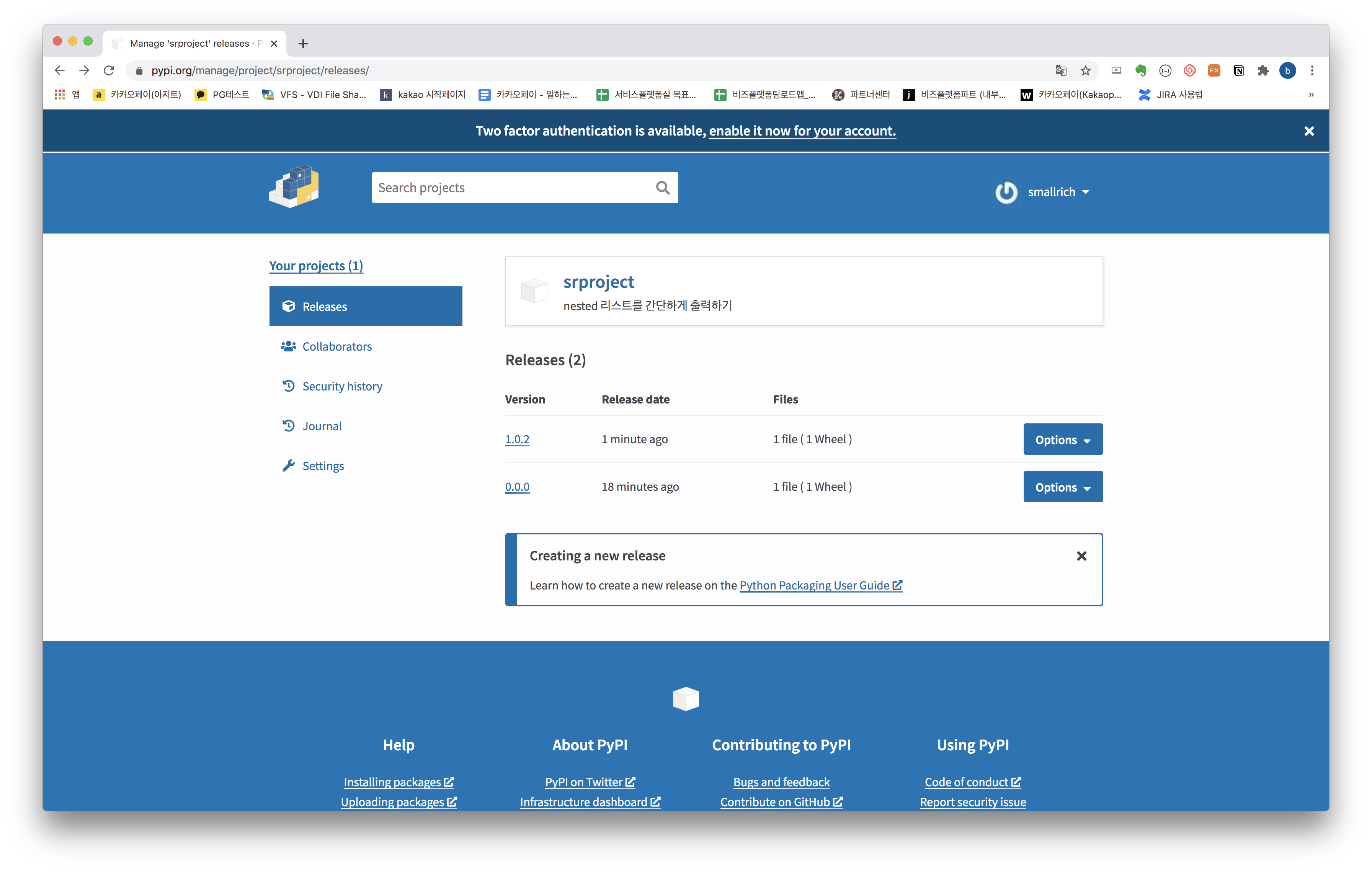 twine upload dist/배포파일명(실제 터미널) (base) bacchushanui-MacBook-Pro:Chapter02A bacchus.han$ twine upload dist/srproject-1.0.2-py3-none-any.whl Uploading distributions to [https://upload.pypi.org/legacy/](https://upload.pypi.org/legacy/) Enter your username: smallrich Enter your password: Uploading srproject-1.0.2-py3-none-any.whl 100%|██████████████████████████████████████████████████████████████████████████████████████████████████████████████████████████████████| 4.72k/4.72k [00:03<00:00, 1.59kB/s]6. 배포 확인