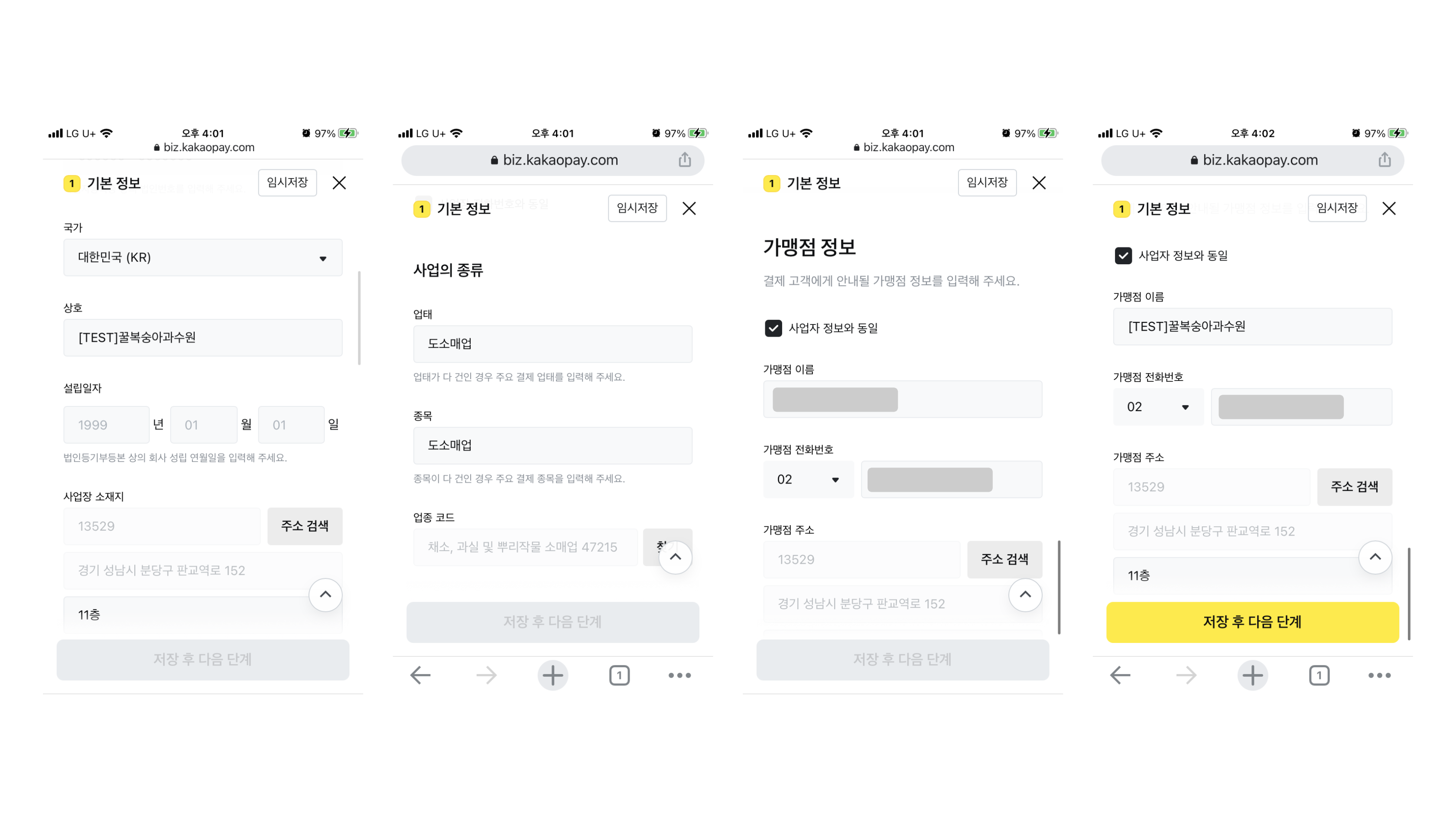 기본 정보 입력 > 가맹점 정보 입력 > 저장 후 다음 단계