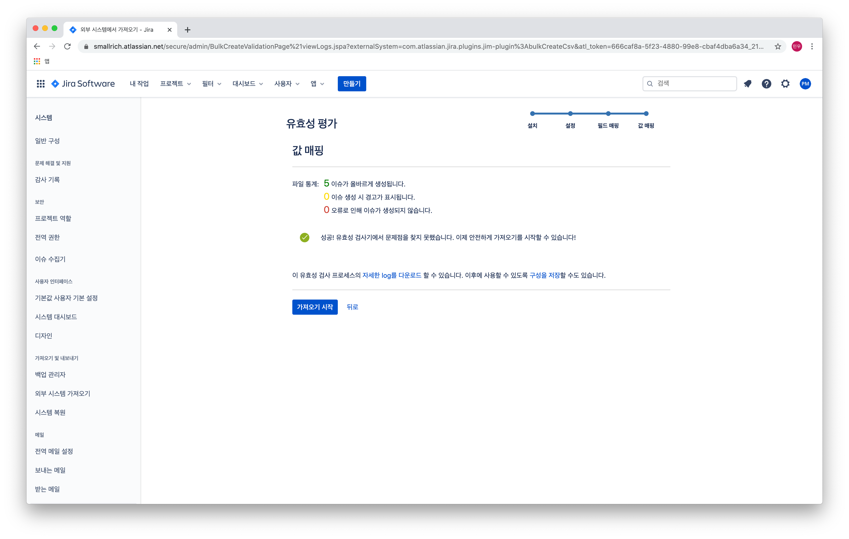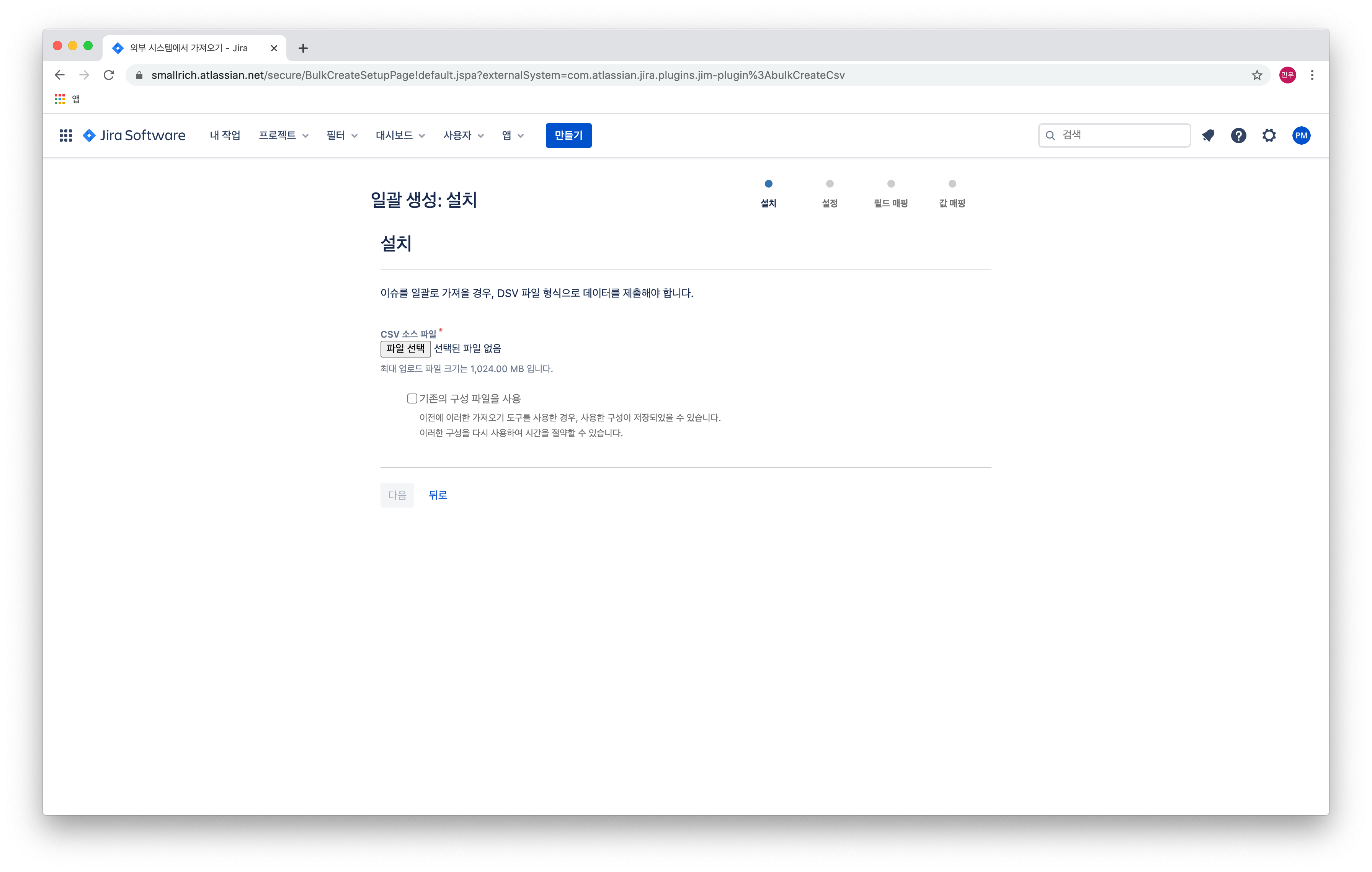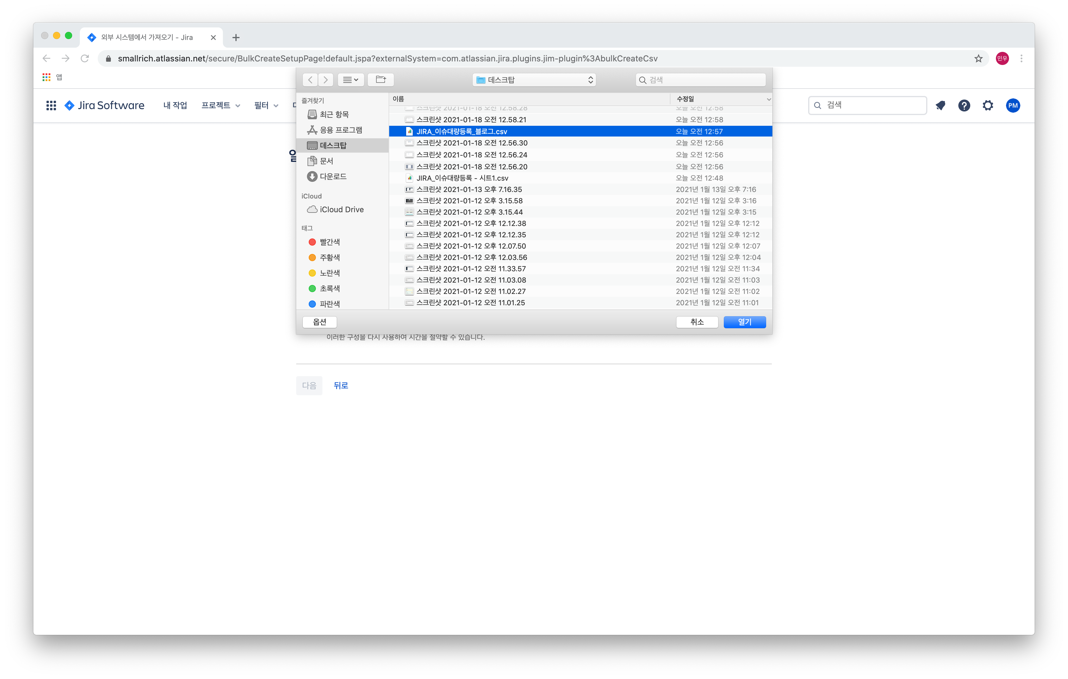 다시 지라로 돌아가서 생성한 CSV 파일을 선택하여 가져옵니다.