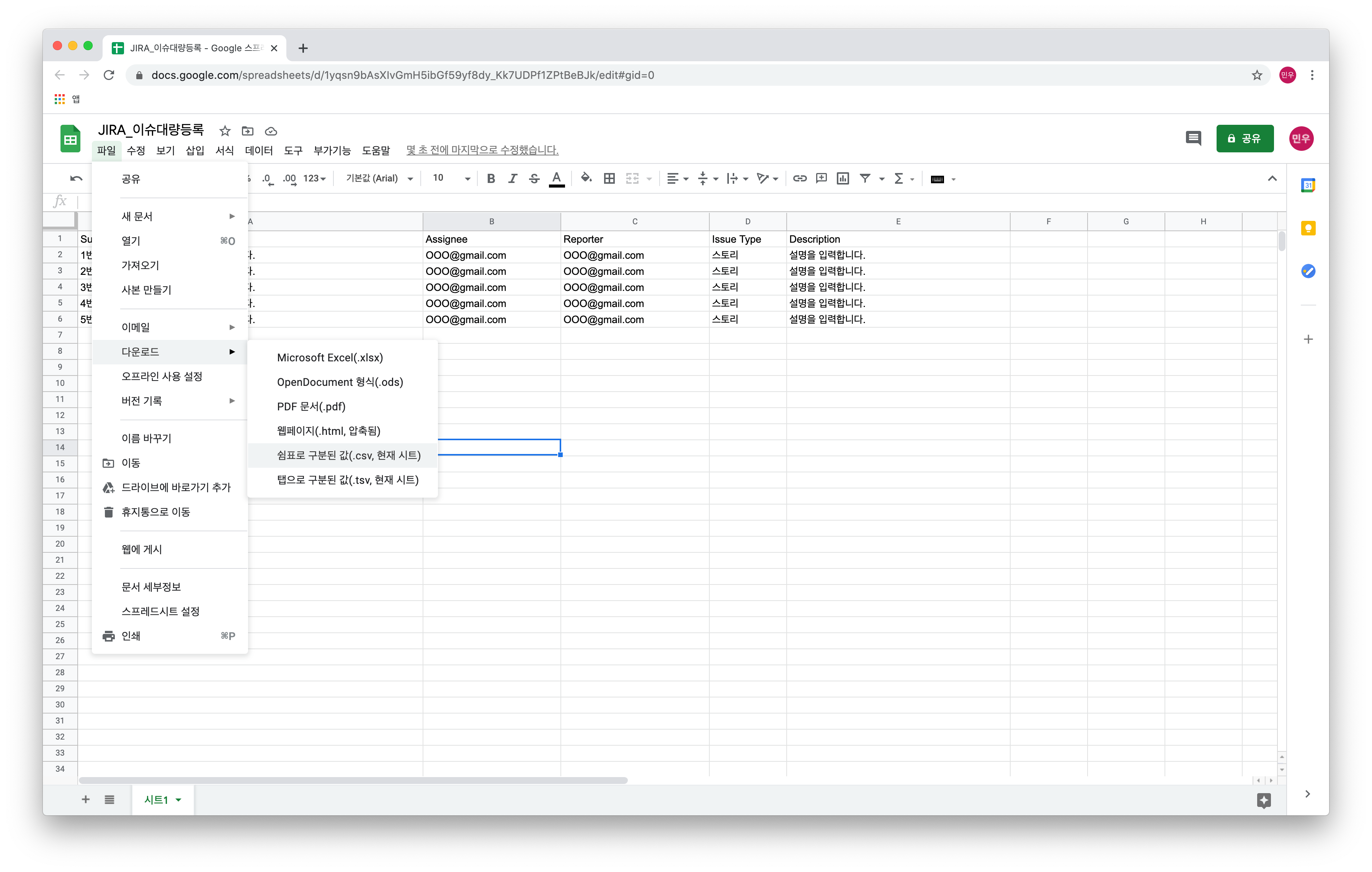 파일 -> 다운로드 > 쉼표로 구분한 값 (CSV, 현재시트)를 클릭하여 CSV 파일을 다운로드 합니다.