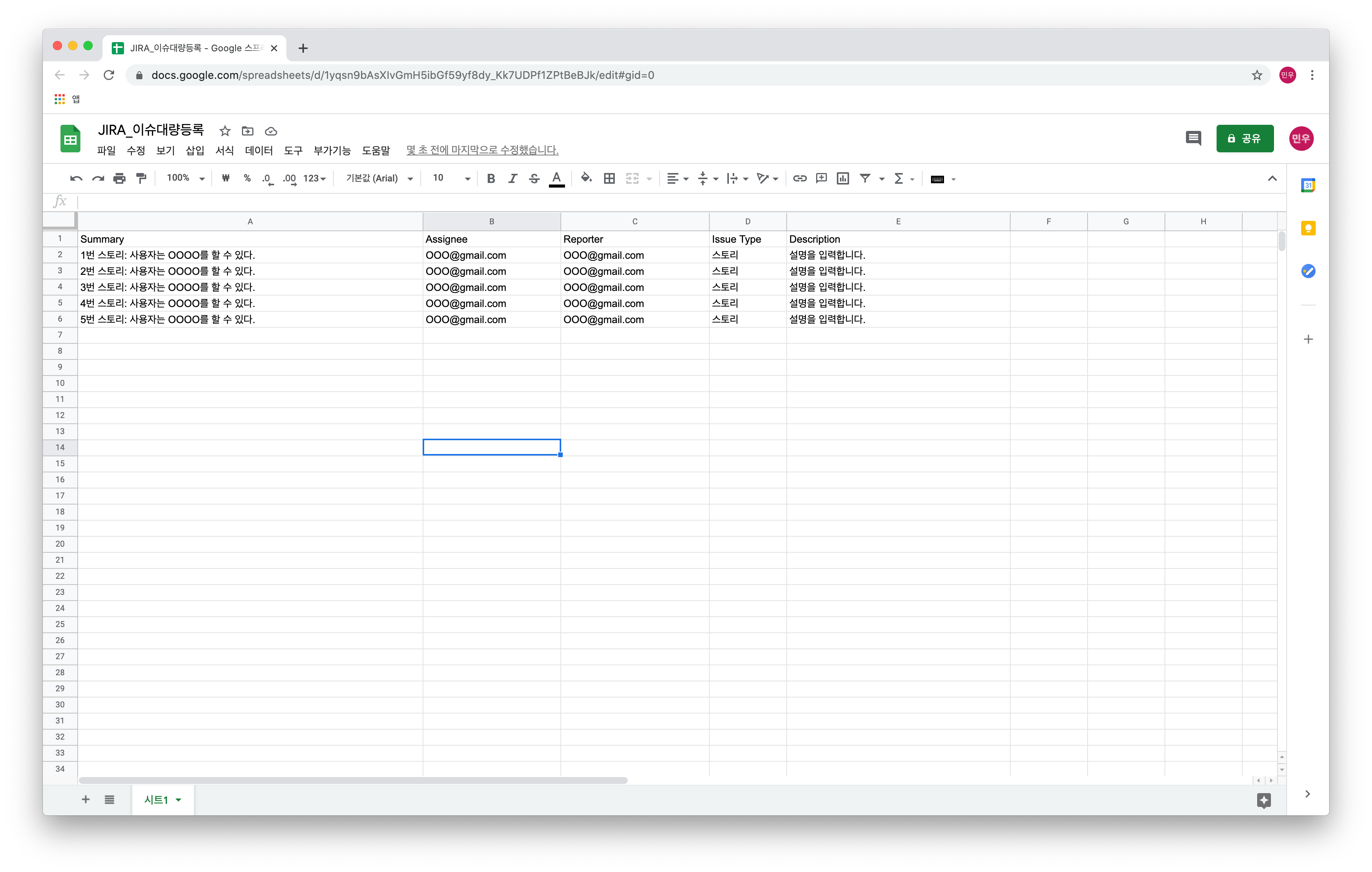 1열에 JIRA csv file 요구사항에 맞춰서 헤더를 작성합니다.The header row must contain a column for Summary data. <- JIRA에서는 "요약"이라는 이름인데 꼭 작성해주세요.