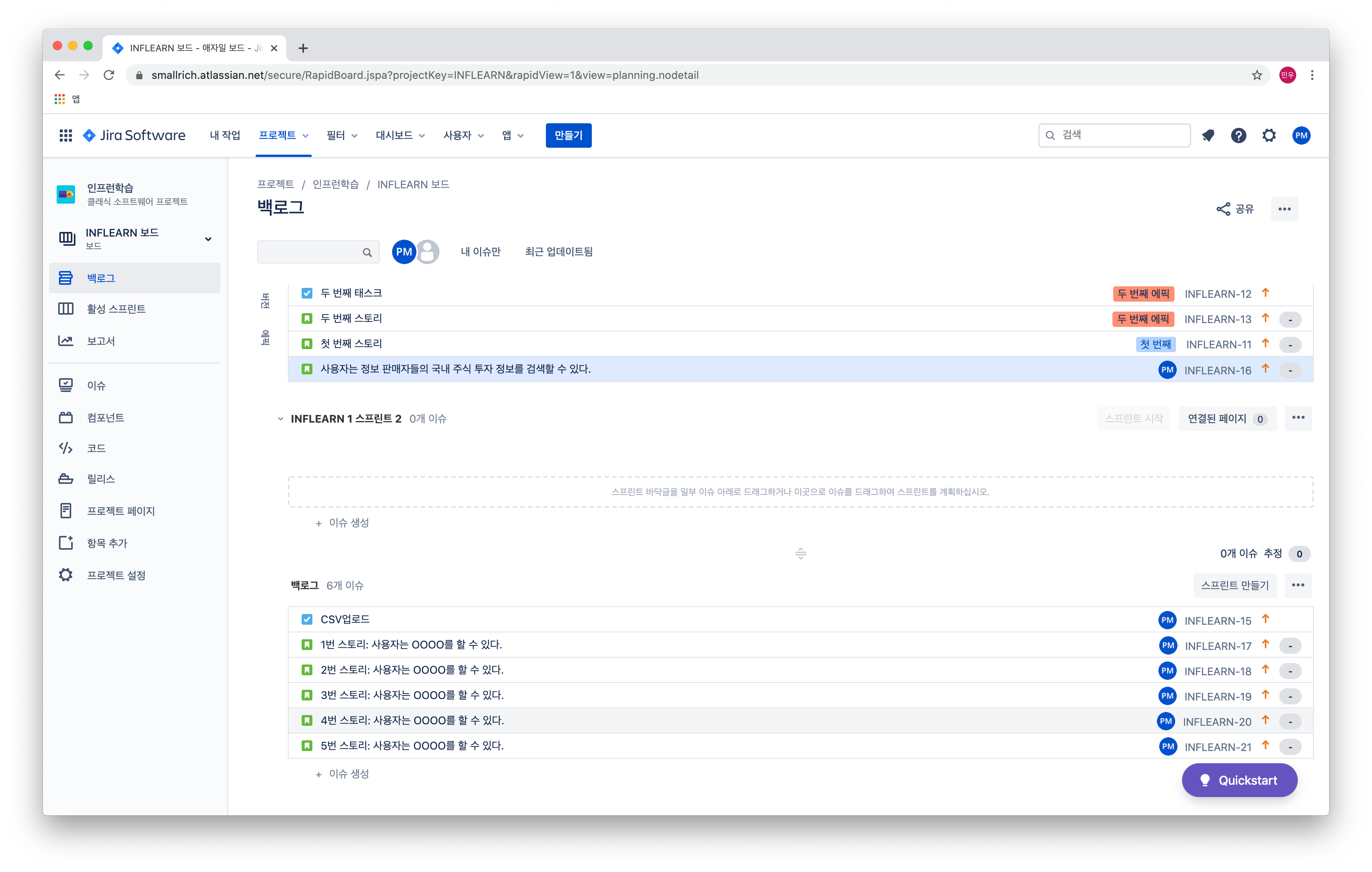 지라 백로그에 성공적으로 업로드된 5개의 이슈를 확인할 수 있습니다. 짝짝짝~!