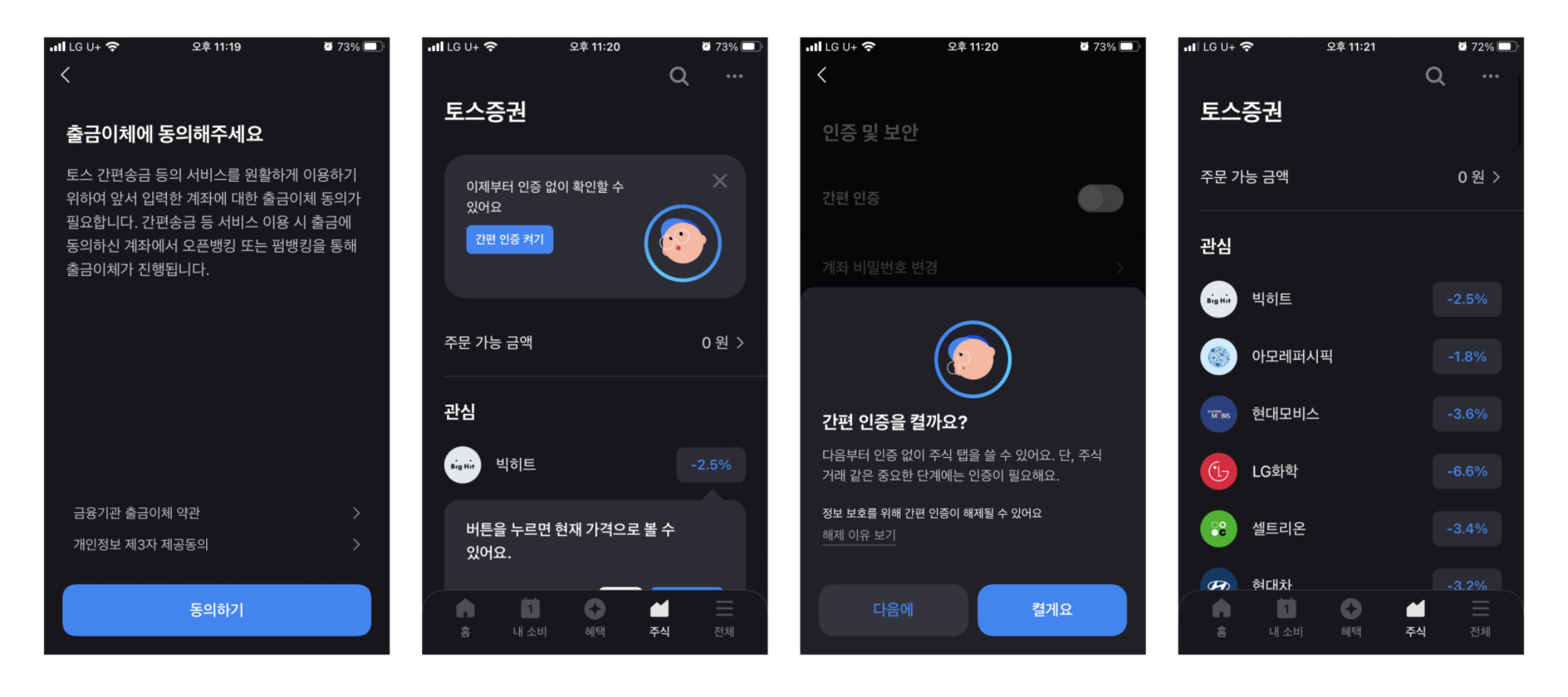 토스증권 계좌에 대한 출금 이체 동의 과정입니다. 그리고 빠른 로그인 절차를 위해서 간편하게 인증할 수 있는 방법을 제공해주네요. 사실 기존 증권앱은 공인(공동)인증서 로그인하고 계좌에 대한 비밀번호를 입력해야 잔액이 보이는데 이러한 과정을 제거한 것 같습니다.