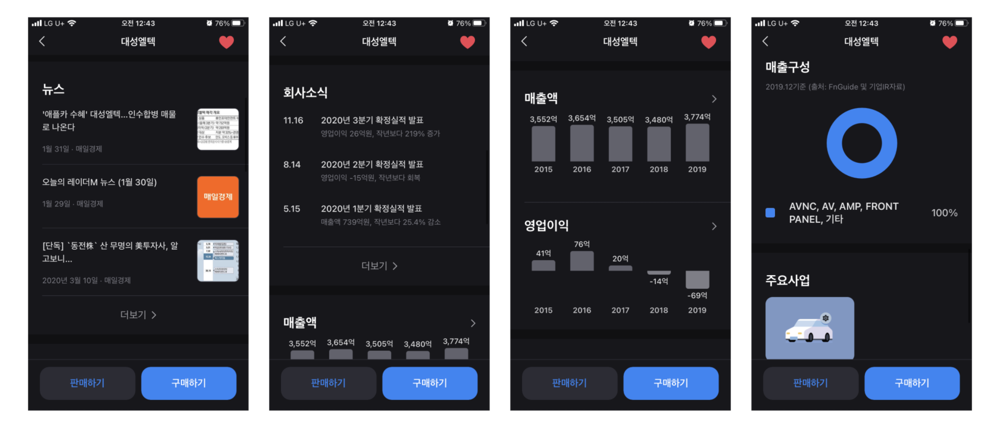 토스증권에서는 4가지 정보를 원 스크롤로 보여줍니다. 이 부분도 사실 기존 증권앱에서 다 제공하는 기능인데요. 참신하다고 느껴지는 이유는 원 스크롤로 바로 보여주기 때문이 아닐까 생각해요. 기존 증권앱은 몇 단계를 거쳐서 해당 정보에 접근하게 되다 보니까 거리감이 있었는데 (사실 투자 전에 항상 확인해야 하는 정보인데 ㅠㅠㅠ) 쉽게 접근할 수 있으니 이 회사가 지금 돈을 잘 벌고 있는지 잘 못 벌고 있는지를 일단 볼 수 있게 되네요. 진작에 했어야 하는 단계인데 이래서 제가... 투자를... 잘 못하는 것일 수도 ㅜㅜ