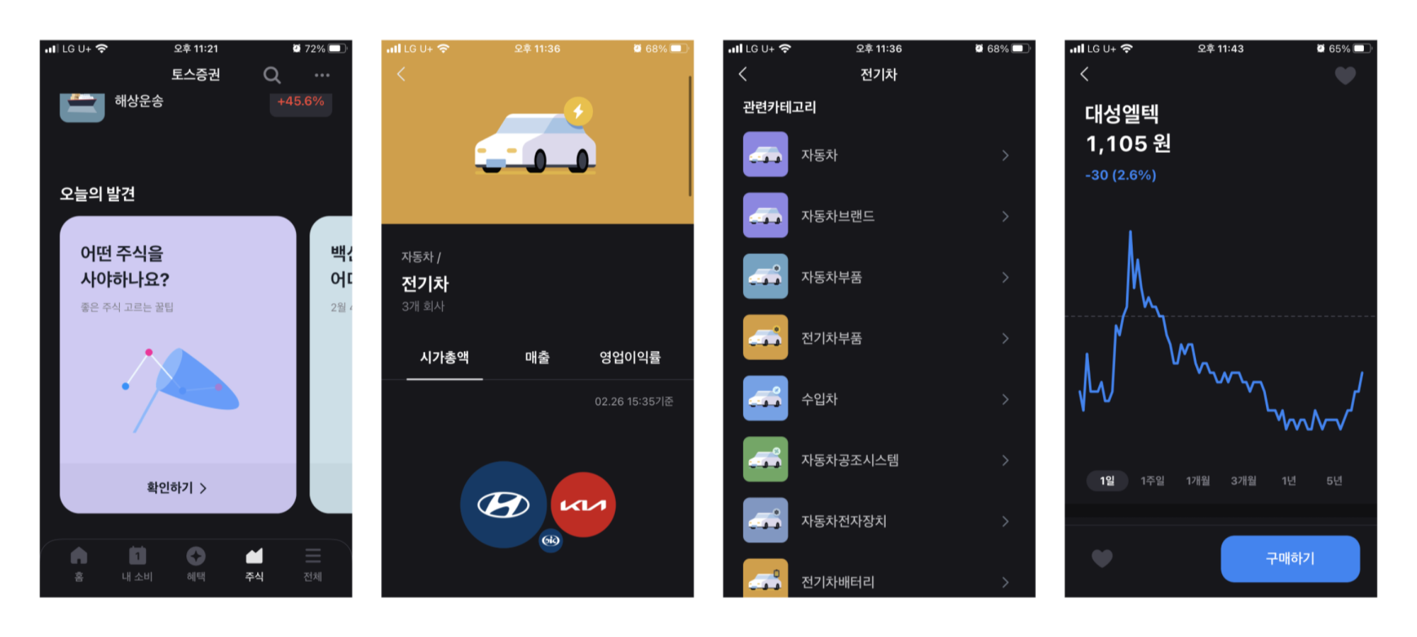 주식서비스에서 전기차 관련 주식을 살펴보았습니다. 기존 증권사 앱에서도 유사한 기능이 있는지 잘 모르겠는데요. 확실히 이러한 구분을 통해서 주식 정보를 발견하는 건 저한테는 좋은 느낌으로 다가옵니다. 해당 종목을 사든 안 사든 업계와 종목을 자연스럽게 연결해주는 느낌이라서요.